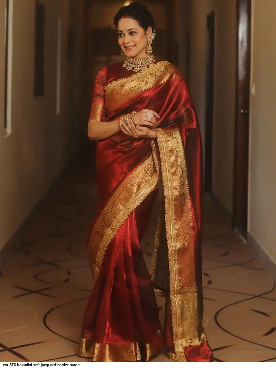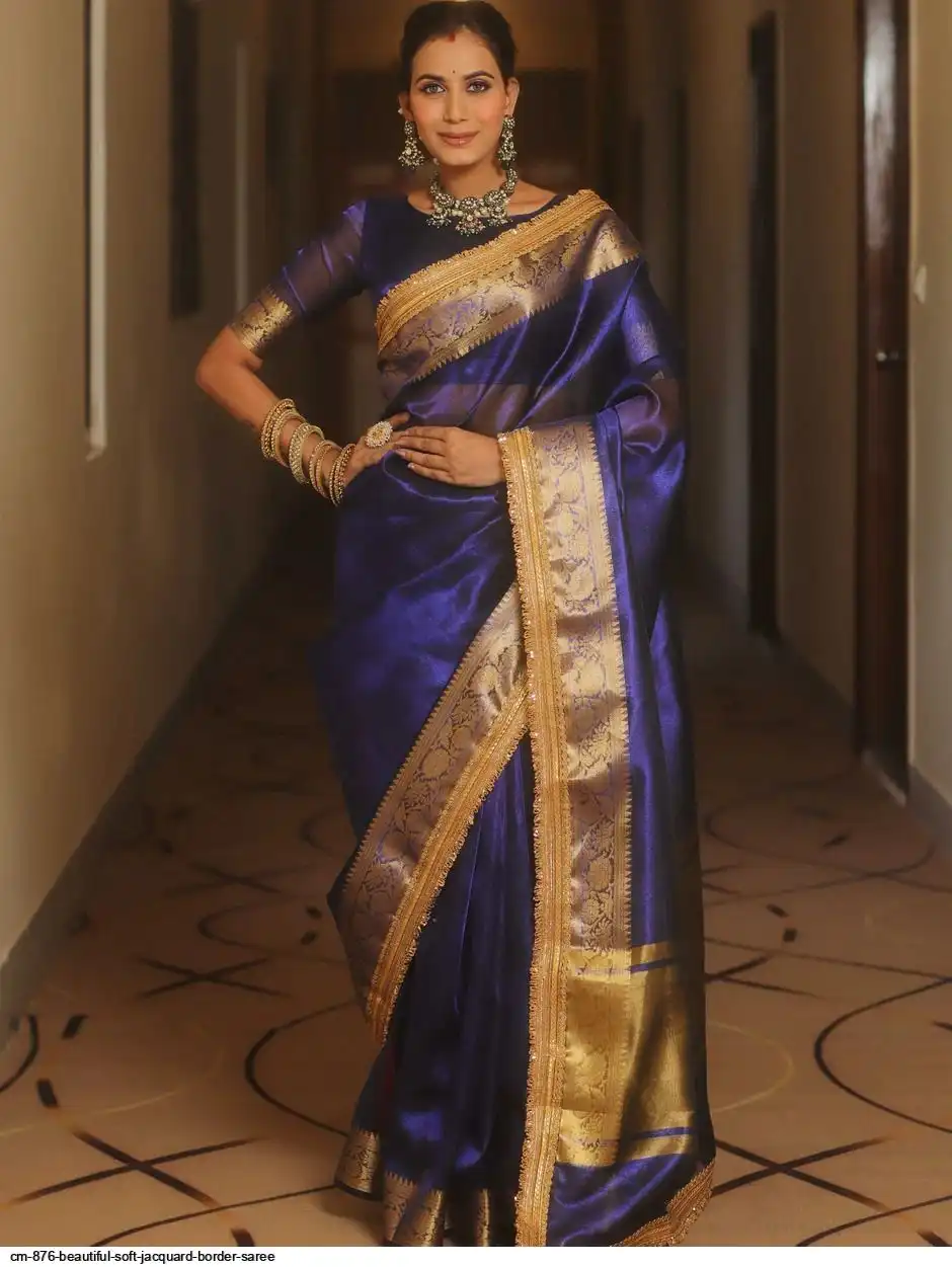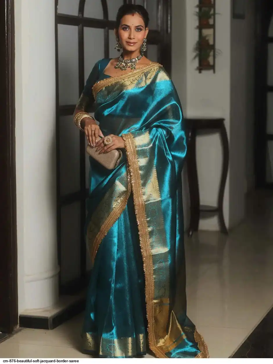 Beautiful soft Jacquard Border JIMI Silk Saree With Beautiful Shining color and pallu and attached running Blouse with lace