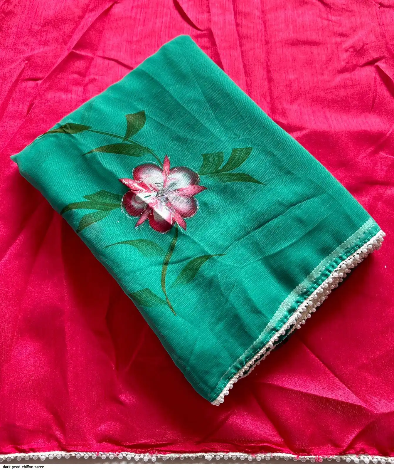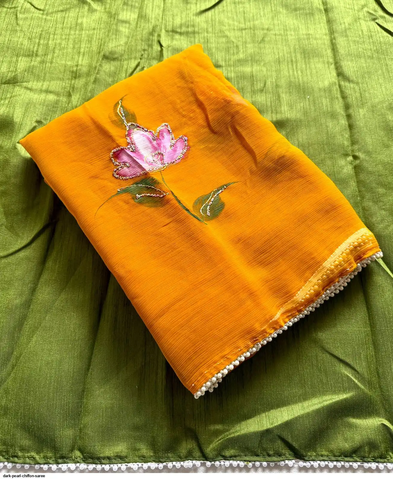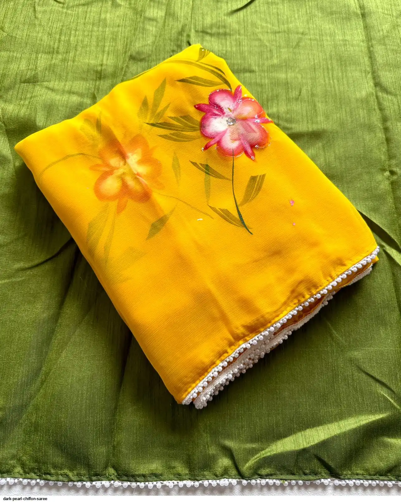 Fabric - Soft Chiffon Fabric With Beautiful Floral Handbrush Print With Golden Foil Touchup With White Pearl Lace And Contrast Art Silk Blouse