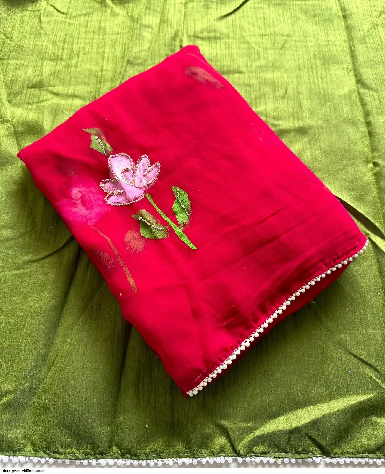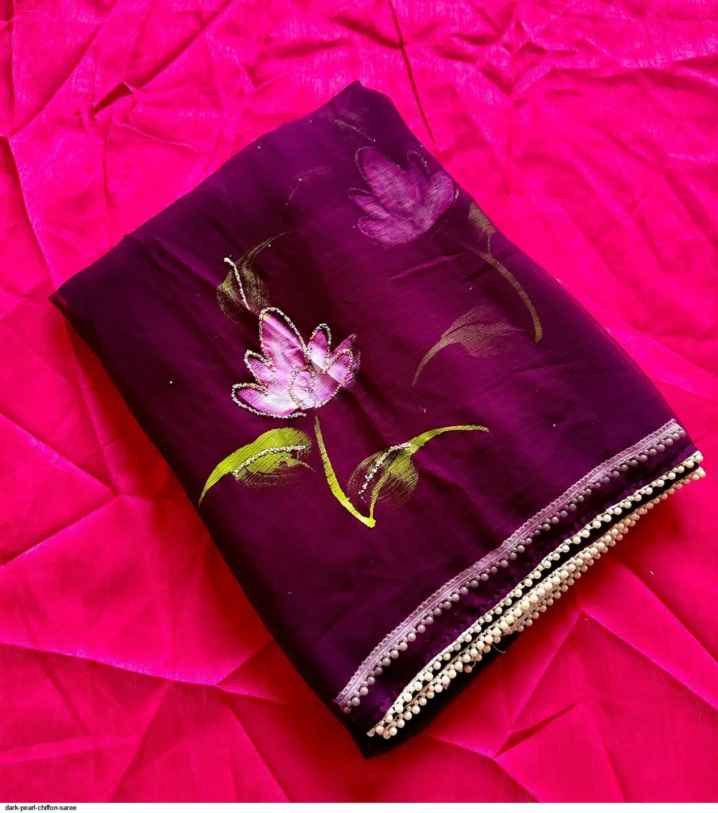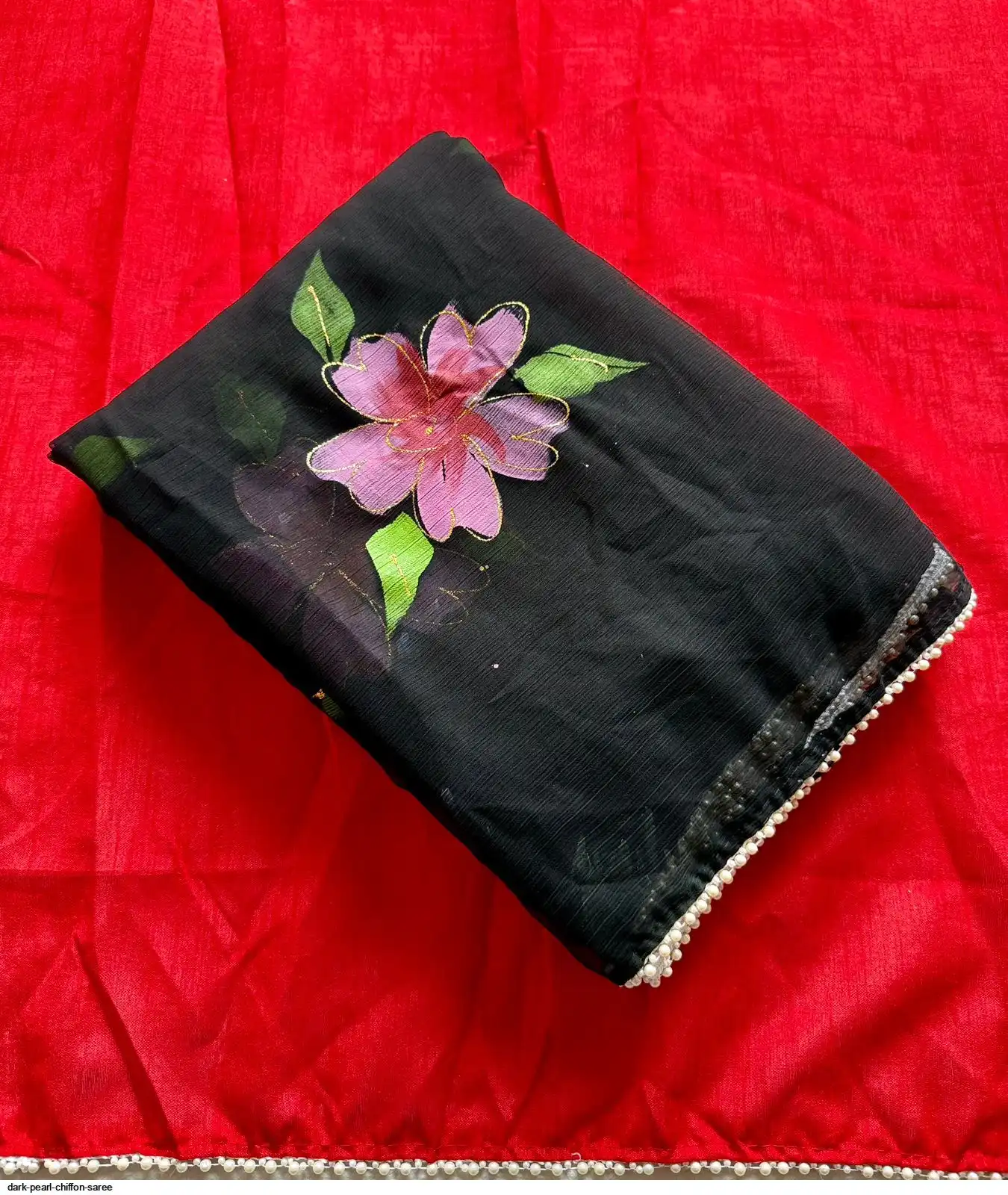 Fabric - Soft Chiffon Fabric With Beautiful Floral Handbrush Print With Golden Foil Touchup With White Pearl Lace And Contrast Art Silk Blouse