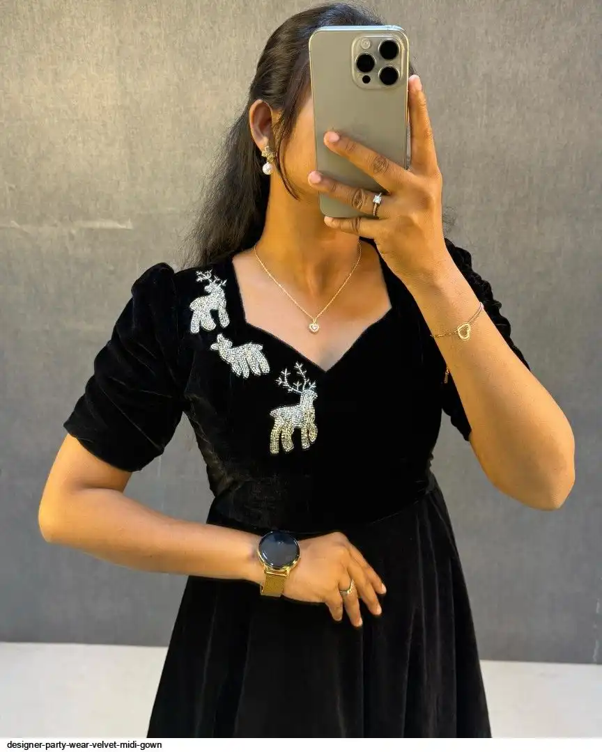 Designed to make you feel like a Queen .this designer party wear make premium Quality Dual tone 9000 velvet with maggam (Aari )work reindeer .