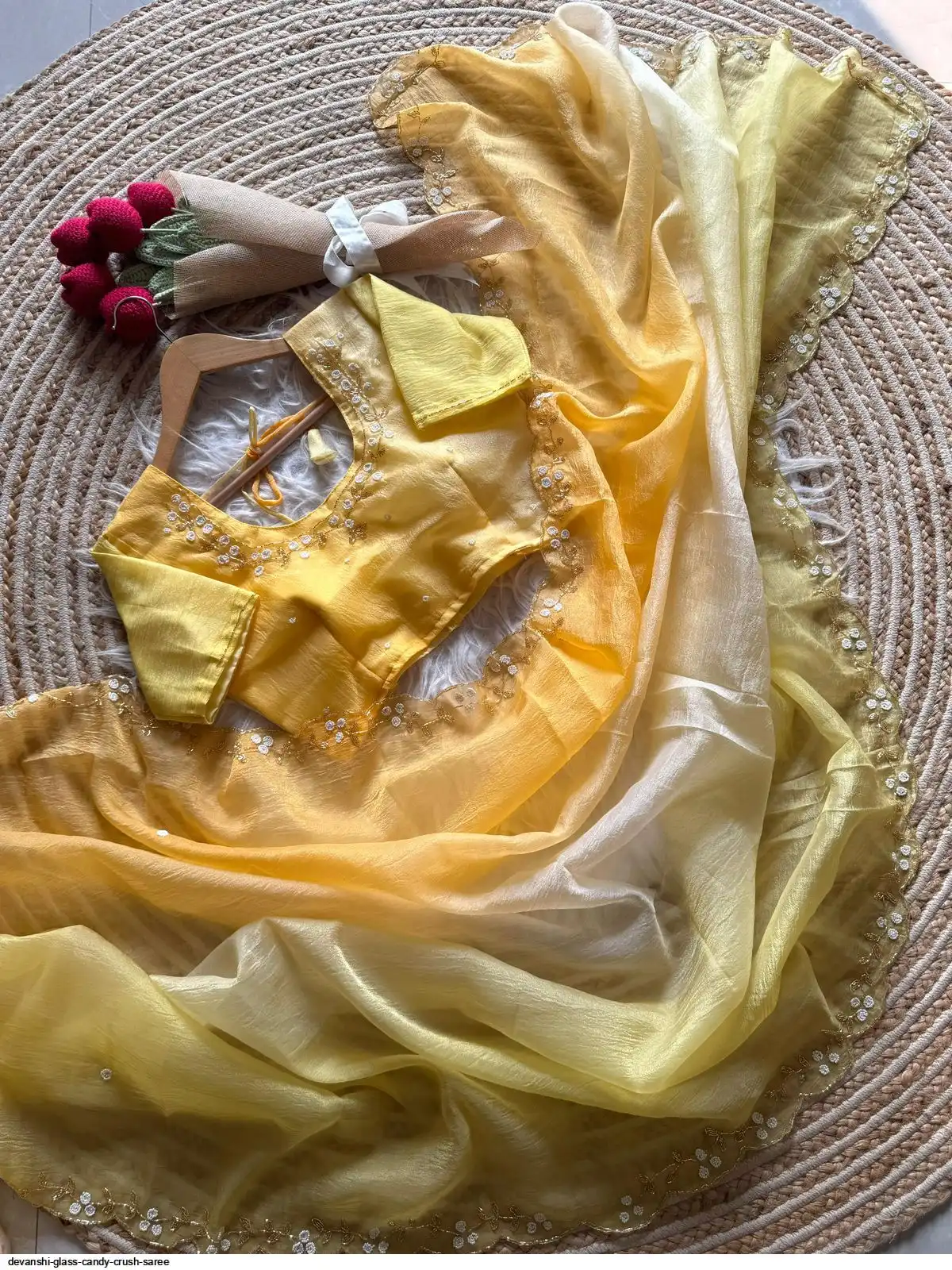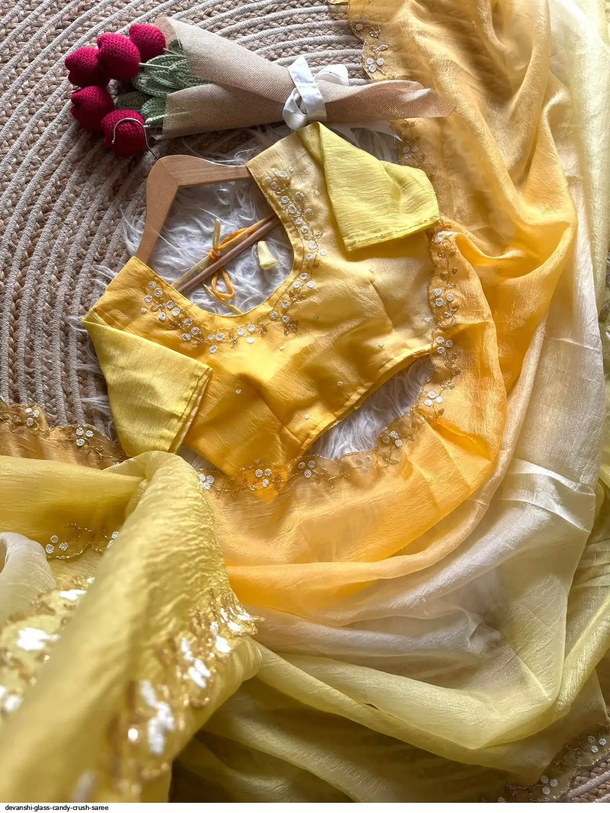 Saree :- Primium Glass Candy Crush Tissue padding Saree Silk With fully handwork Cutt Dana And Moti Flowers Handwork Border