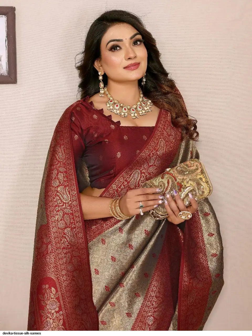 Besides being trending, this pretty sarees features spaced out zari details all over the body, making its wearable, beautiful & functional