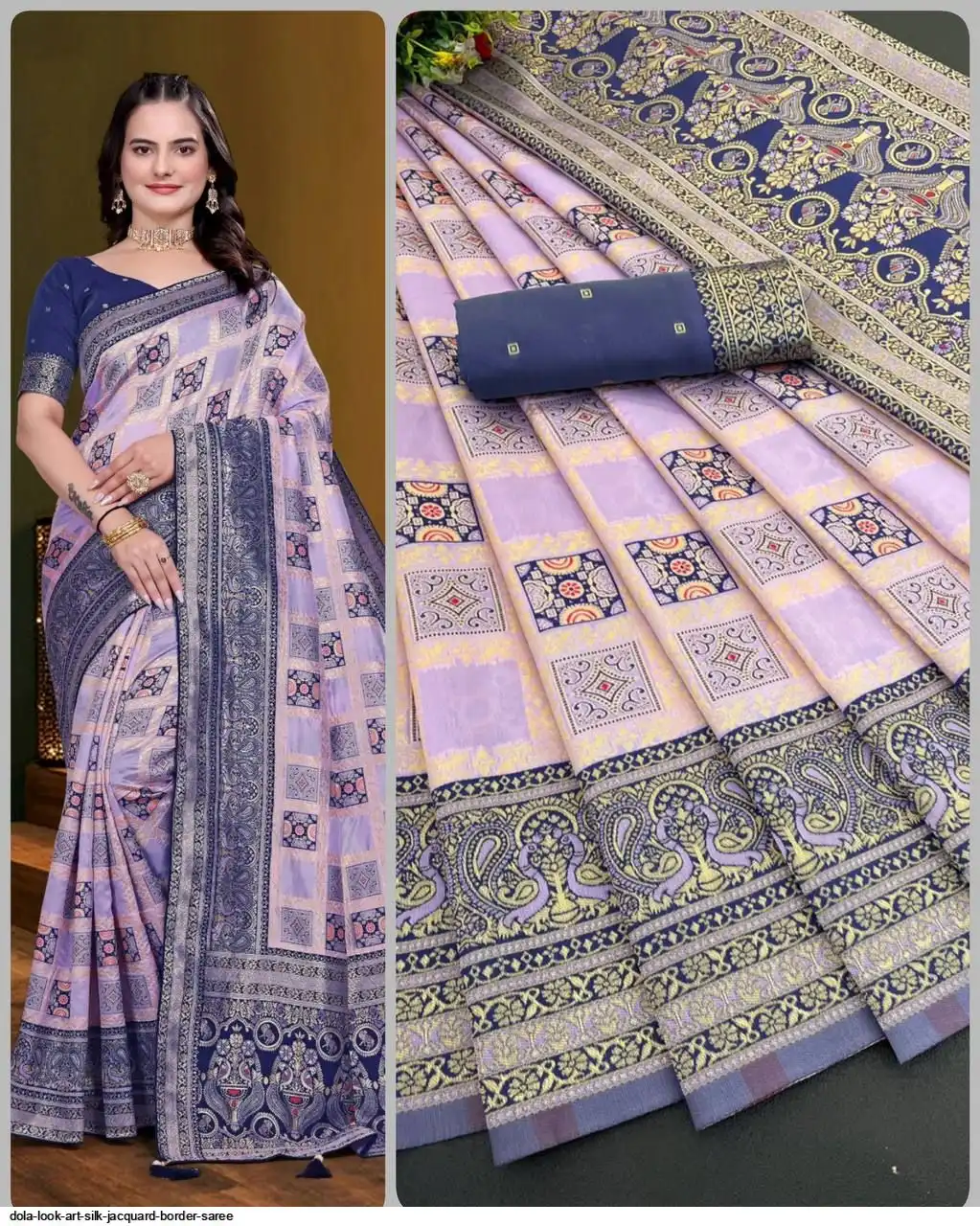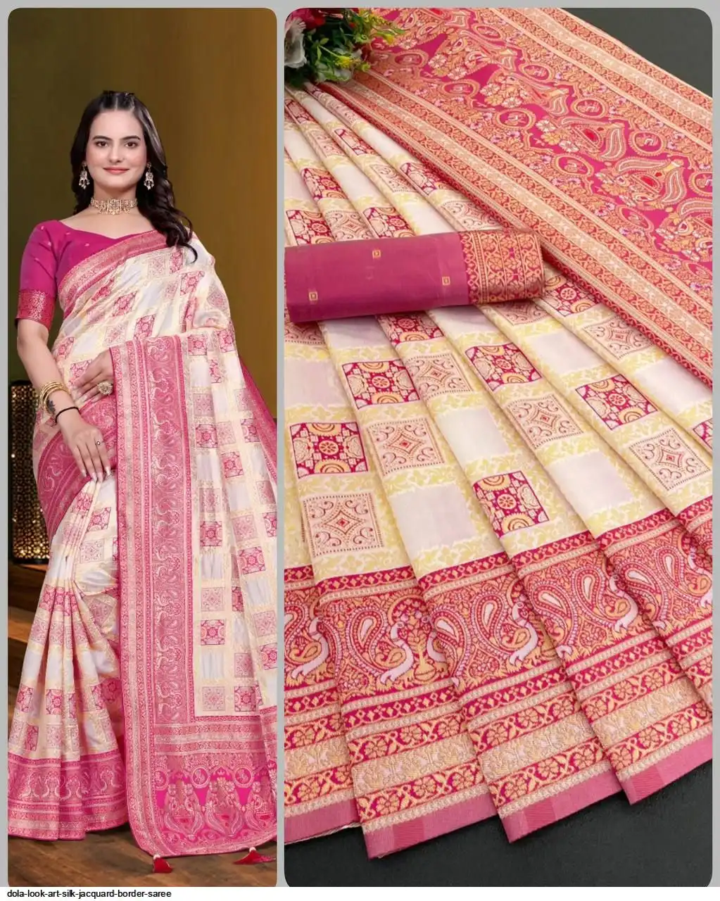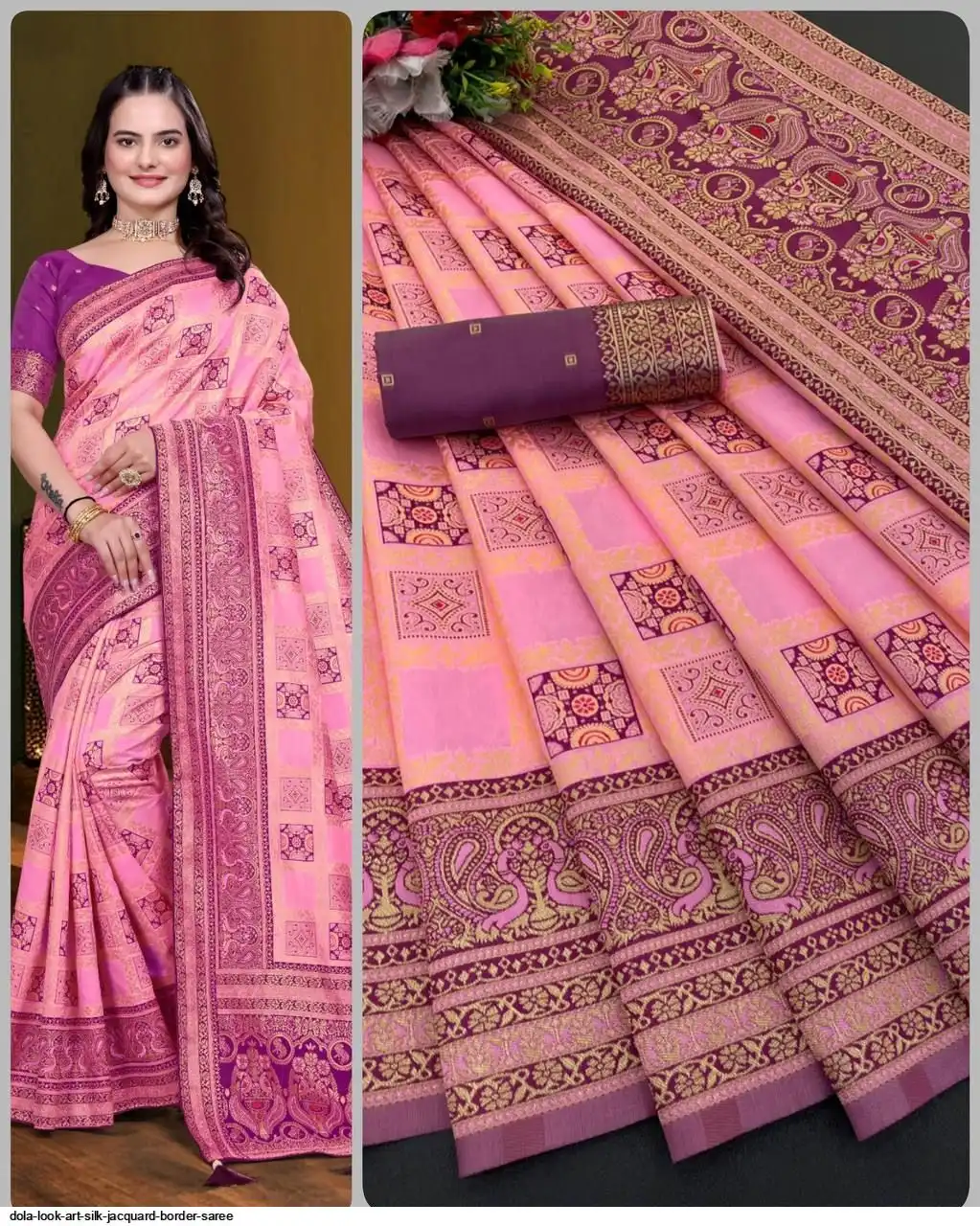 *Beautiful Art Silk Jacquard Border Saree With Unstitched Running Blouse For Women Wedding Wear Party*