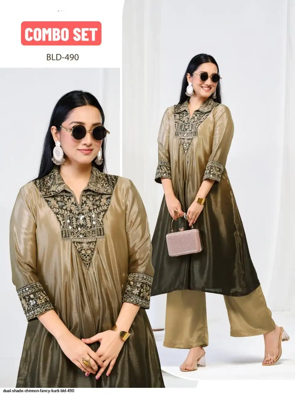 Top: Beautifully crafted dual-shade Chinnon with exquisite embroidery, handwork, and mirror detailing that adds a designer charm.
