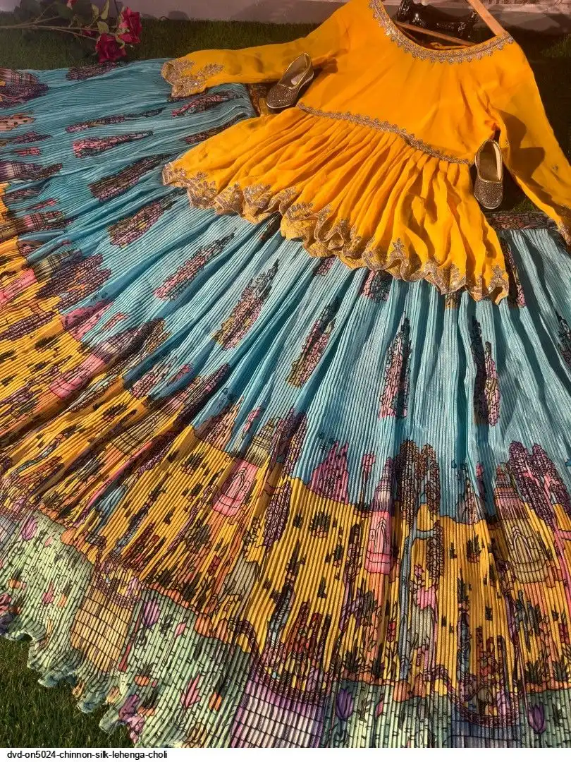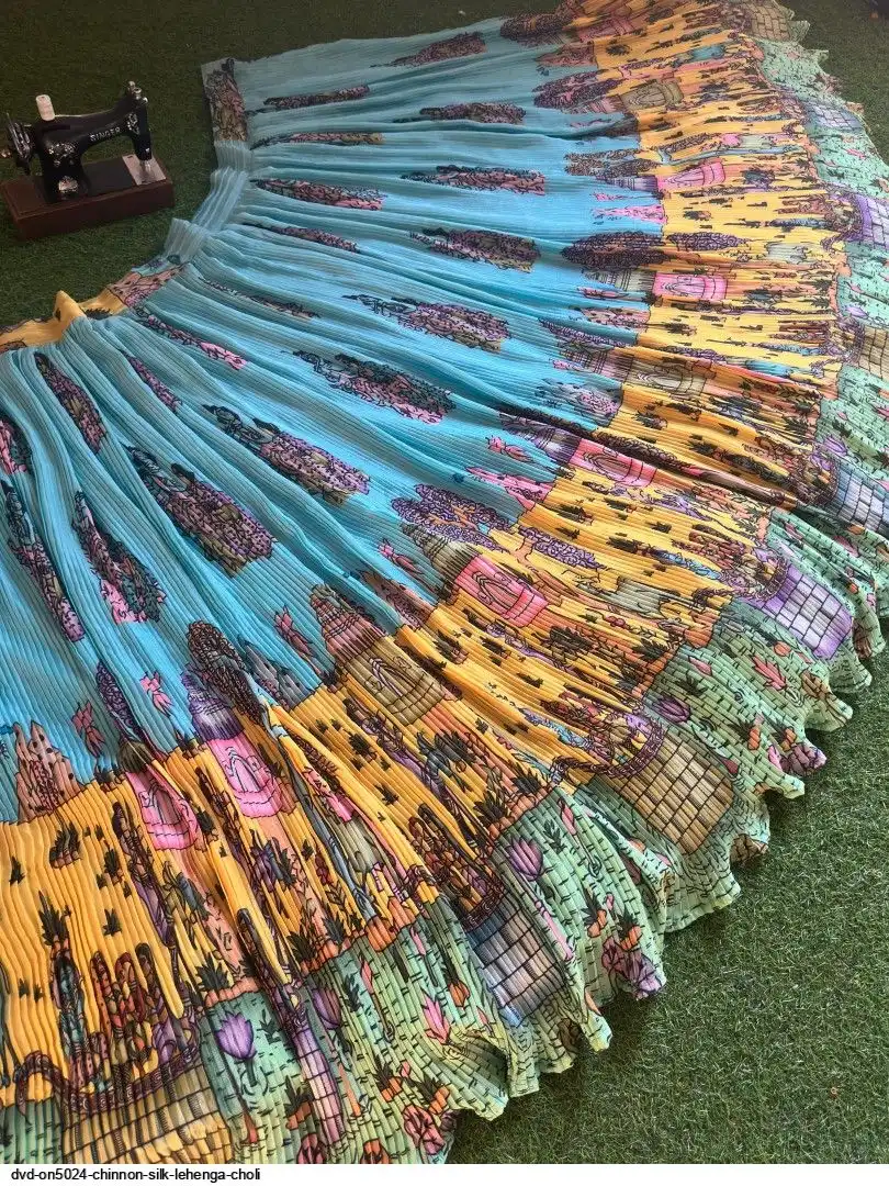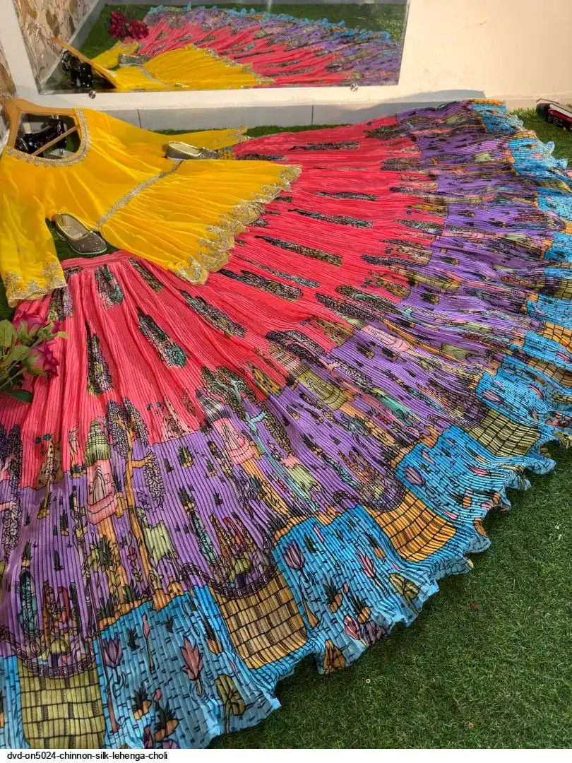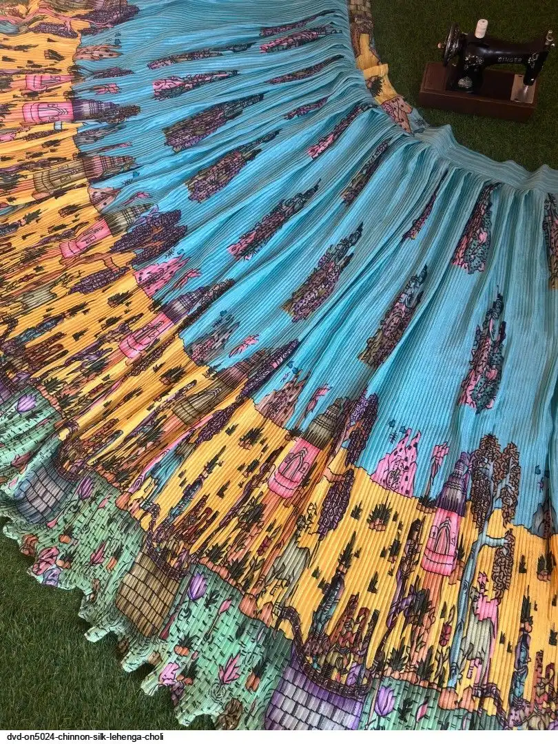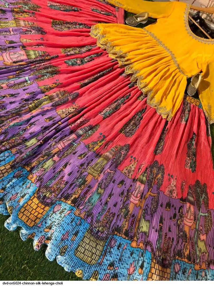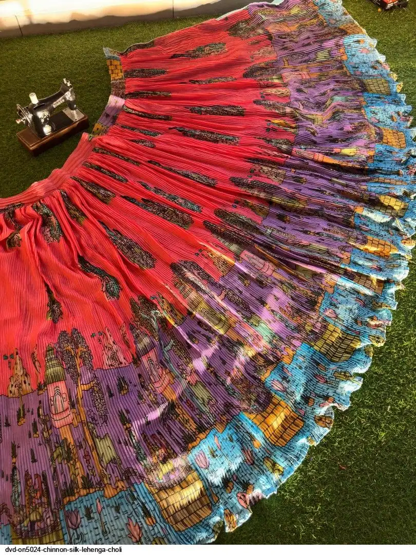 LEHNGA:CHINNON SILK WITH DIGITAL PRINT AND CREASE PATTERN DESIGN