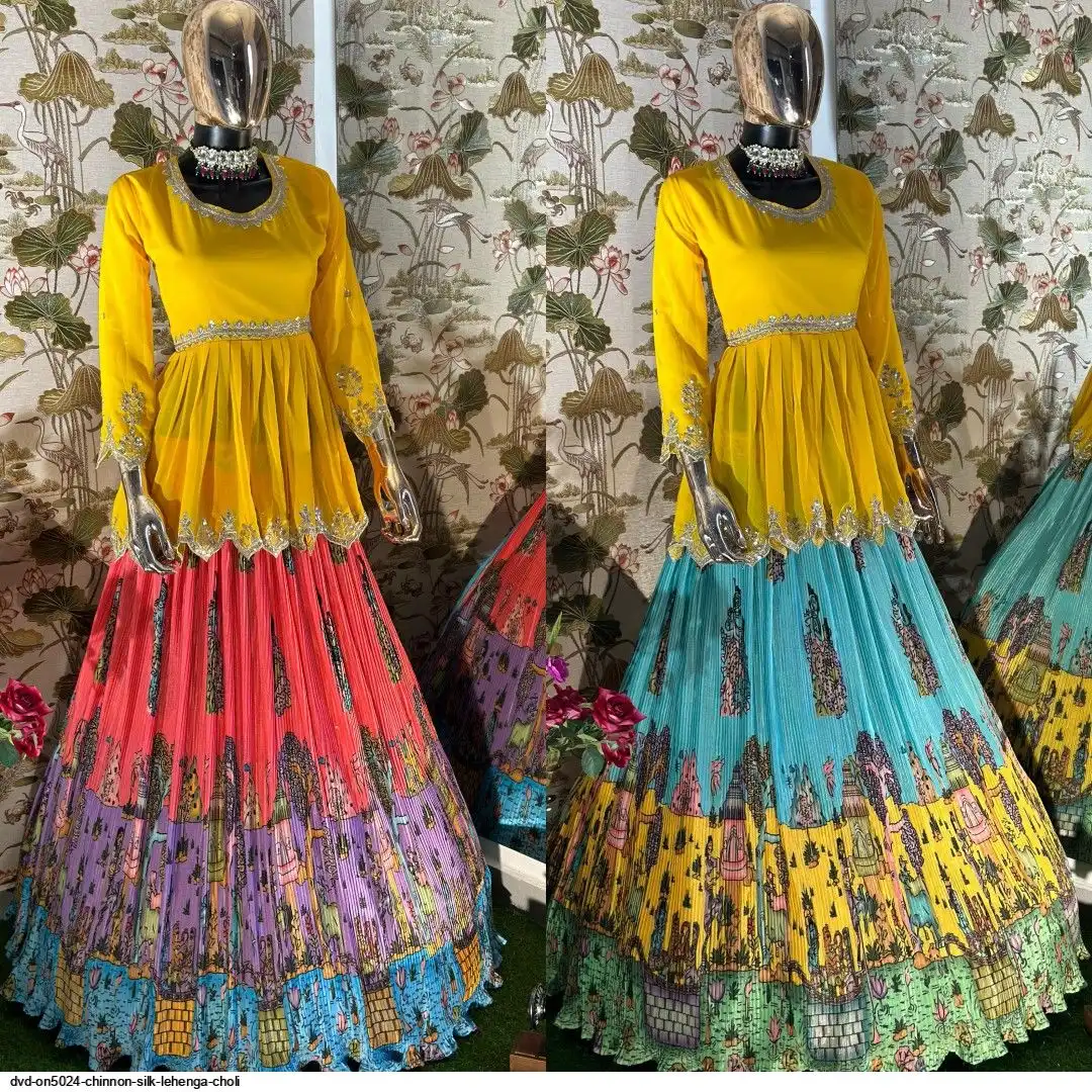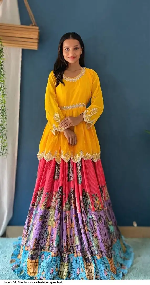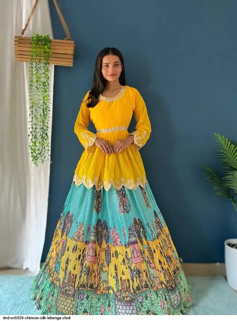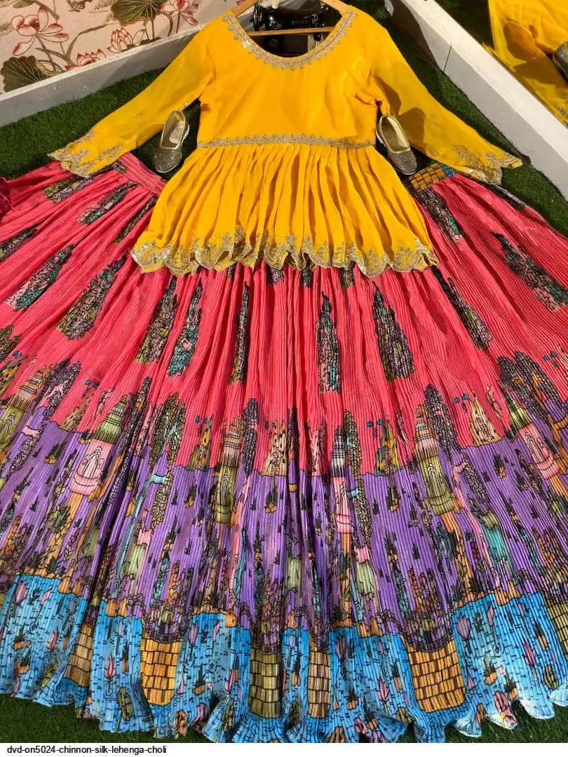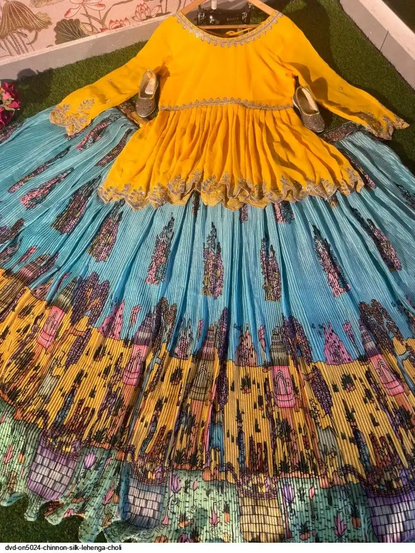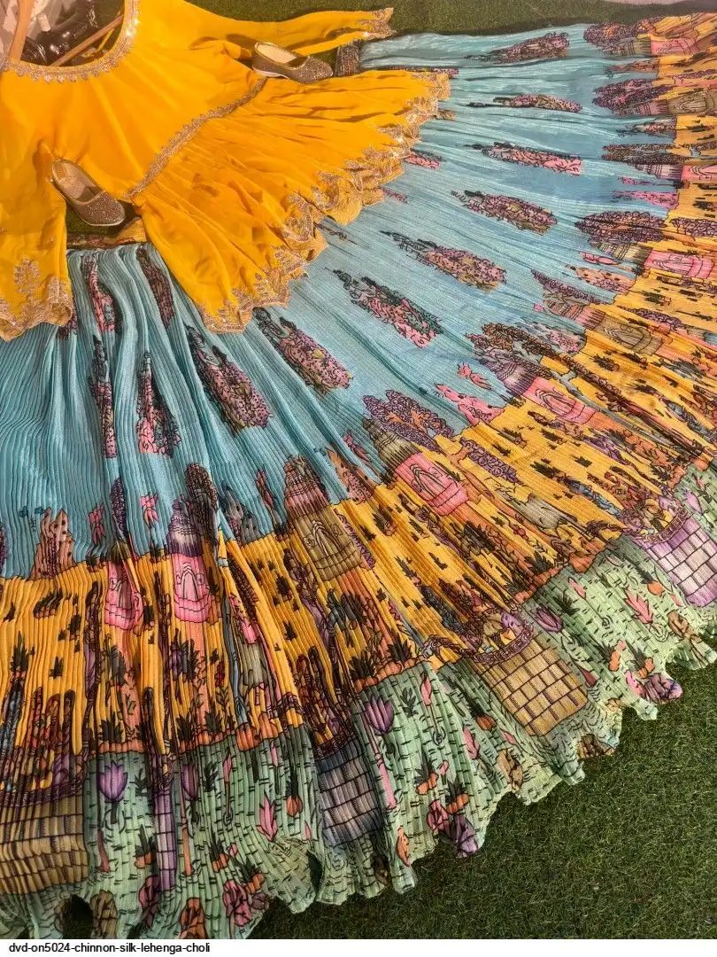LEHNGA:CHINNON SILK WITH DIGITAL PRINT AND CREASE PATTERN DESIGN