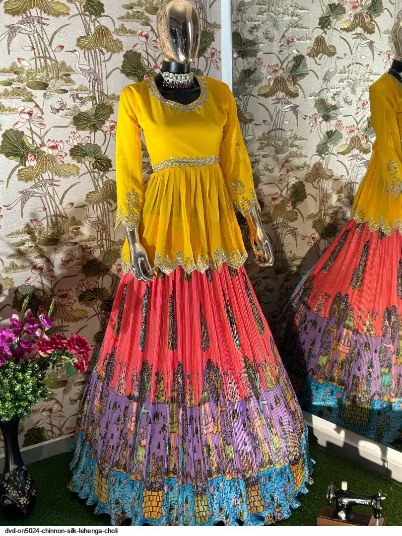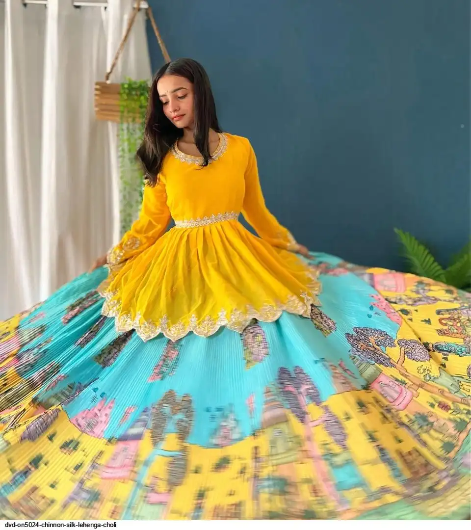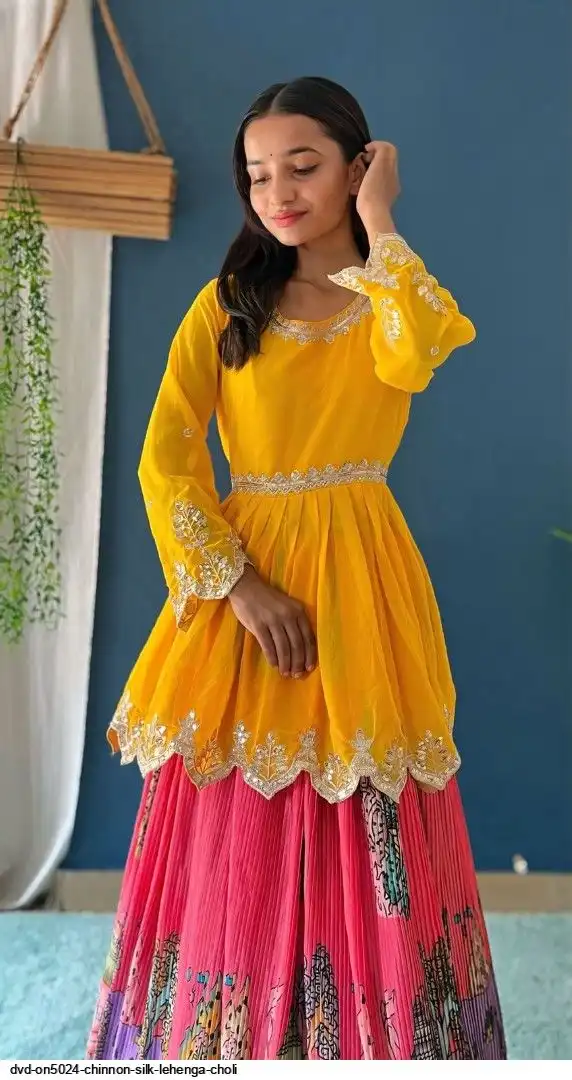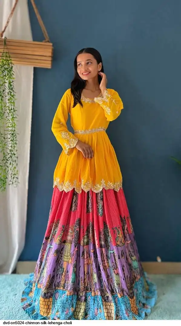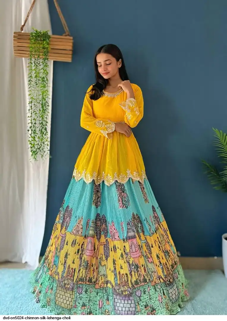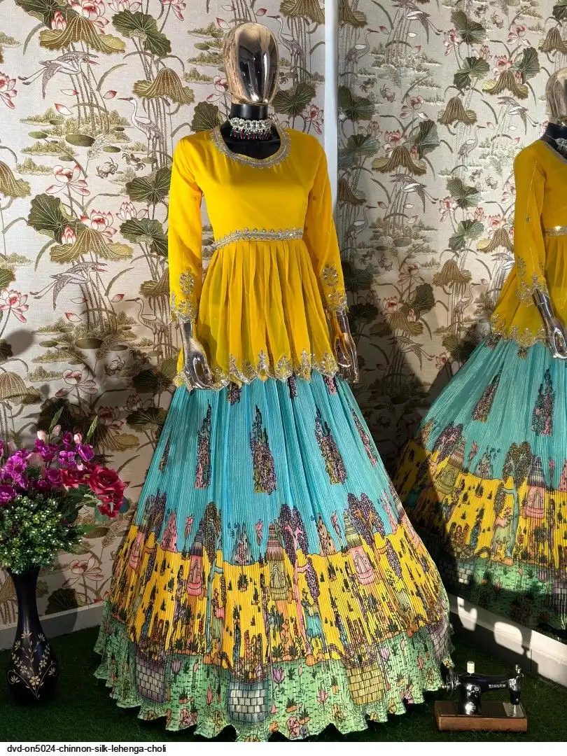 LEHNGA:CHINNON SILK WITH DIGITAL PRINT AND CREASE PATTERN DESIGN