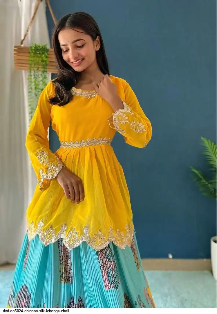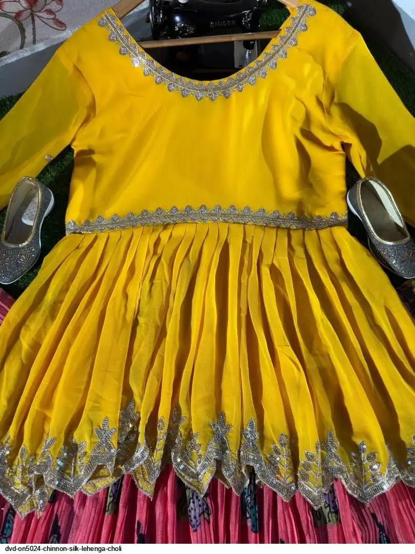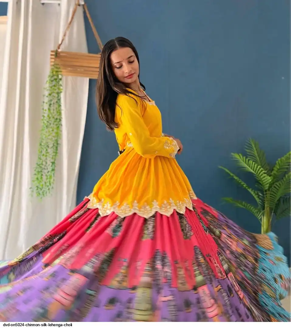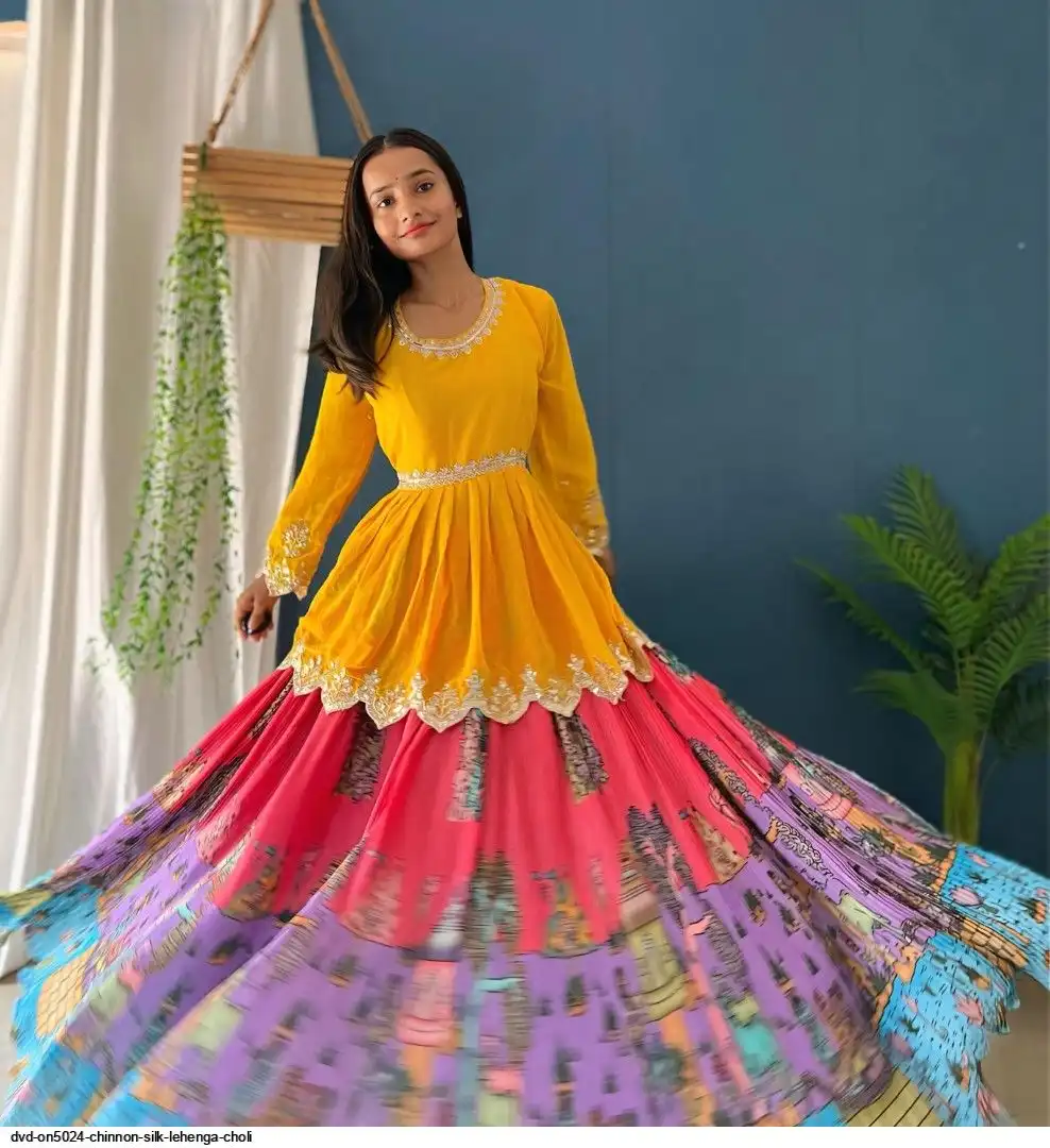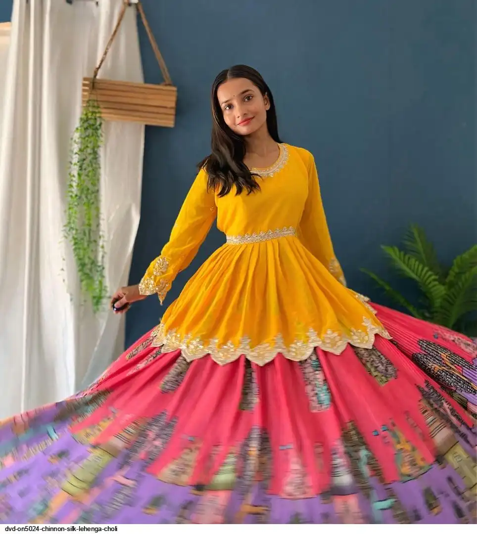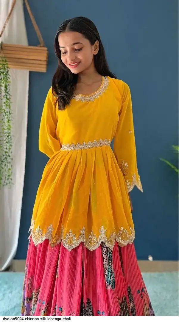 LEHNGA:CHINNON SILK WITH DIGITAL PRINT AND CREASE PATTERN DESIGN