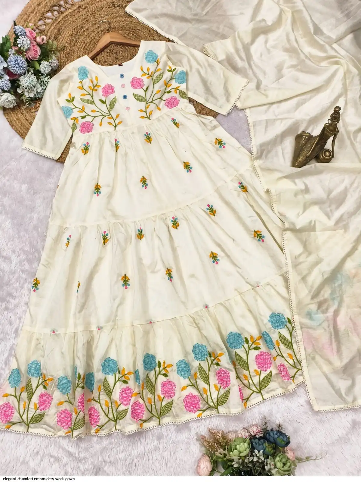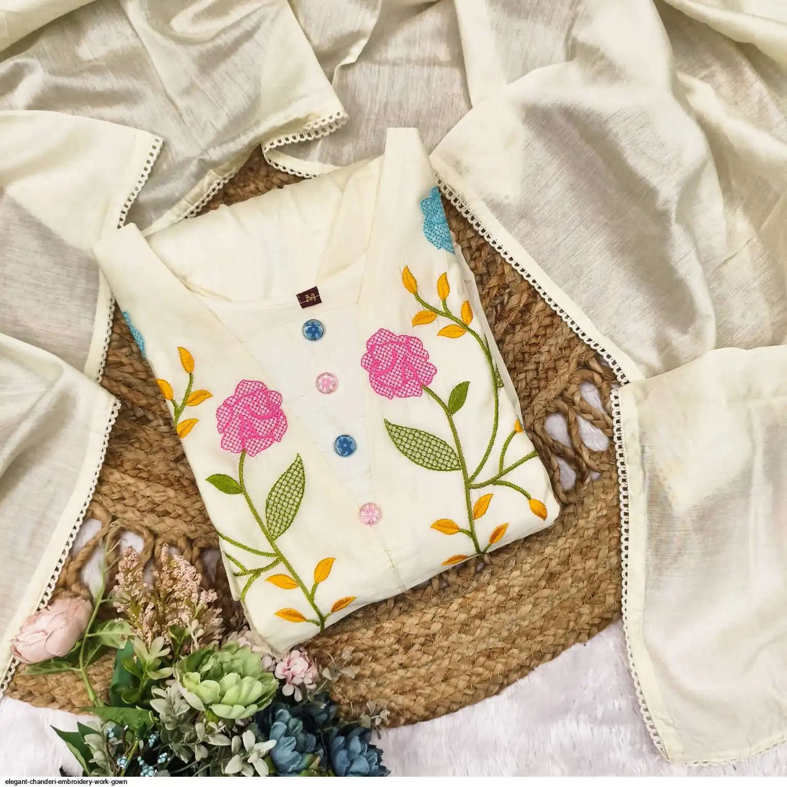 This is a beautiful and elegant ethnic outfit crafted from Chanderi fabric, a traditional textile renowned for its lightweight, sheer texture and subtle sheen. The ensemble is elevated with intricate embroidery work, which adds a rich, The combination of Chanderi's natural elegance and the detailed embroidery makes for a sophisticated and luxurious look, suitable for festive events, formal gatherings, and special occasions.