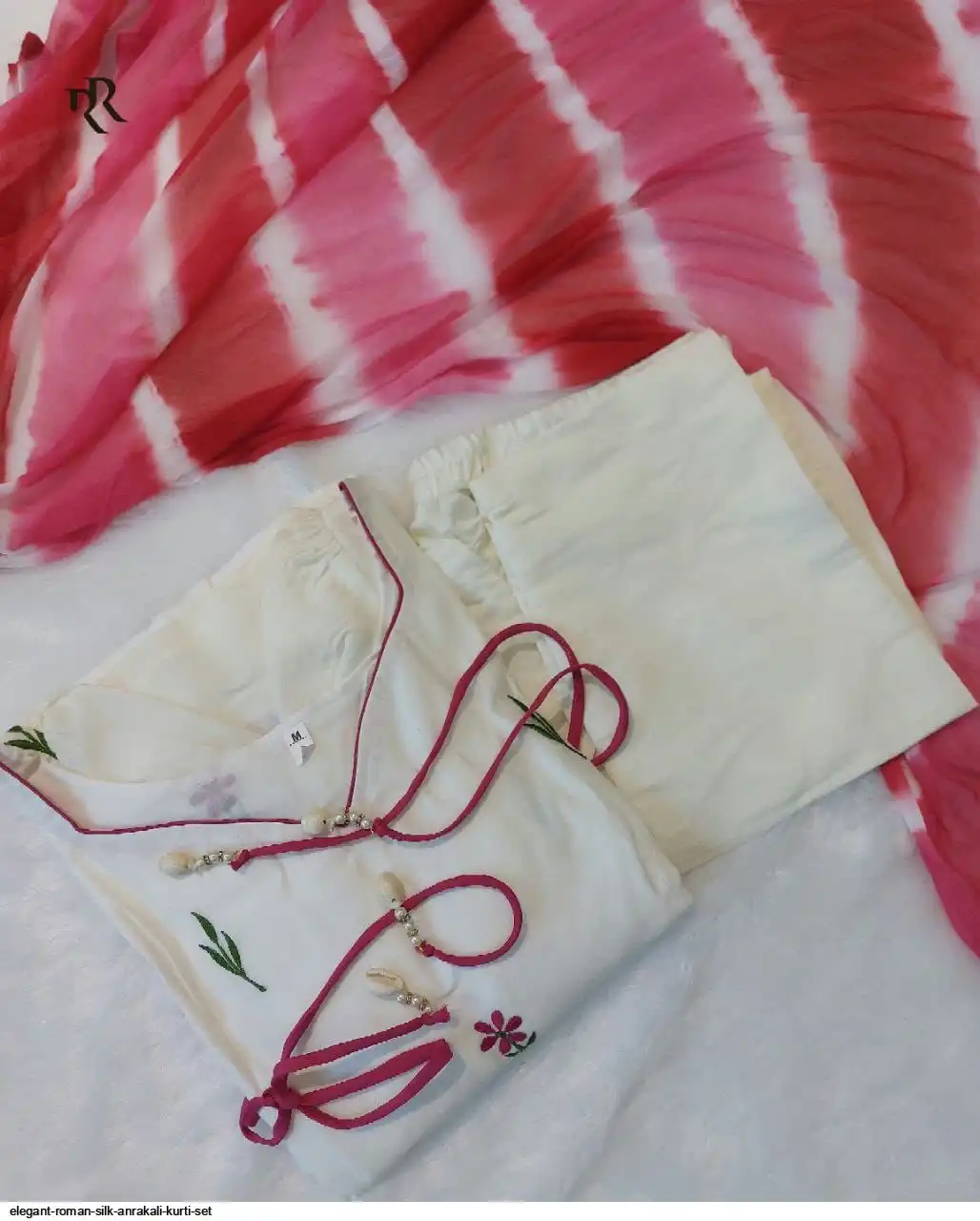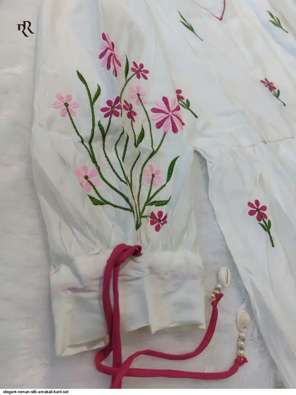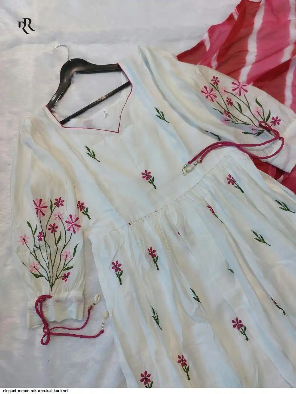 Elegant Design Premium Roman Silk Anrakali Suit set With Nazmin Dupatta And Dori and Kodi on sleeve for adjustment Embroidery work on all Over kurti and Sleeve
