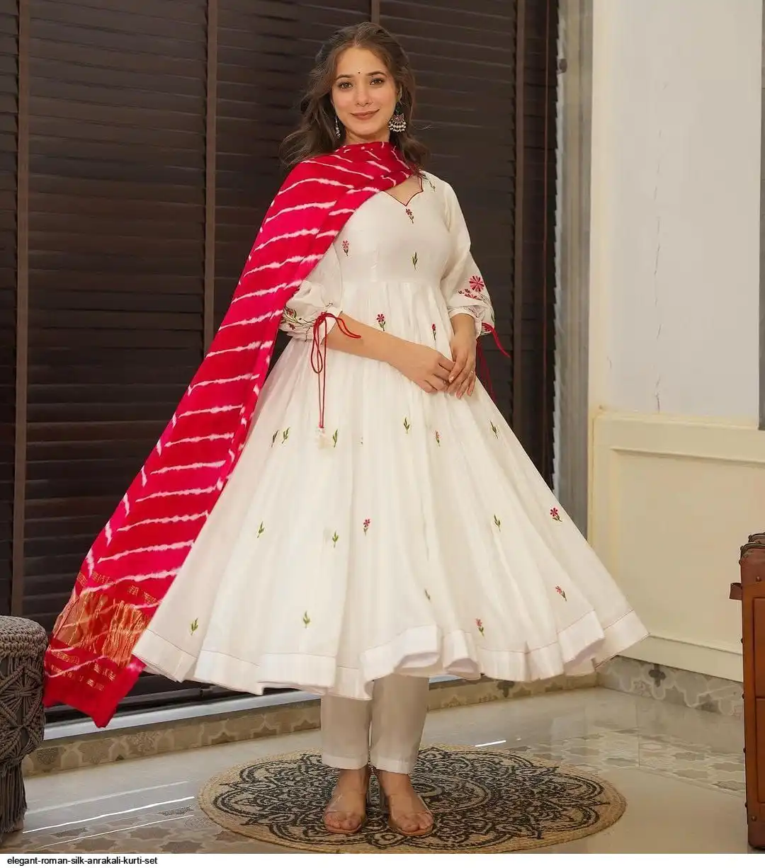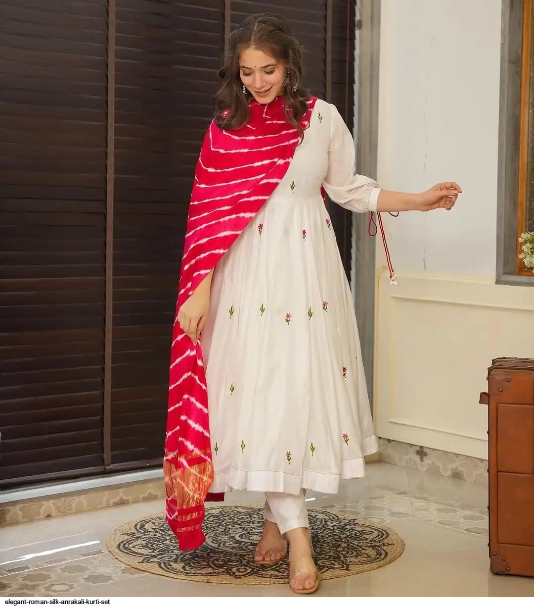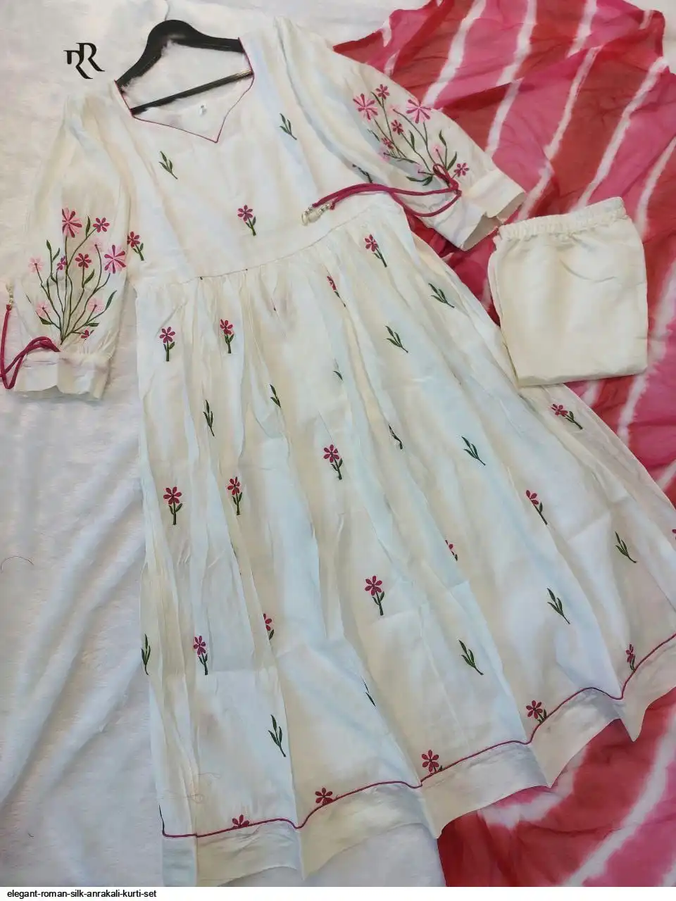 Elegant Design Premium Roman Silk Anrakali Suit set With Nazmin Dupatta And Dori and Kodi on sleeve for adjustment Embroidery work on all Over kurti and Sleeve