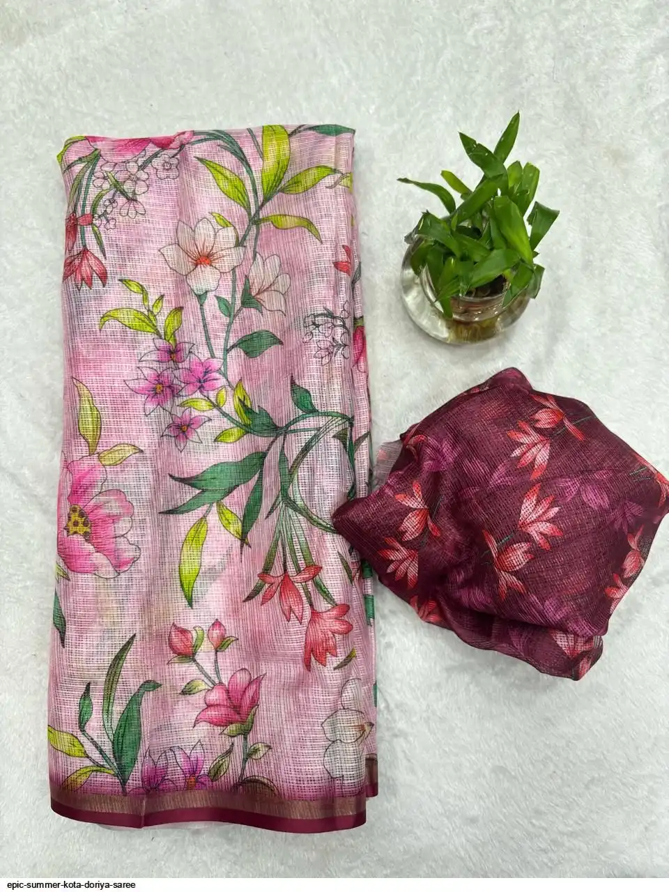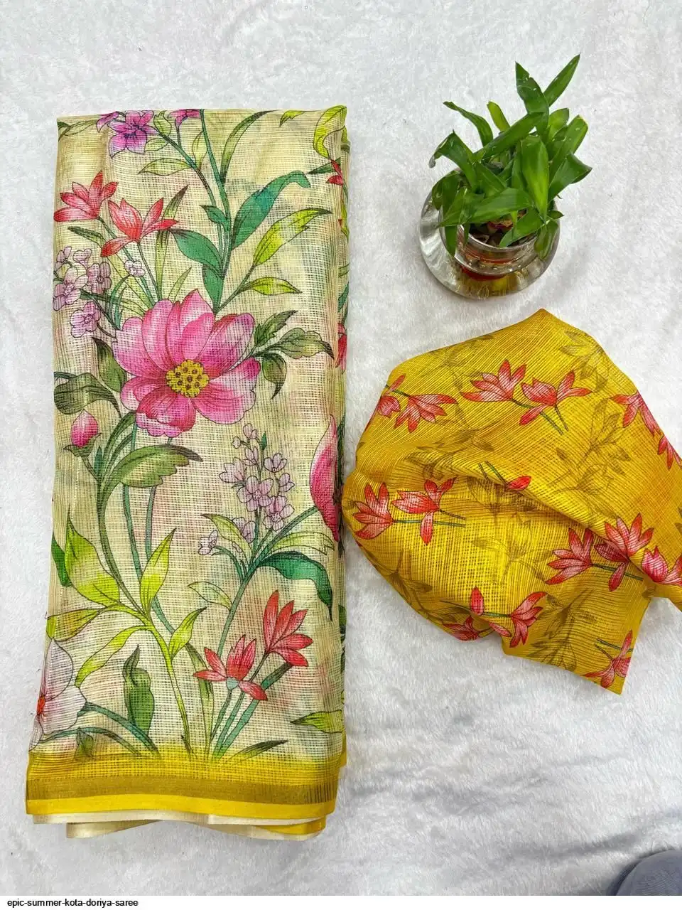 QUALITY - SOFT KOTA DORIYA Kalamkari Floral STYLE PRINTED SAREE WITH ZARI PATTU BORDER.