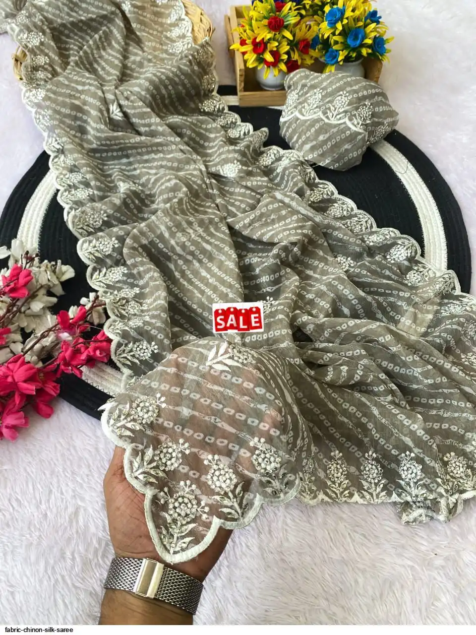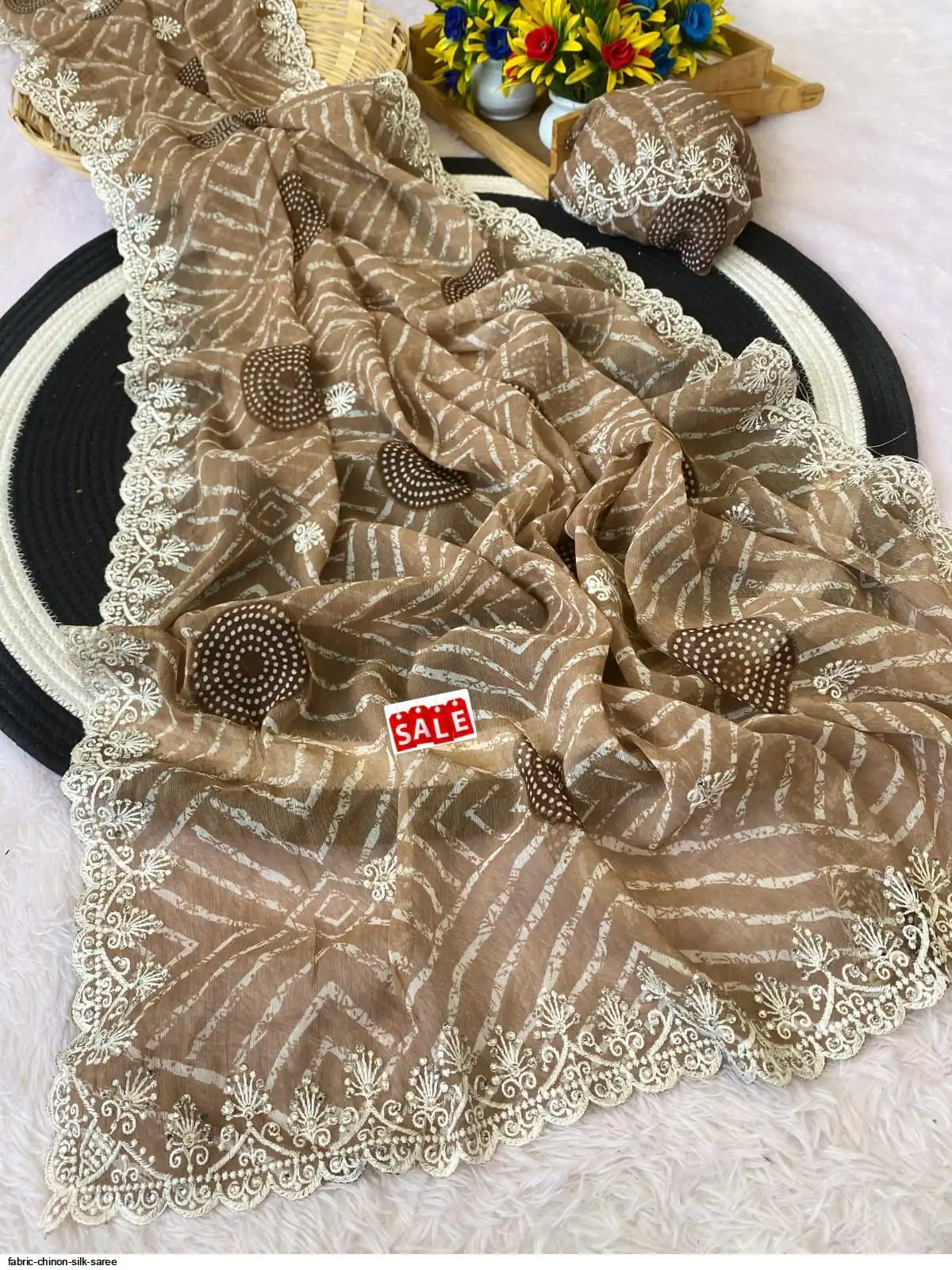 SAREE FABRIC CHINON SILK STAR GEORGETTE AND GEORGETTE BANDHANI PRINT ALL DESIGN HEAVY MULTI AND SEQUANCE C PALLU WORK DONE