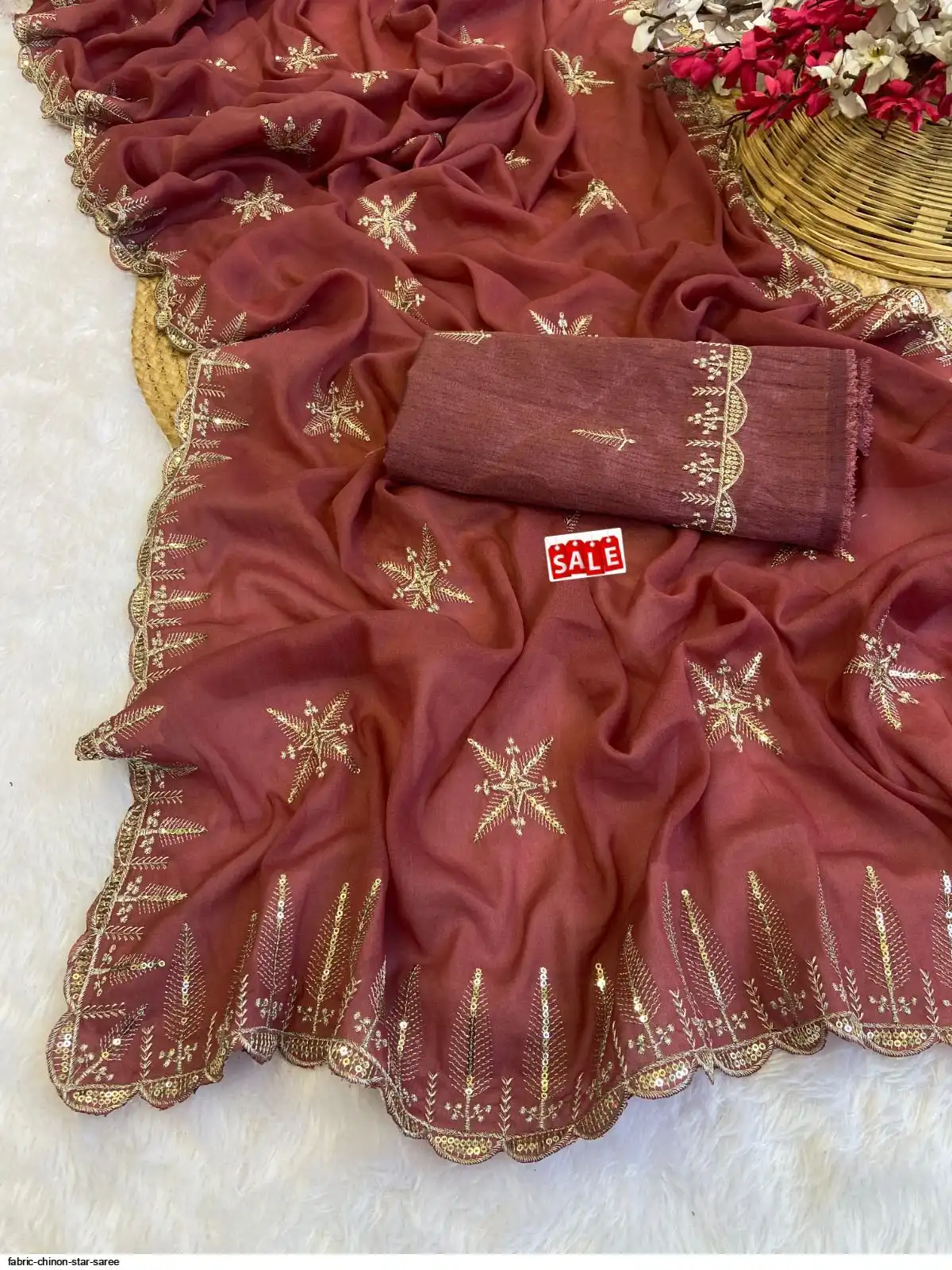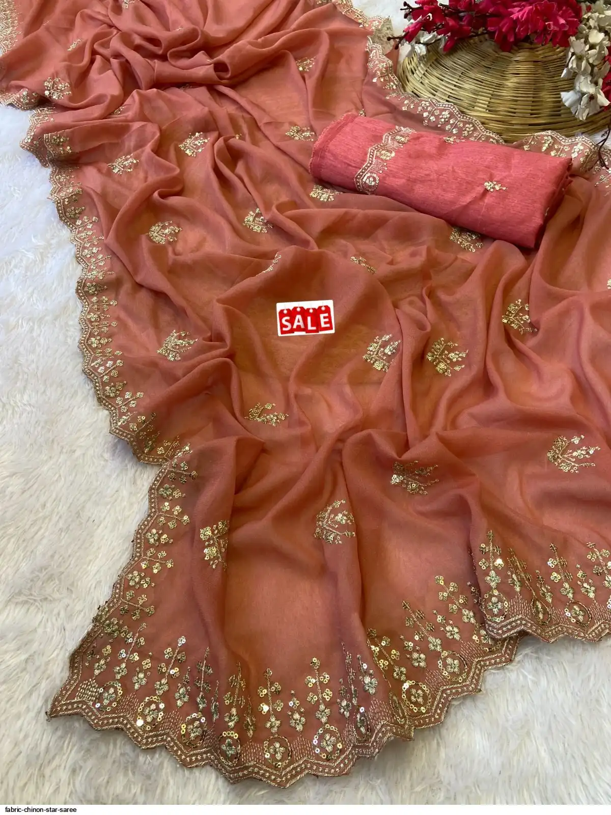 SAREE FABRIC CHINON SILK STAR GEORGETTE AND GEORGETTE BANDHANI PRINT ALL DESIGN HEAVY MULTI AND SEQUANCE C PALLU WORK DONE