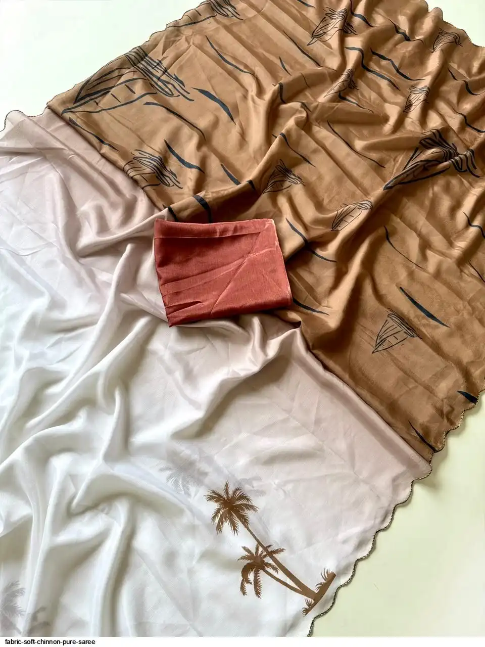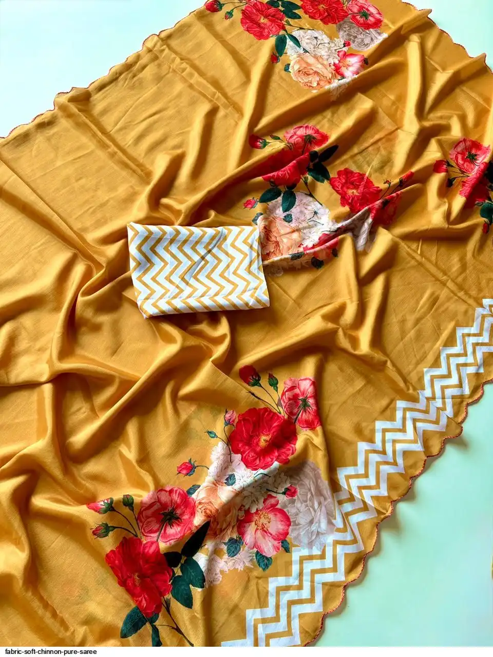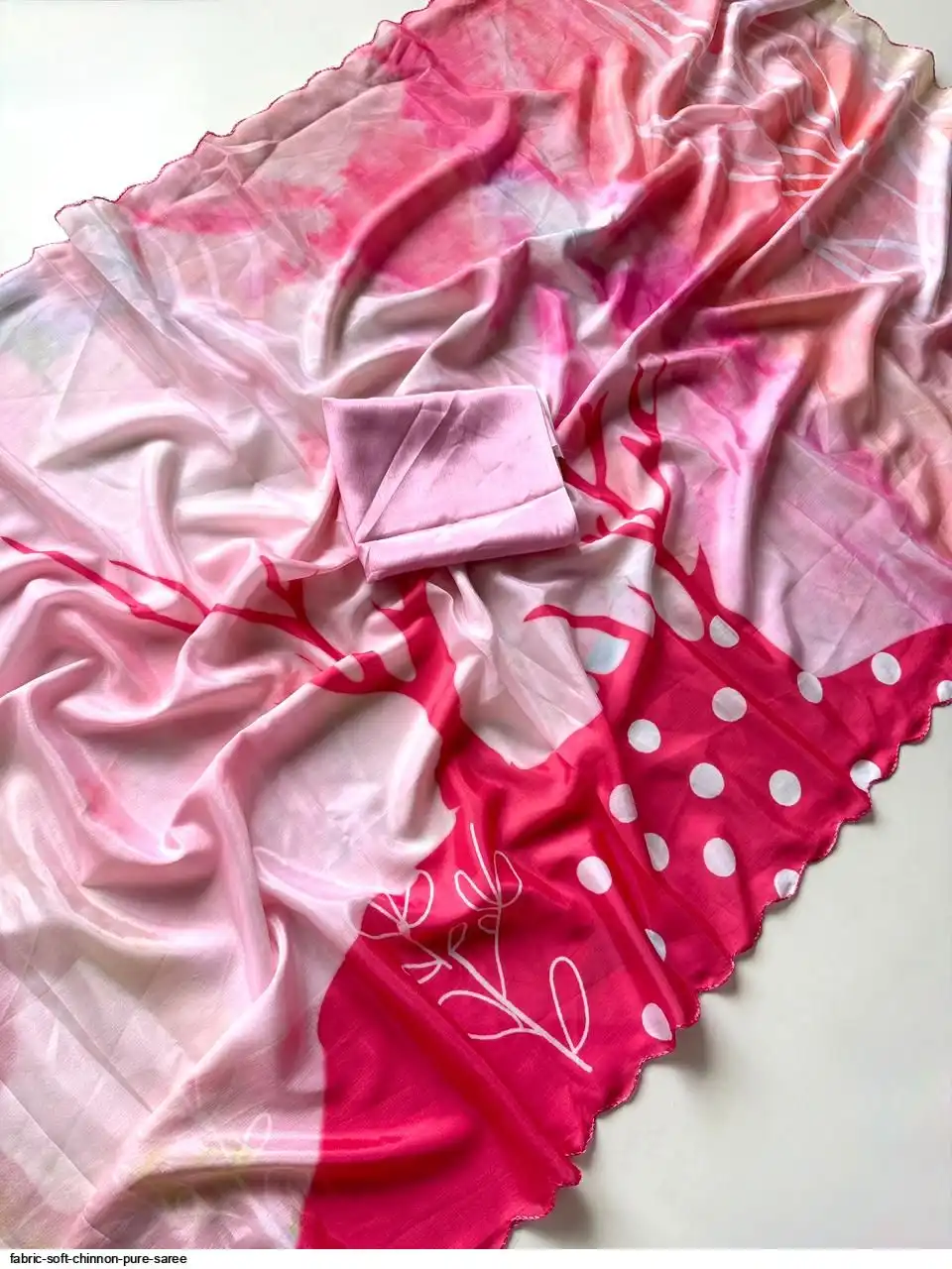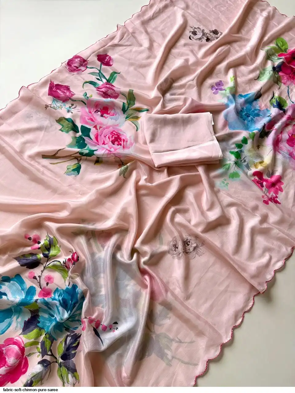 Fabric - Soft Shinon Fabric With Beautiful Floral Print And Contrast Arco Cutwork Bordar With Contrast Blouse