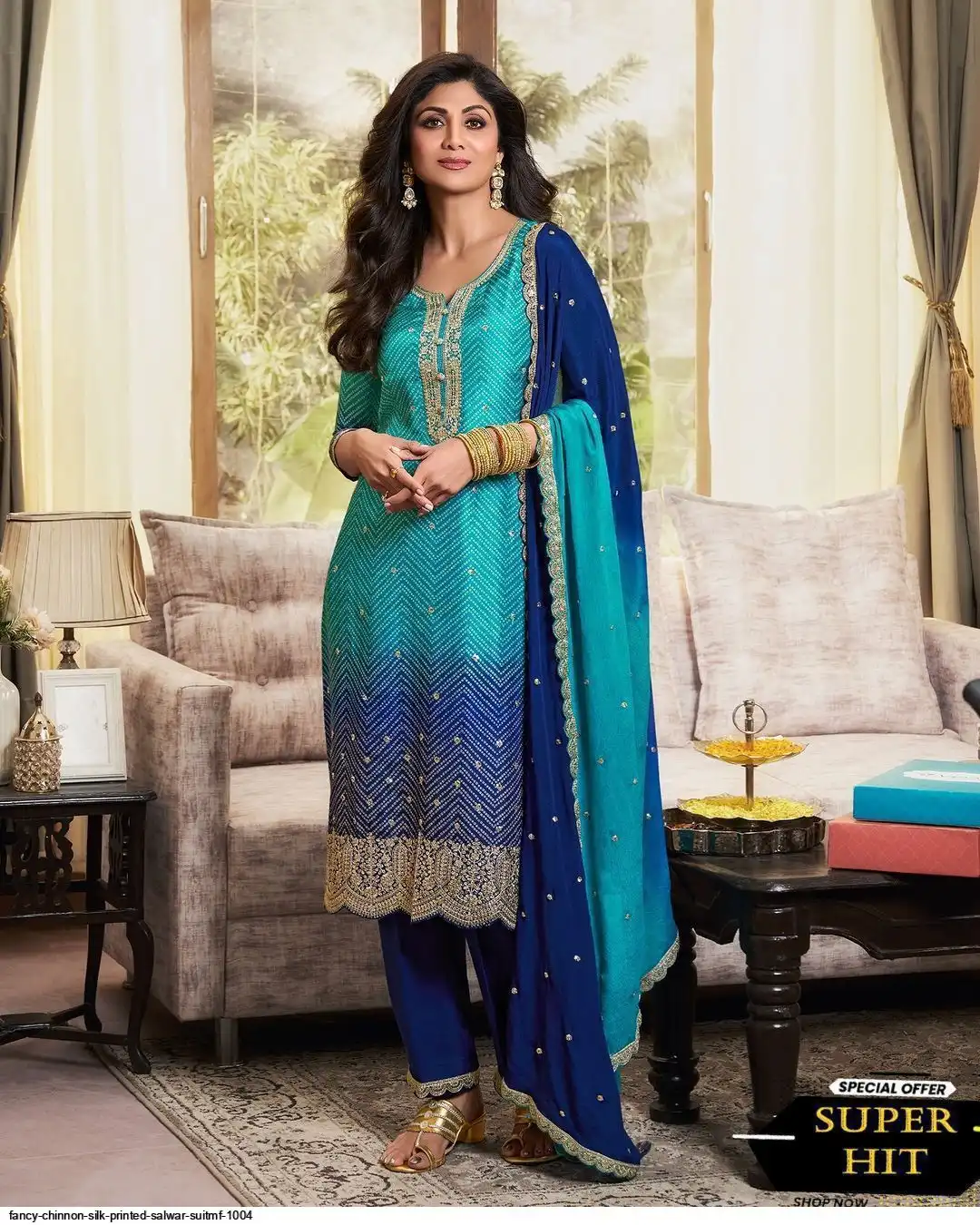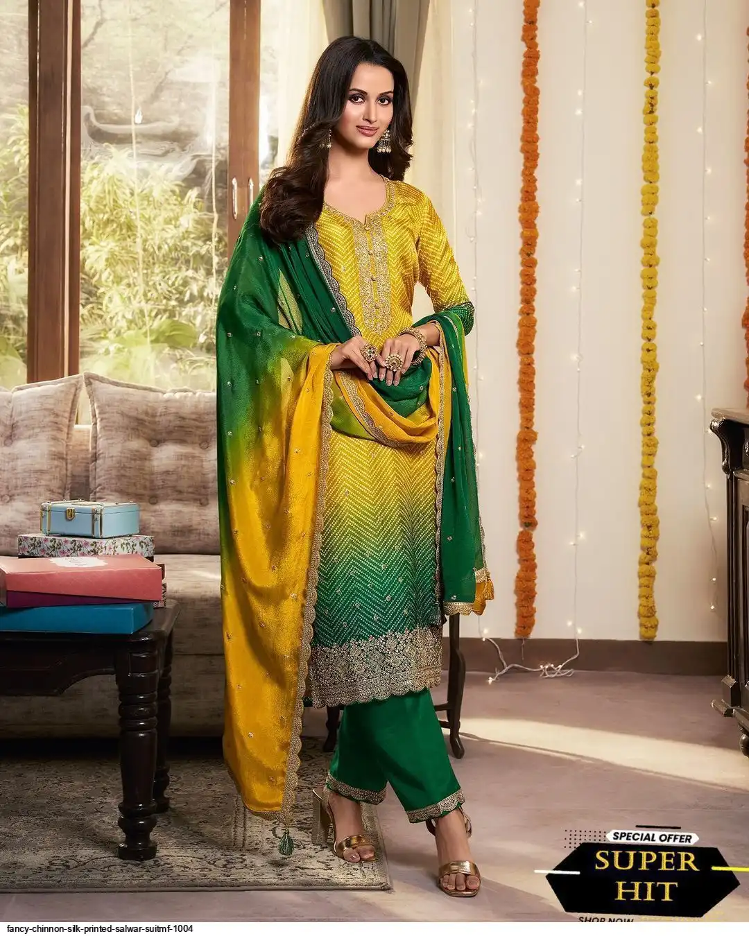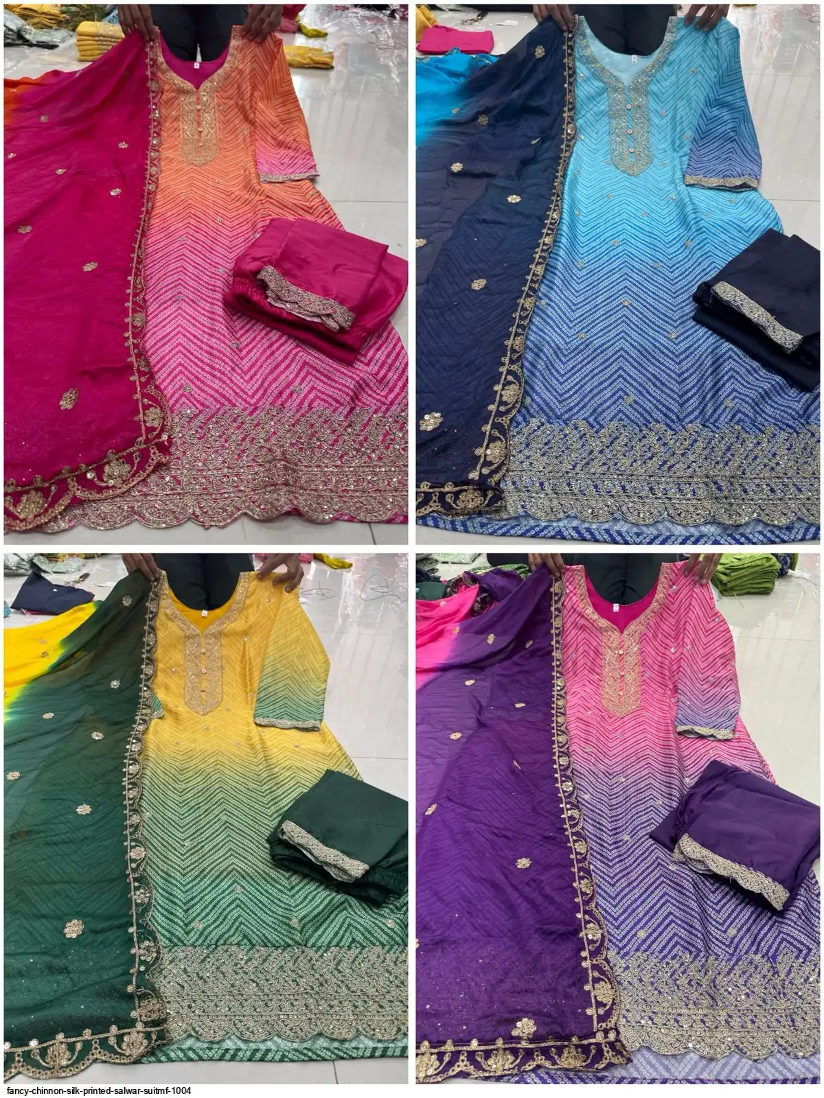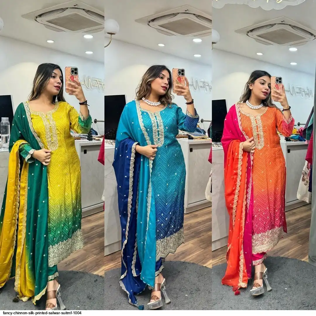 DESIGNER FANCY PURE CHINNON SILK PRINTED AND SEQUENCE EMBROIDERY WORK TOP AND PANT WITH DUPATTA*