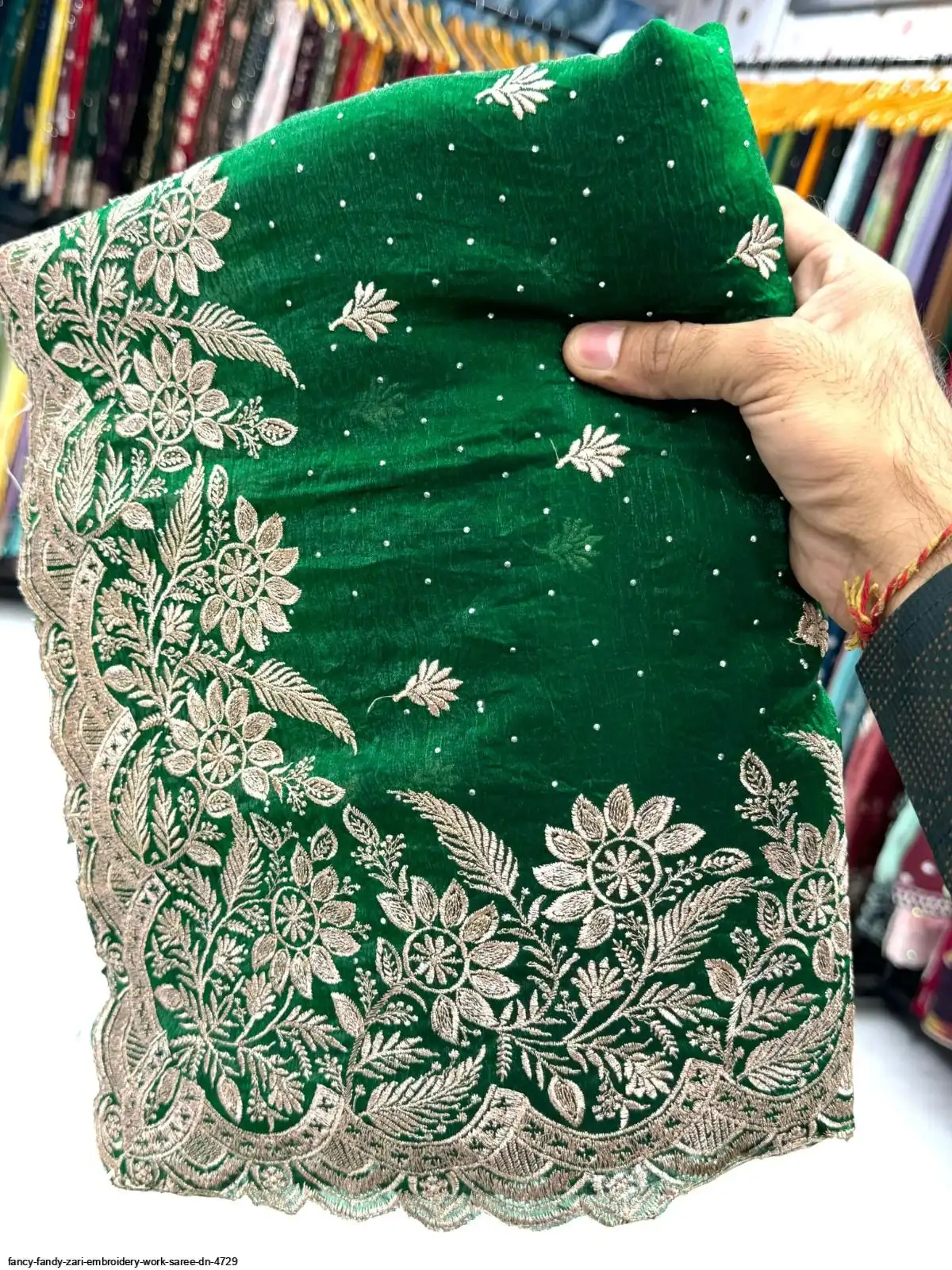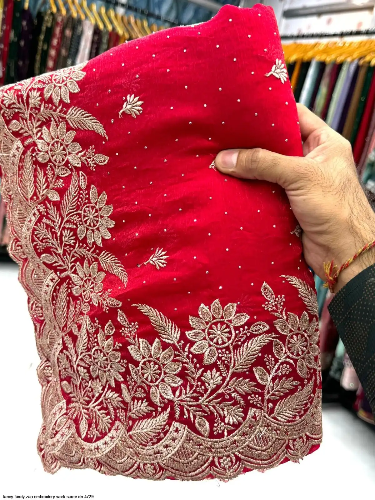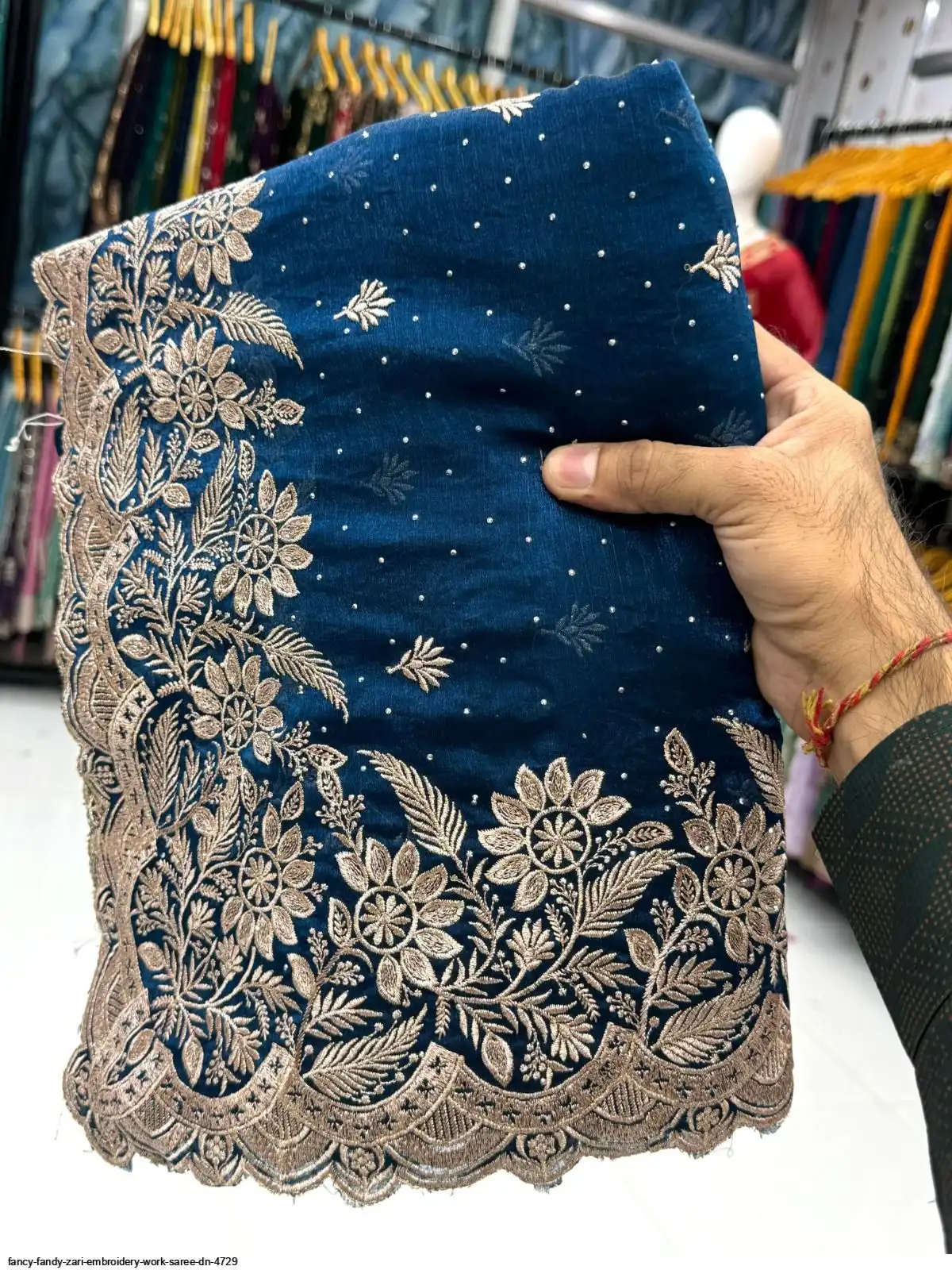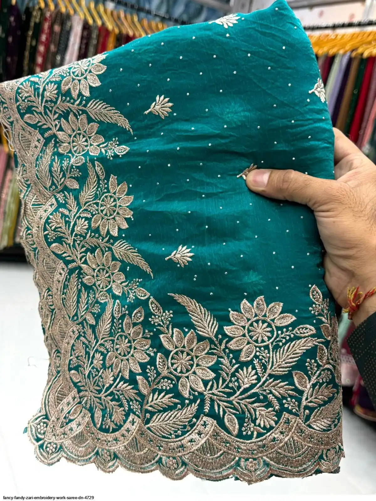 Work : Full Heavy Zari Embroidery Work In All Over Saree With Stone Work.