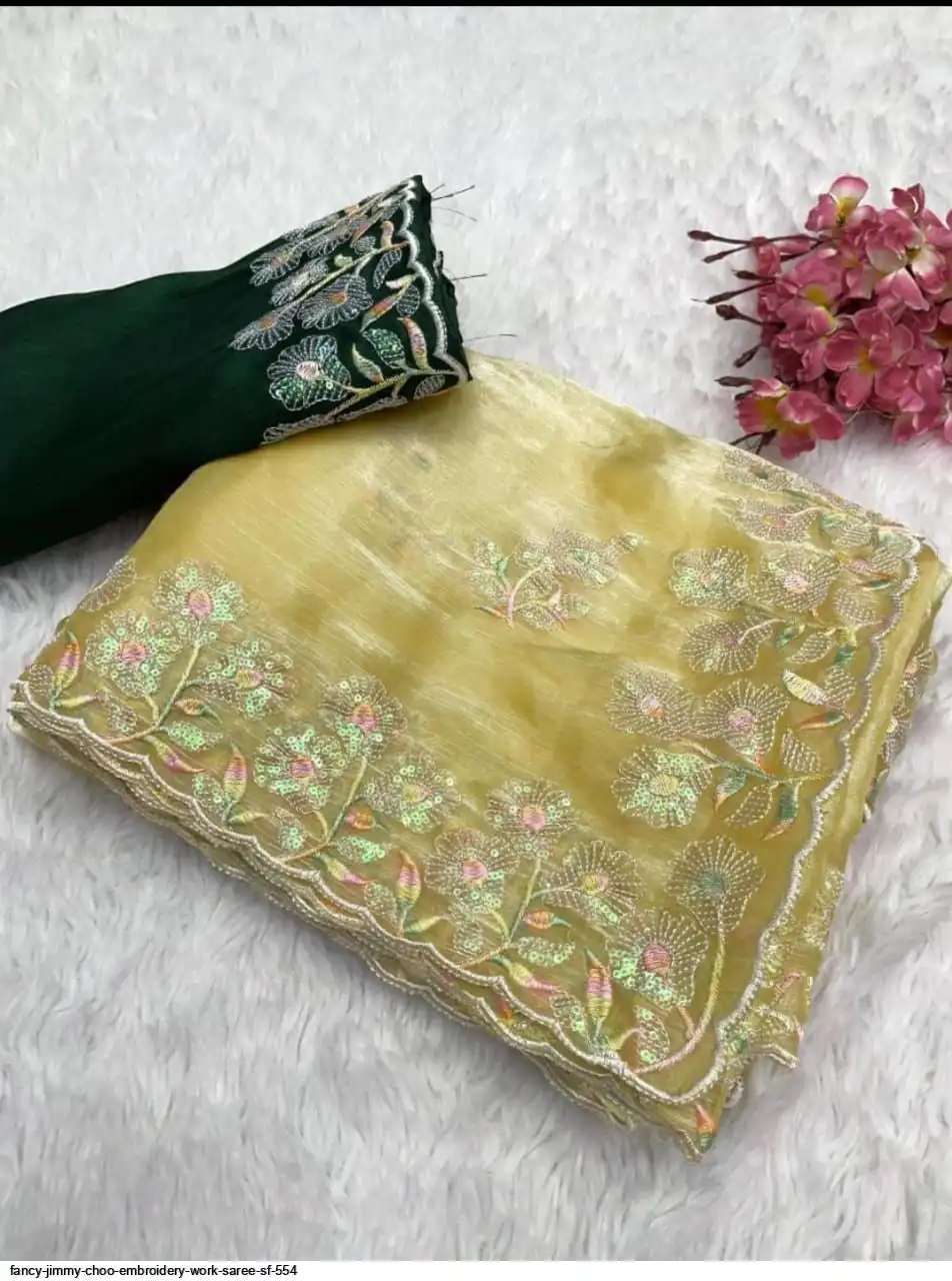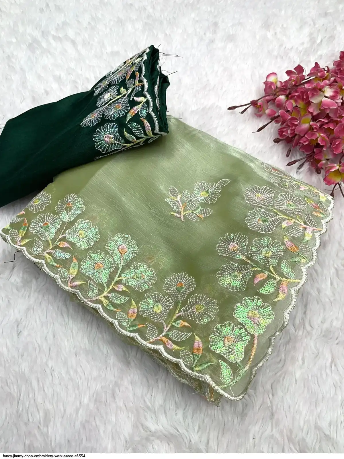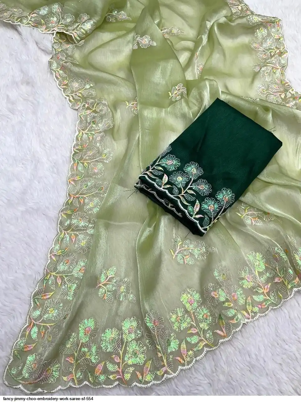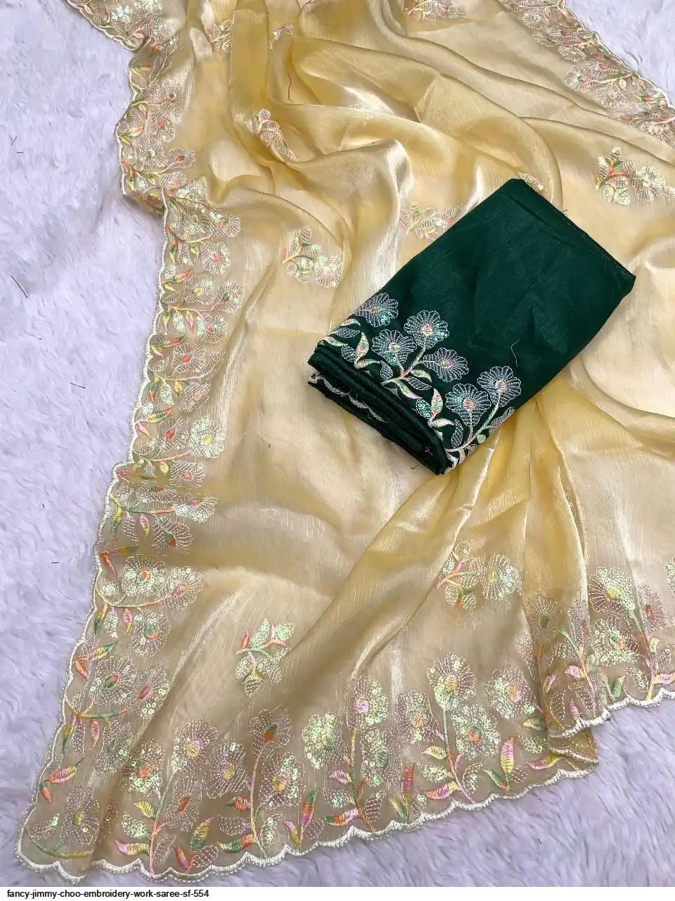 SAREES FABRIC.:-Jimmy choo fabric with Dual colour sequence and thread embroidery work in and arc cut border with all over butta work.