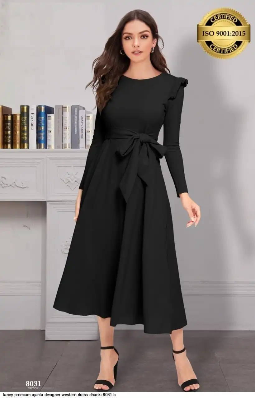 Speciality : round neck DESIGNER Western dress with belt and shoulder frill design