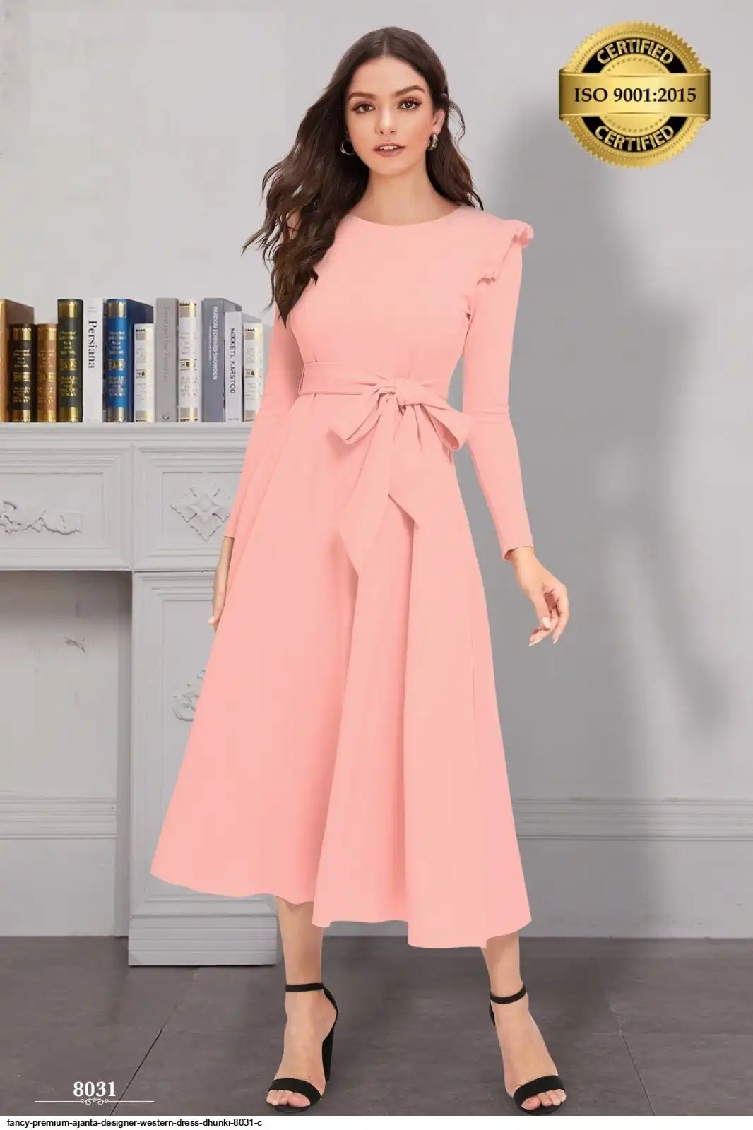 Speciality : round neck DESIGNER Western dress with belt and shoulder frill design