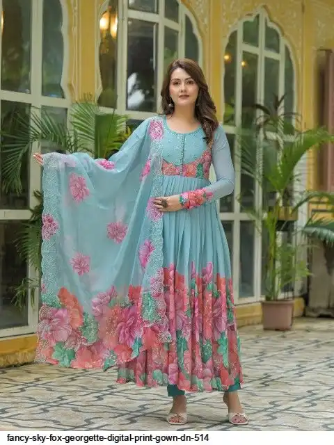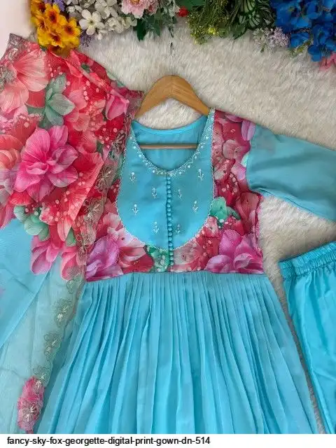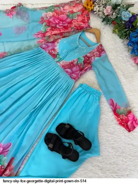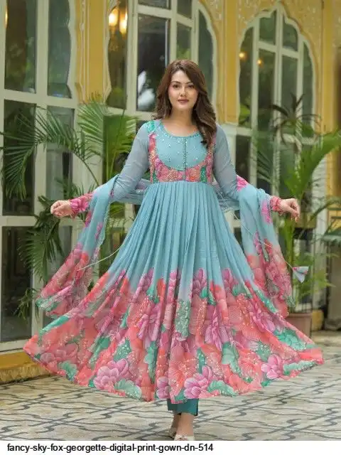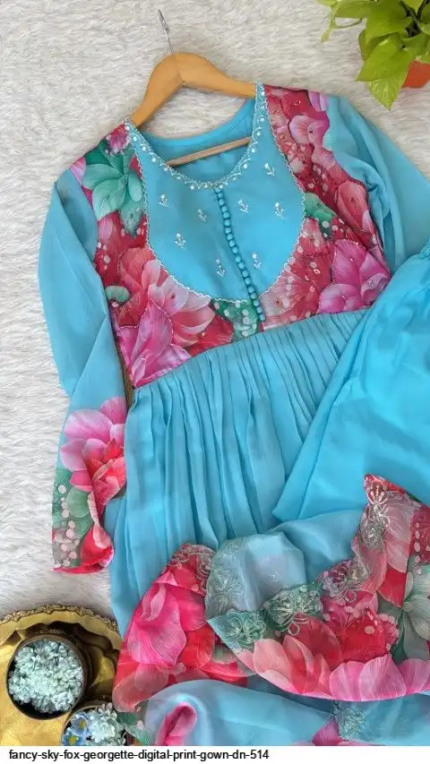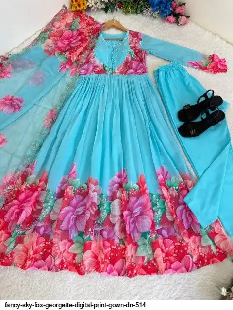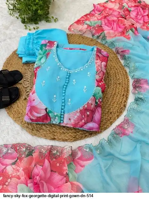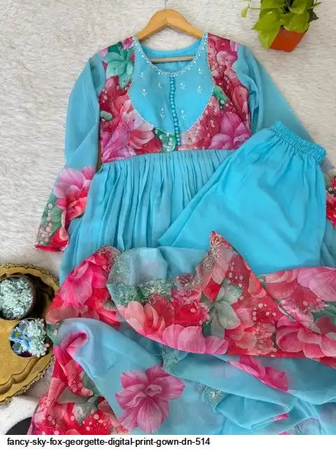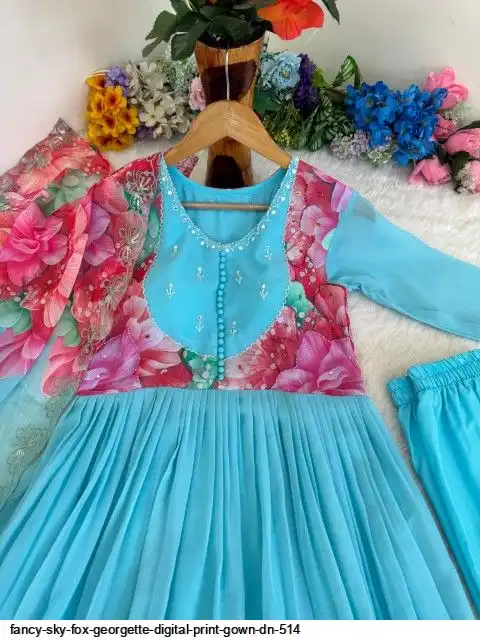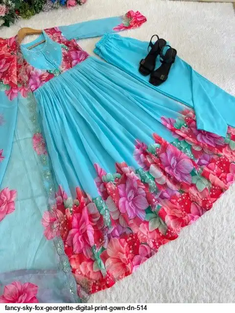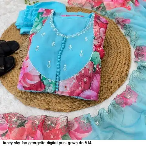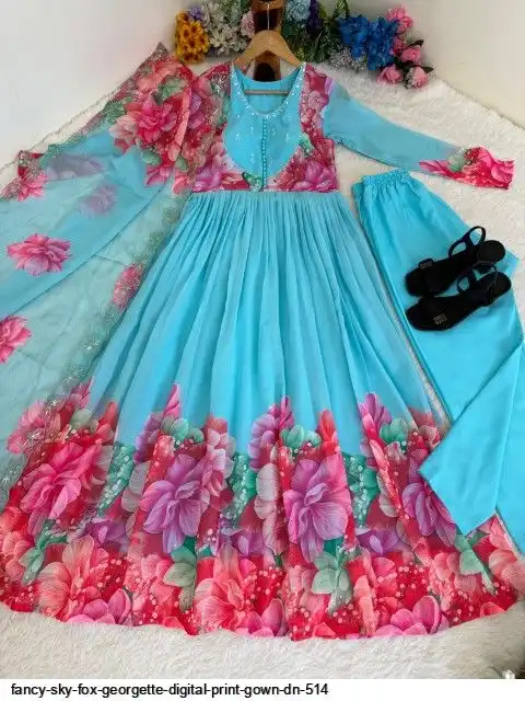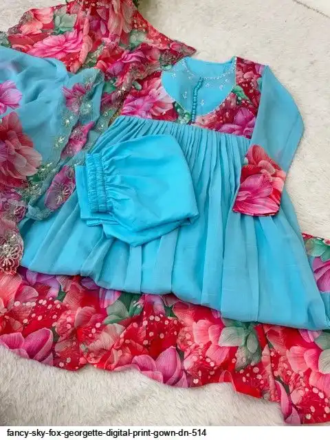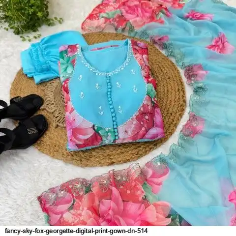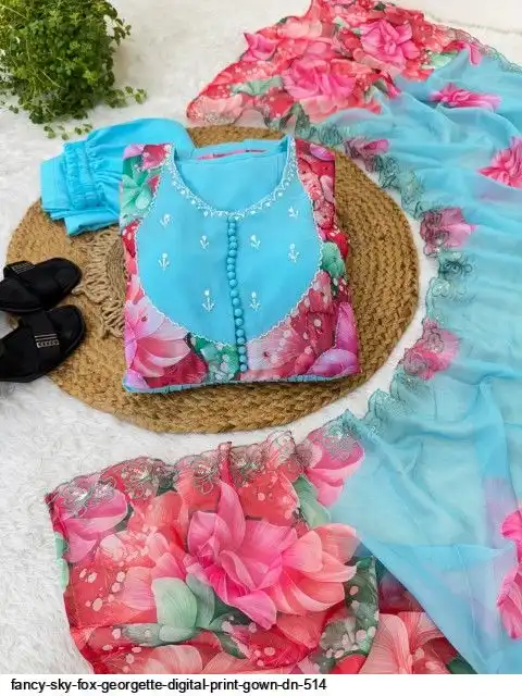 Gown Febrics Fox Georgette Heavy Quality FabricWith Handwork Neck And Sleeve ,Full Long With Creap Pant , Taby Silk Digital print Dupatta With Embroidery Sequence Work Broder