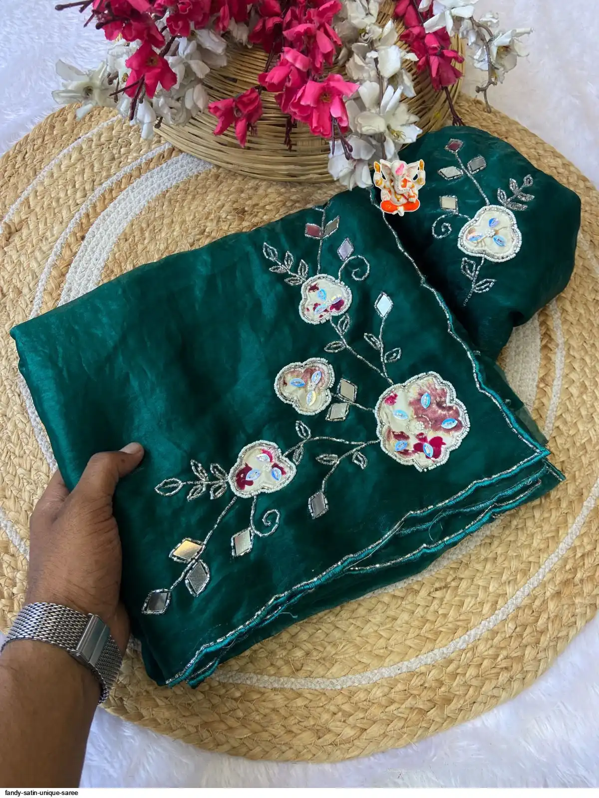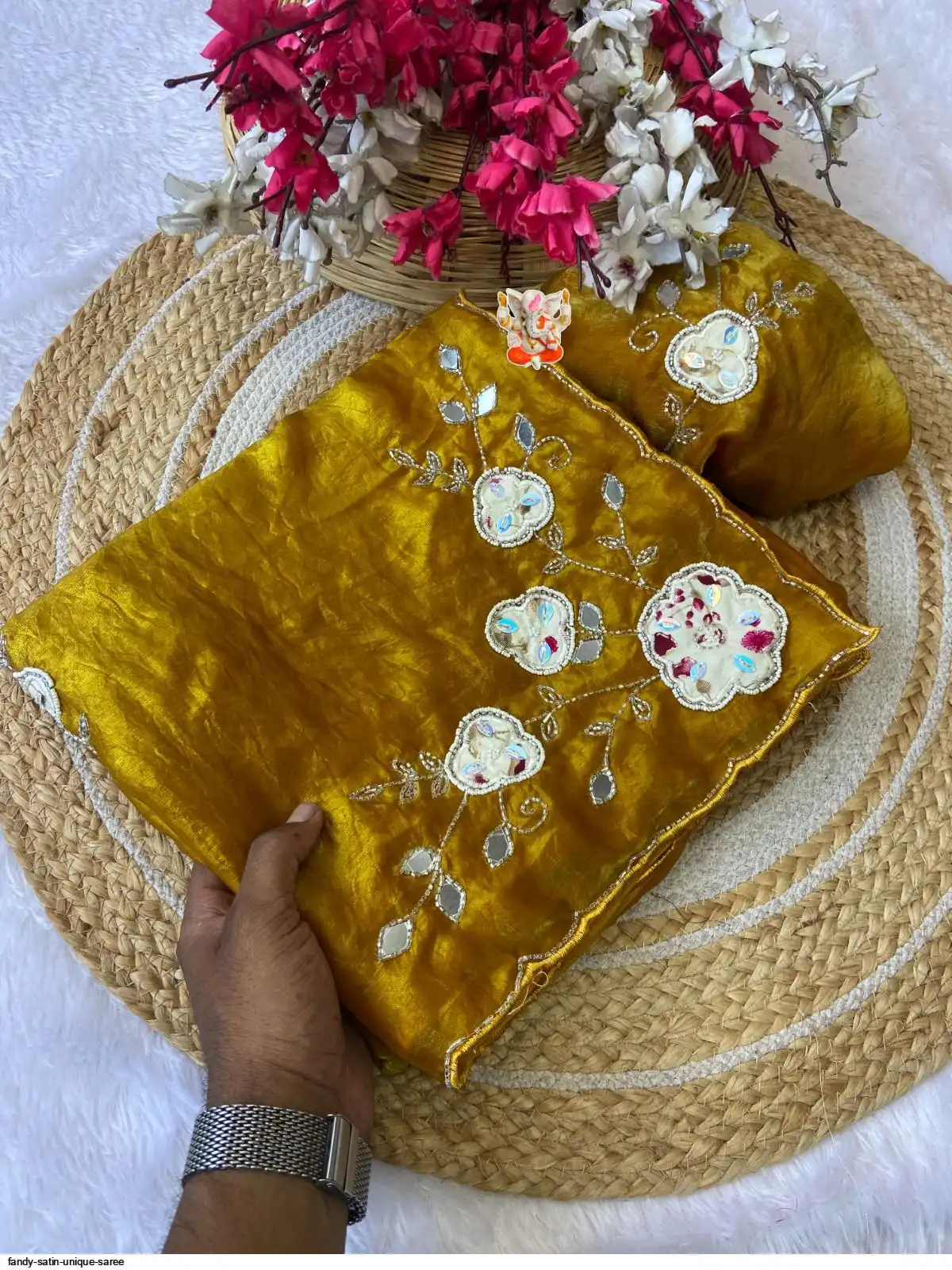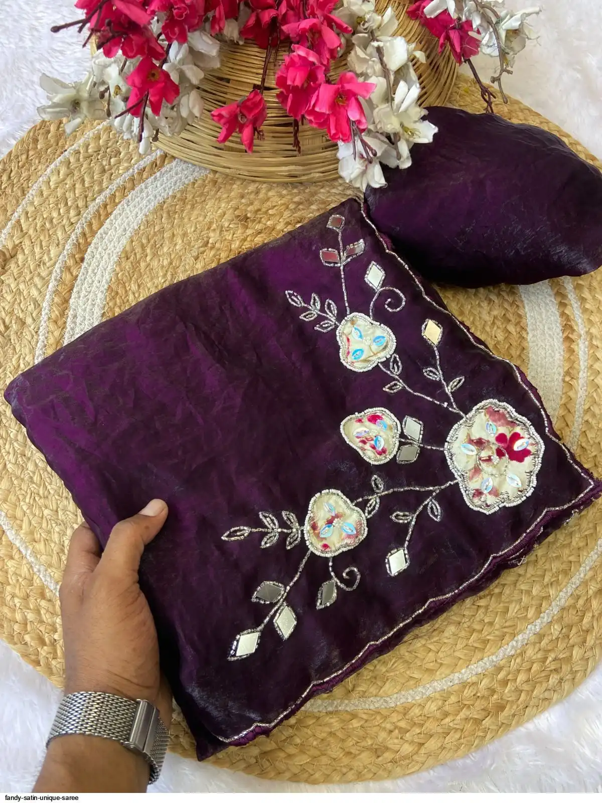 Beautiful fandy satin fabric saree with beautiful hand work and peach work Butta with c pallu saree.