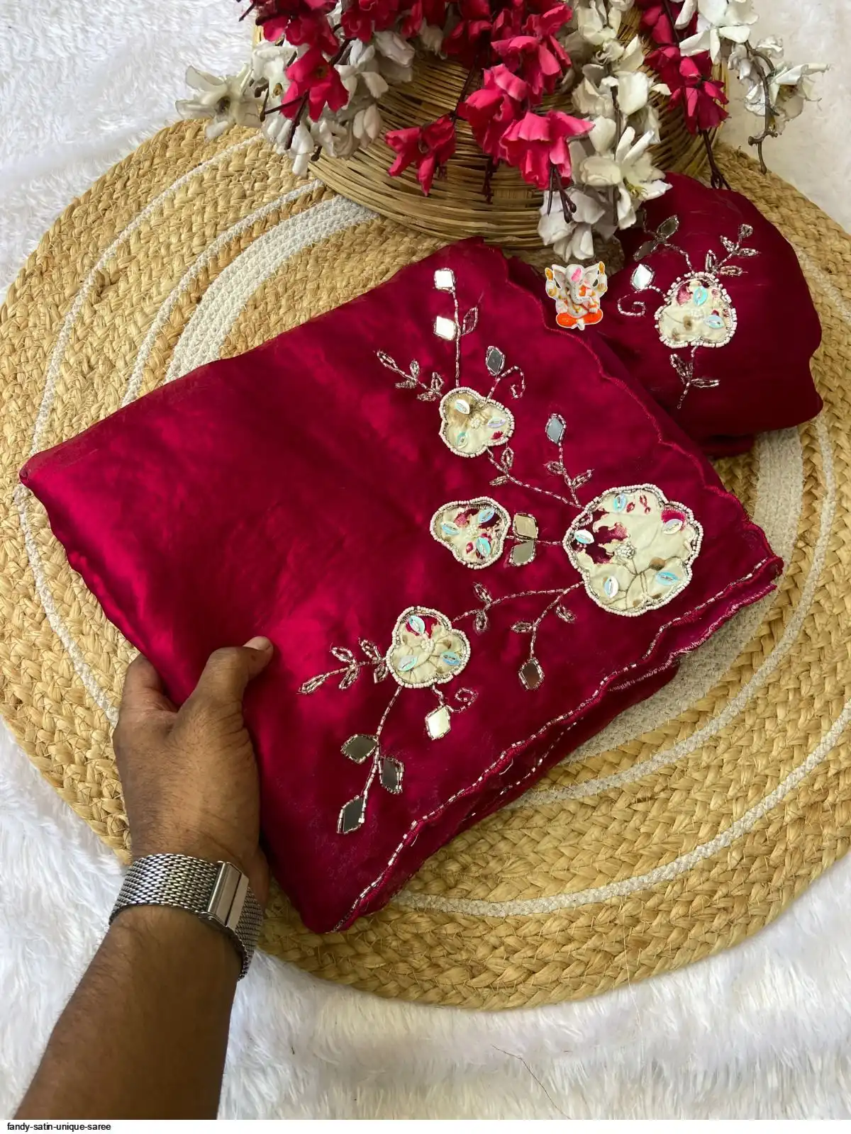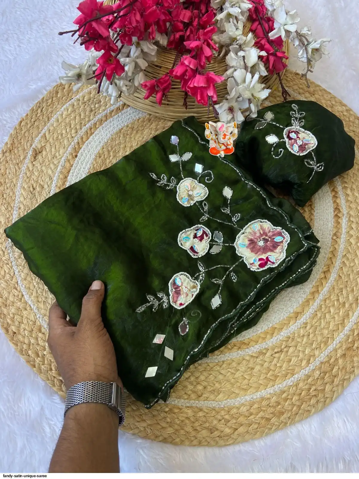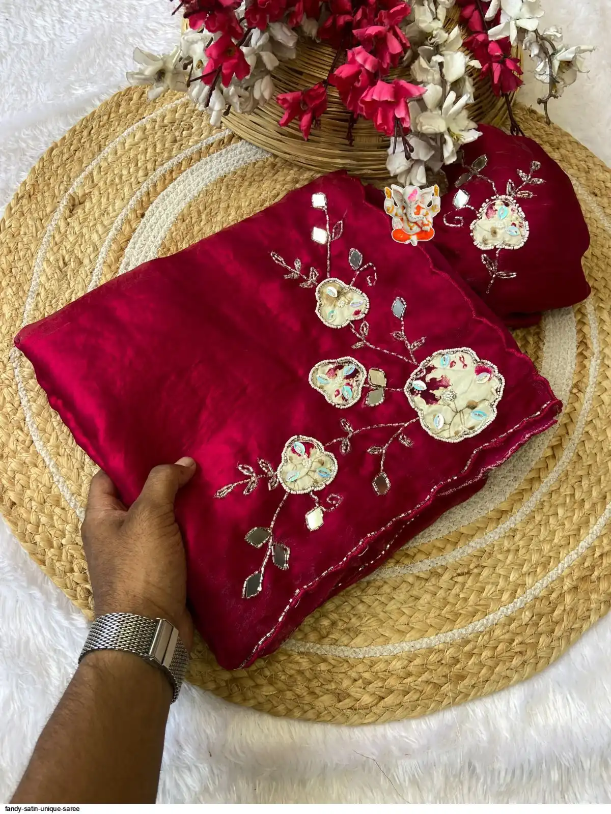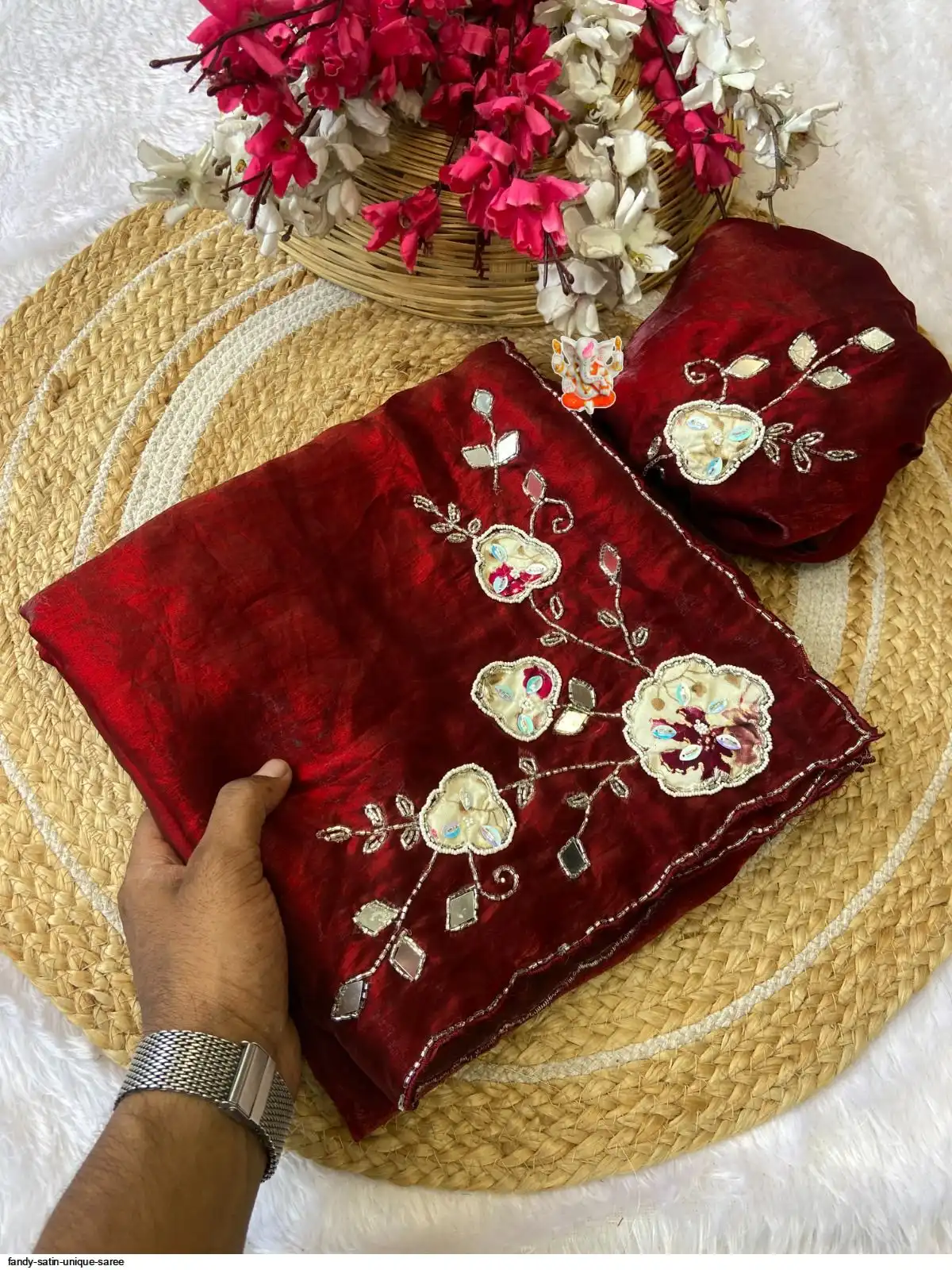 Beautiful fandy satin fabric saree with beautiful hand work and peach work Butta with c pallu saree.