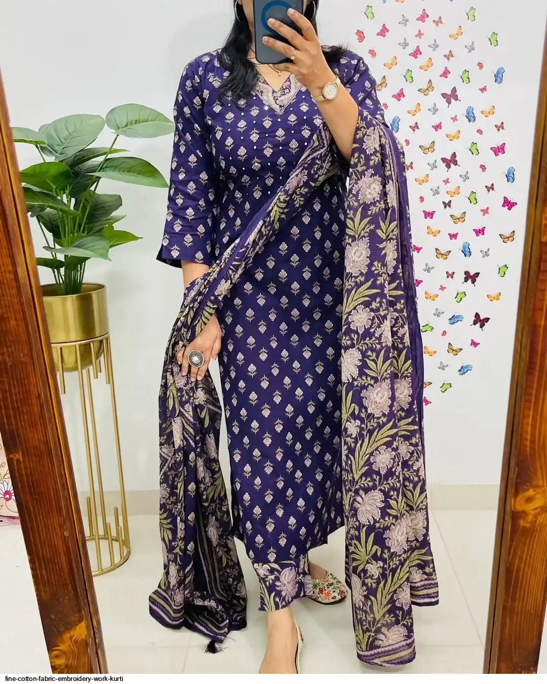 Pure fine Cotton fabric Embroidery Work Kurti with Pant with cotton 100-100 Dupatta