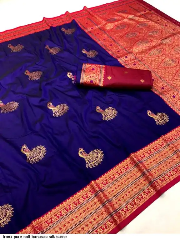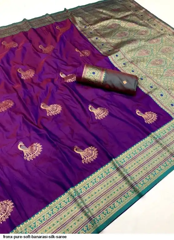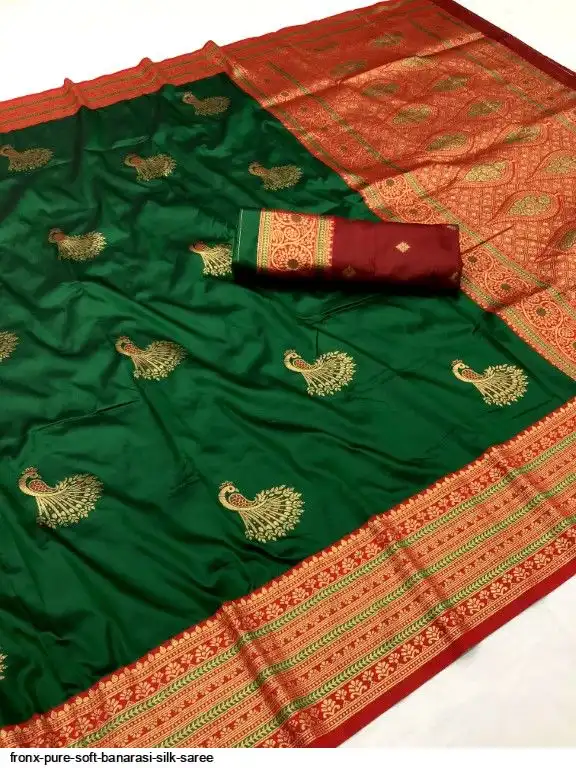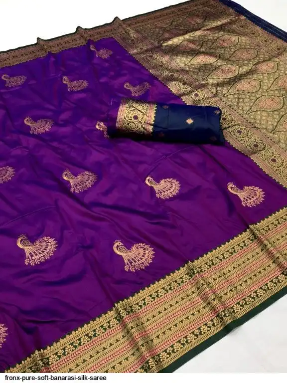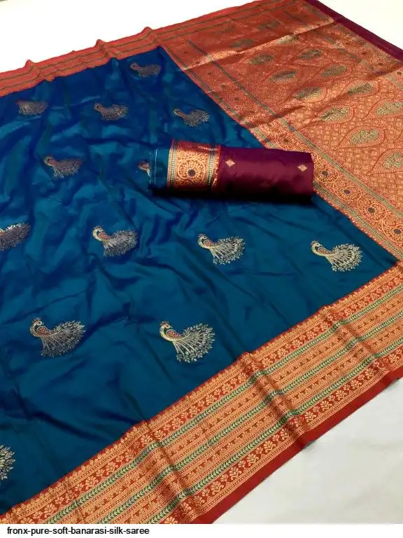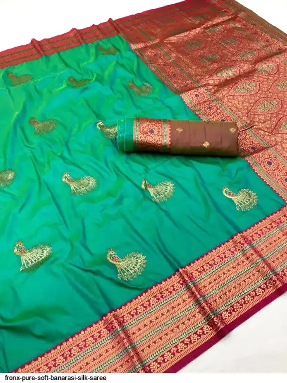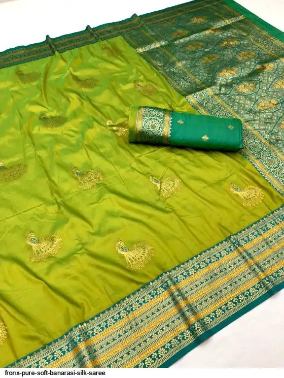FABRIC :- Pure Soft Banarasi Silk Saree With Beautiful Colours And Contrast Weaving Border And Pallu With All Over Peacock Beautiful Gold Zari Weaving Design And Rich Weaved Pallu And Blouse