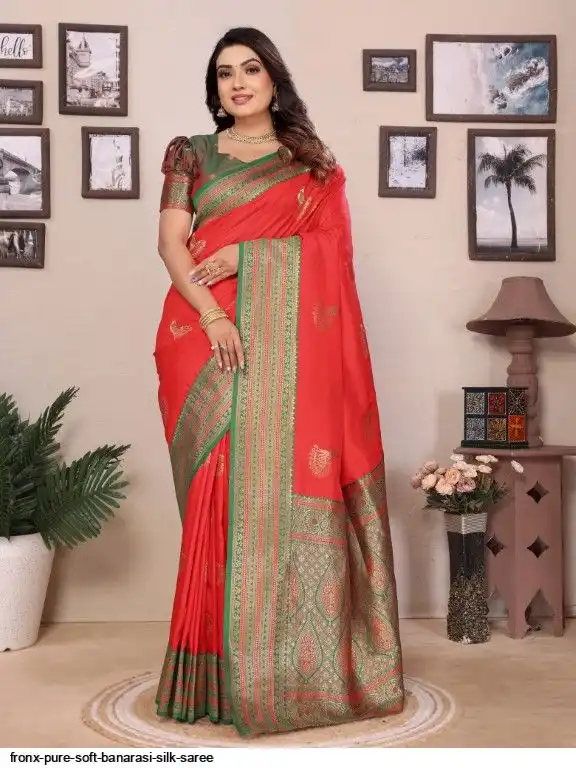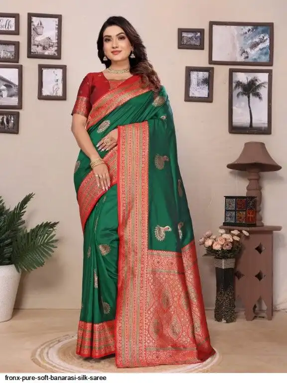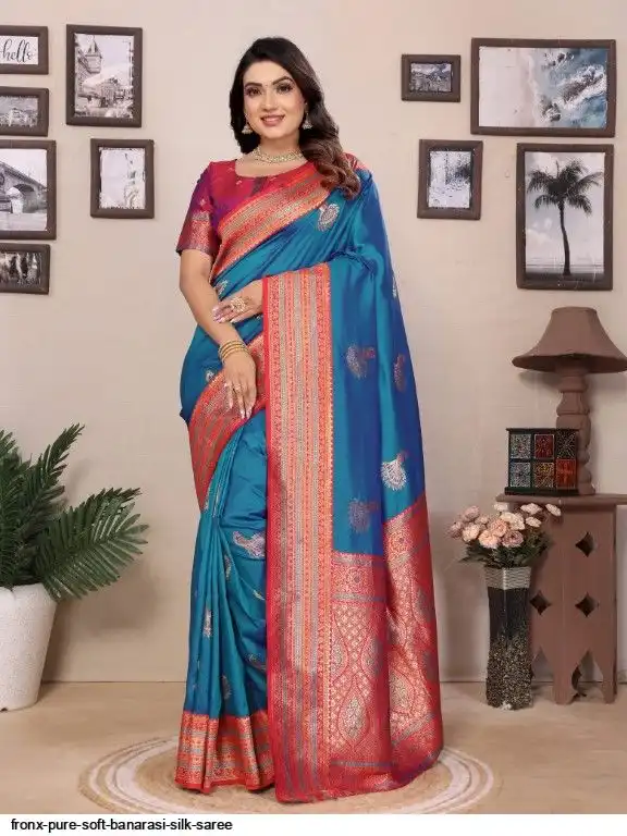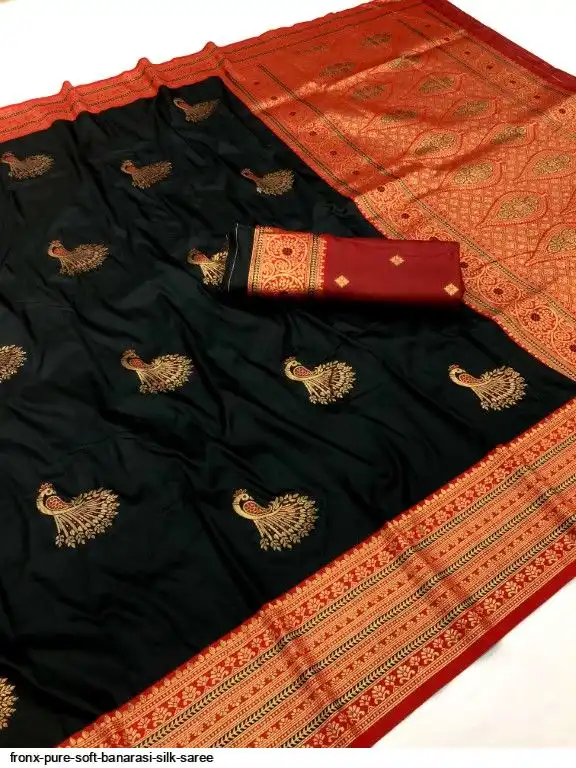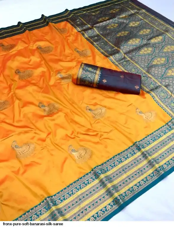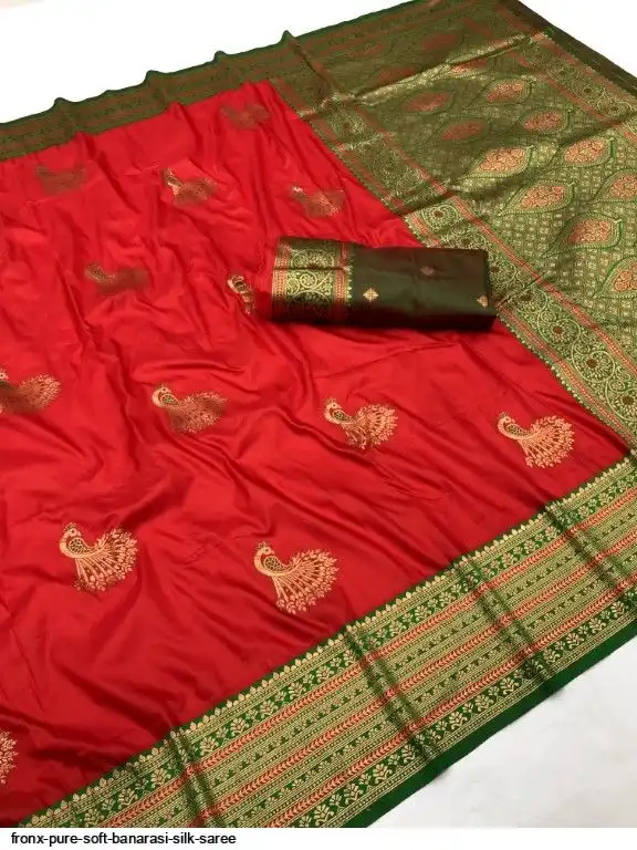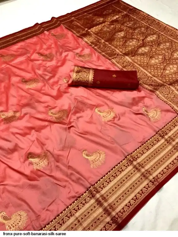 FABRIC :- Pure Soft Banarasi Silk Saree With Beautiful Colours And Contrast Weaving Border And Pallu With All Over Peacock Beautiful Gold Zari Weaving Design And Rich Weaved Pallu And Blouse
