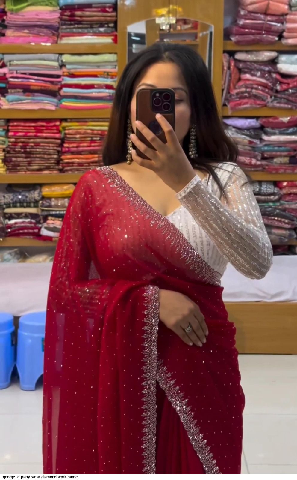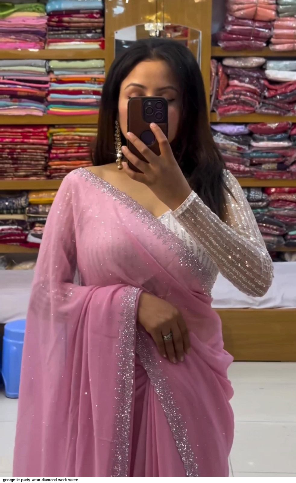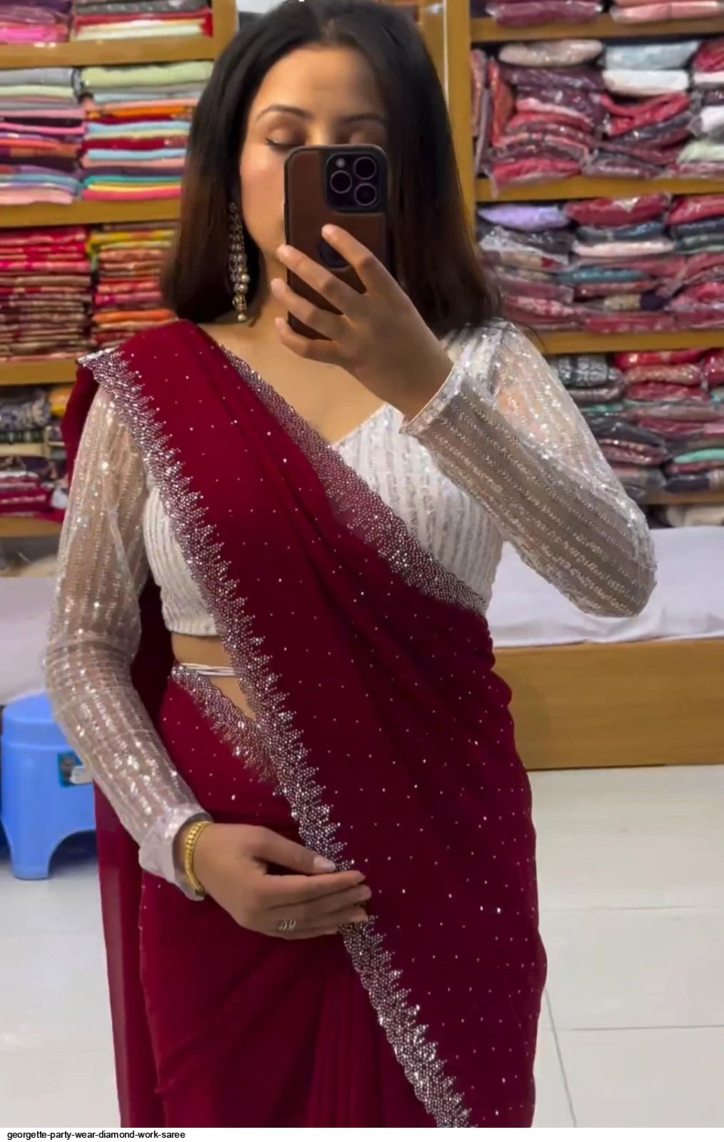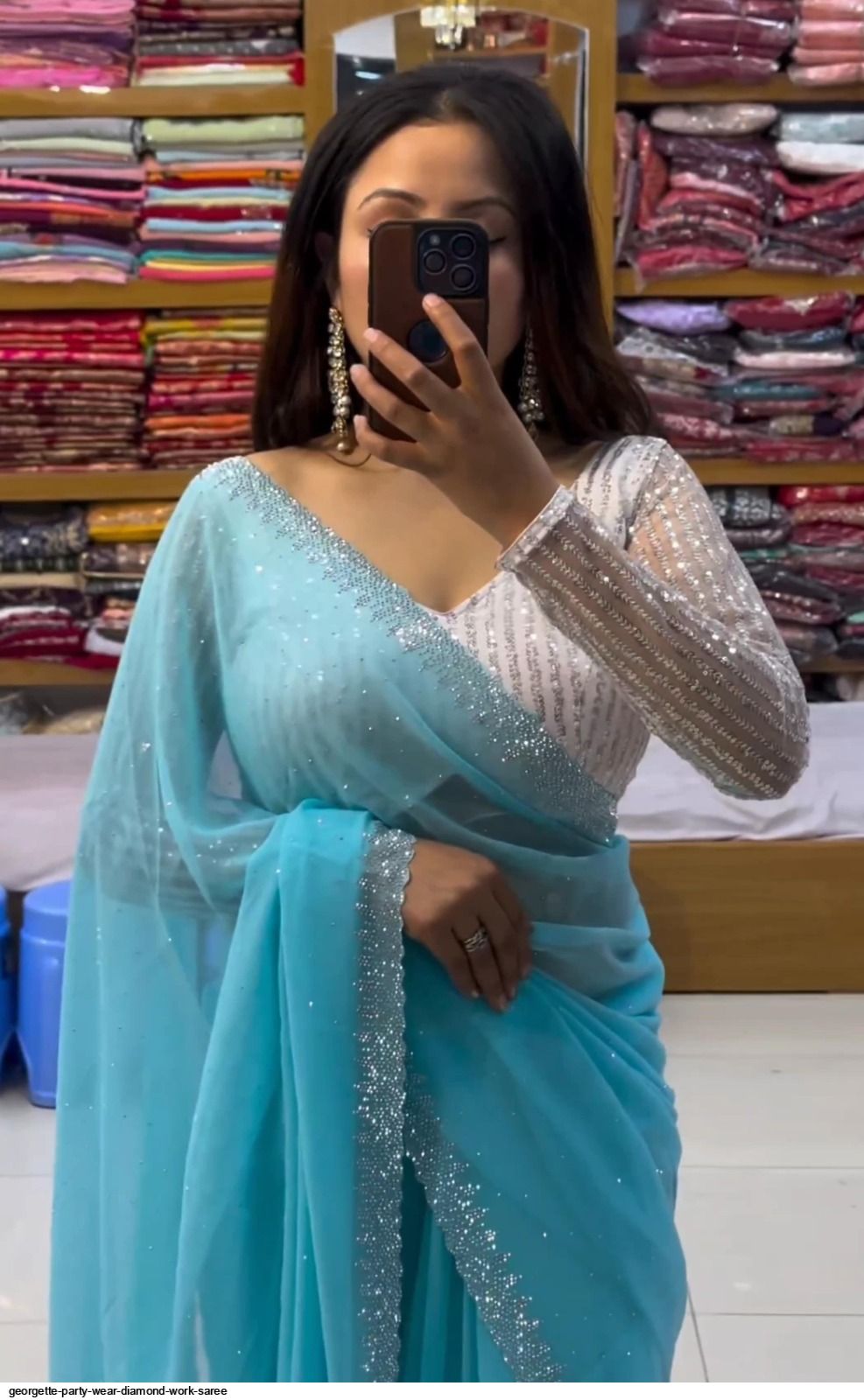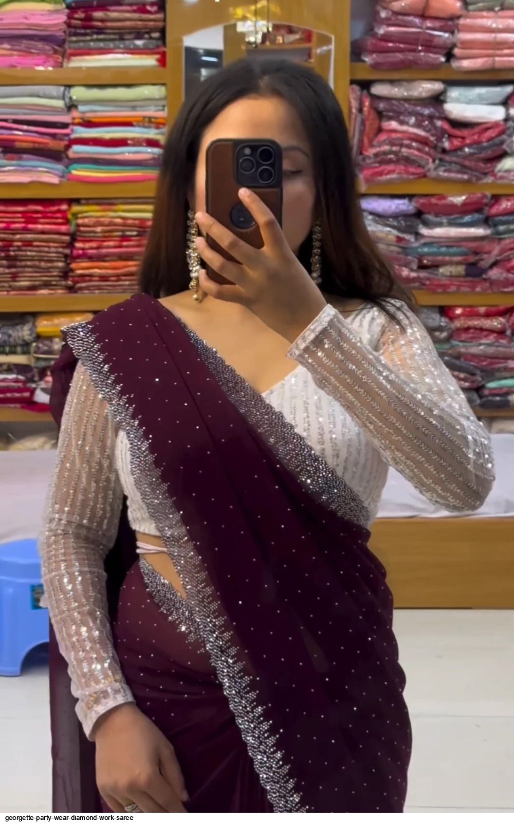 Party Wear Hotfix Diamond Work Georgette Saree with Sequined Blouse