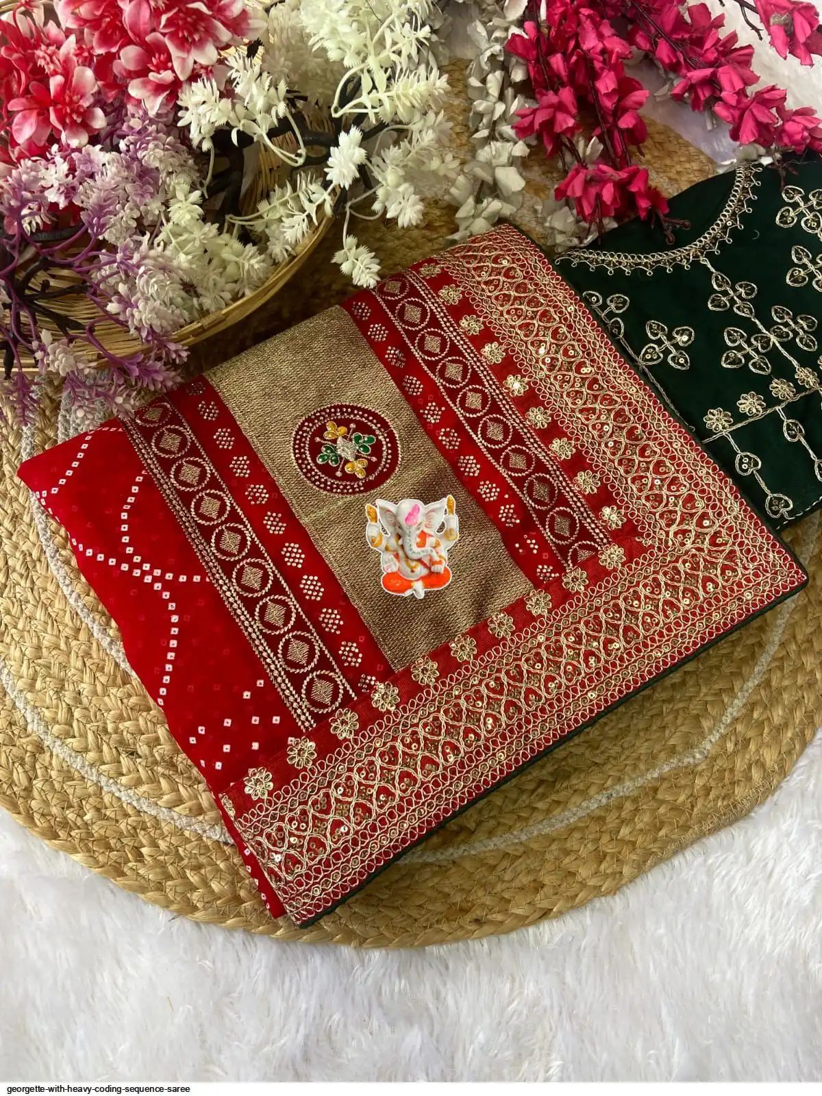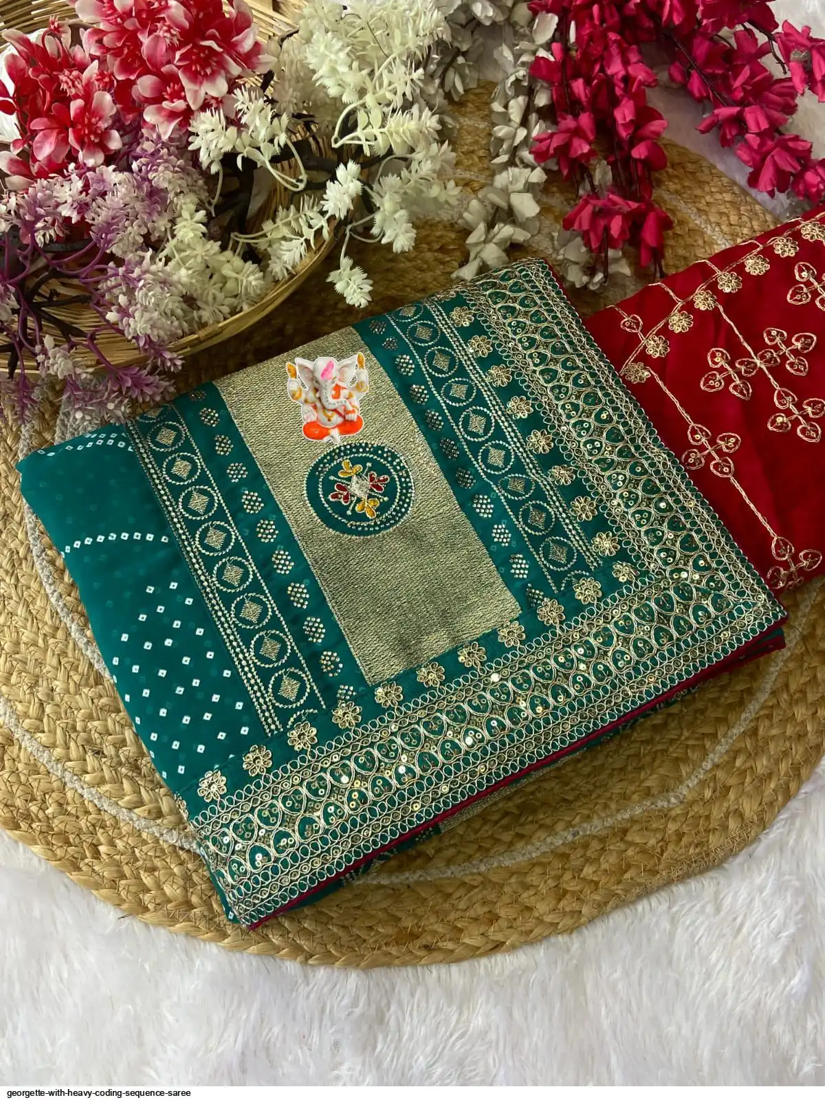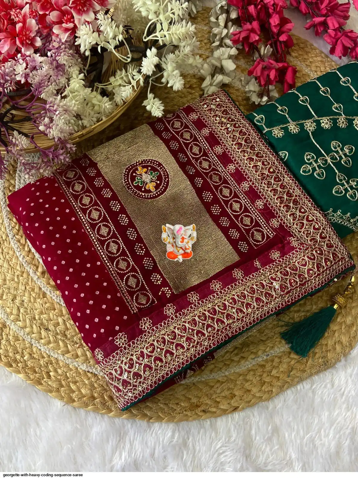 Fabric 60 gram georgette with heavy Coding Sequence border with beautiful box pallu and bandhani foil print with heavy Coding Sequence blouse