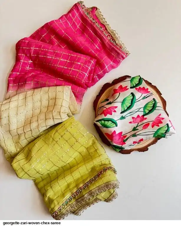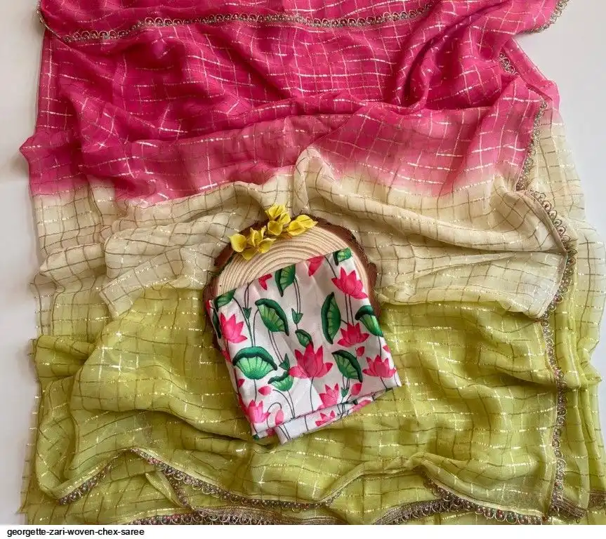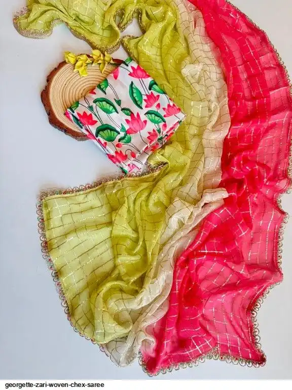 Georgette zari woven Chex saree with type and dye tri color shaded pattern and teamed with perfectly matched colour moti and stone lace ..