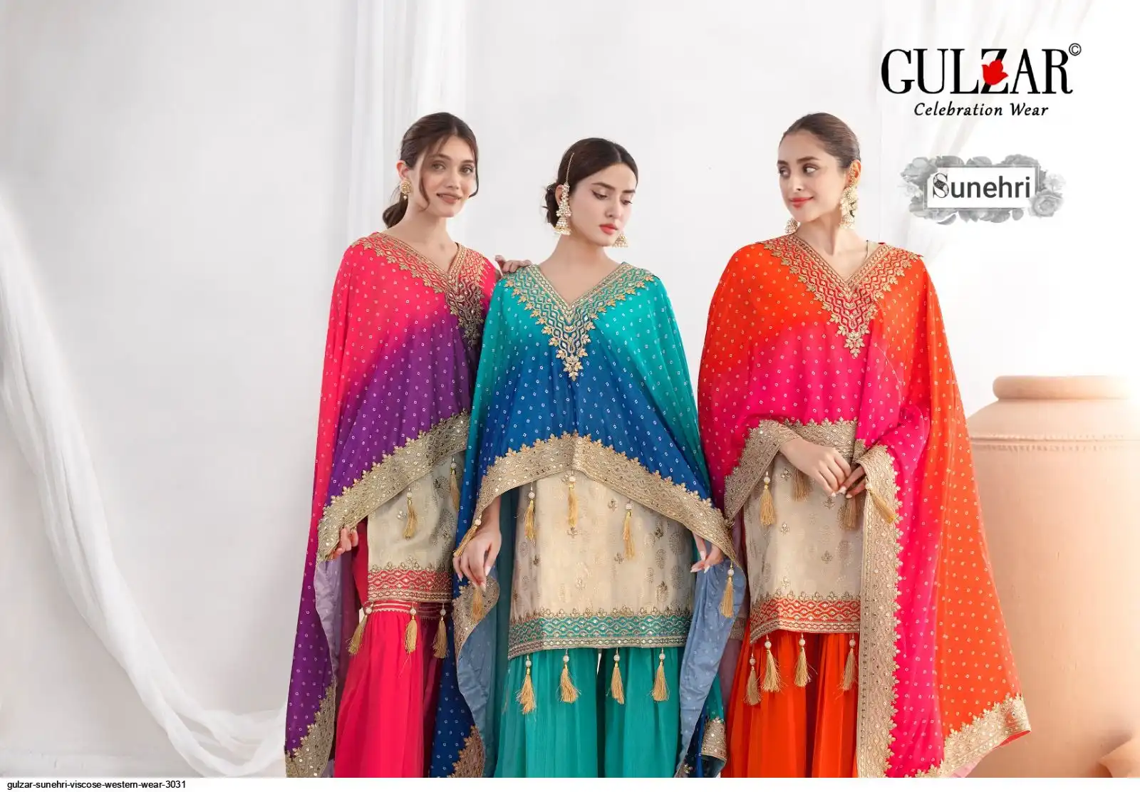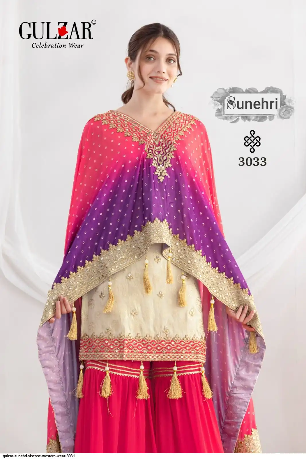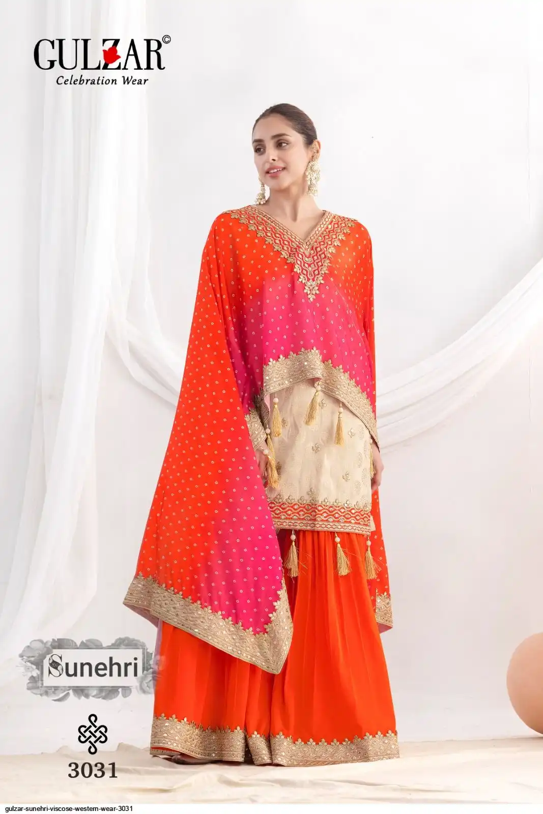 Bottom: Traditional sharara on premium chinnon fabric with mirror style embroidery and Gota Lace