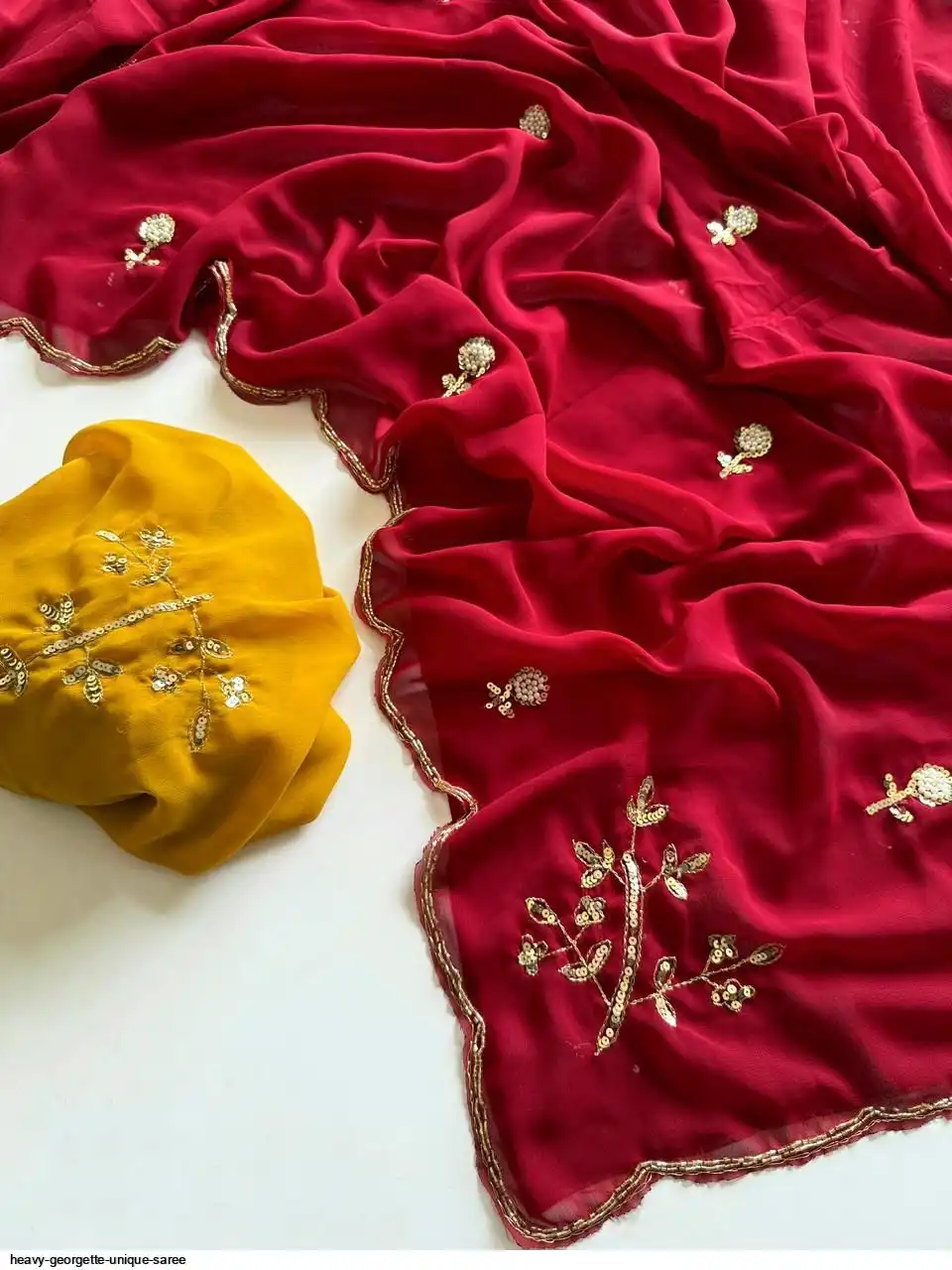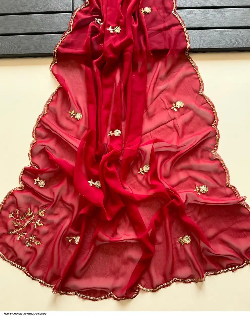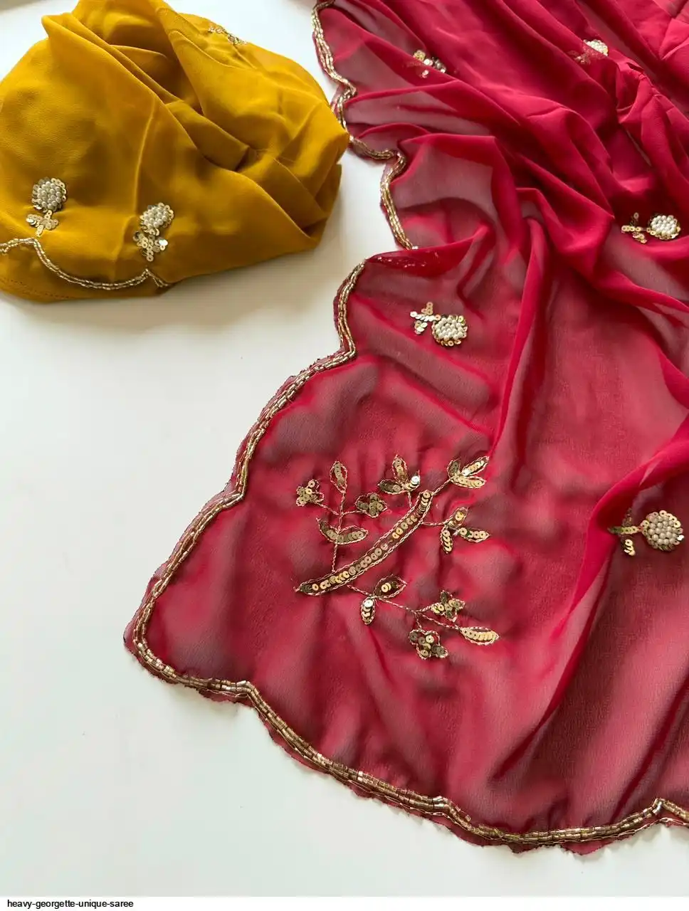 Fabric - Heavy Georgette Fabric With Cutdana Handwork Butti In Pallu And Body With HandCutwork Border And Contrast Work Blouse