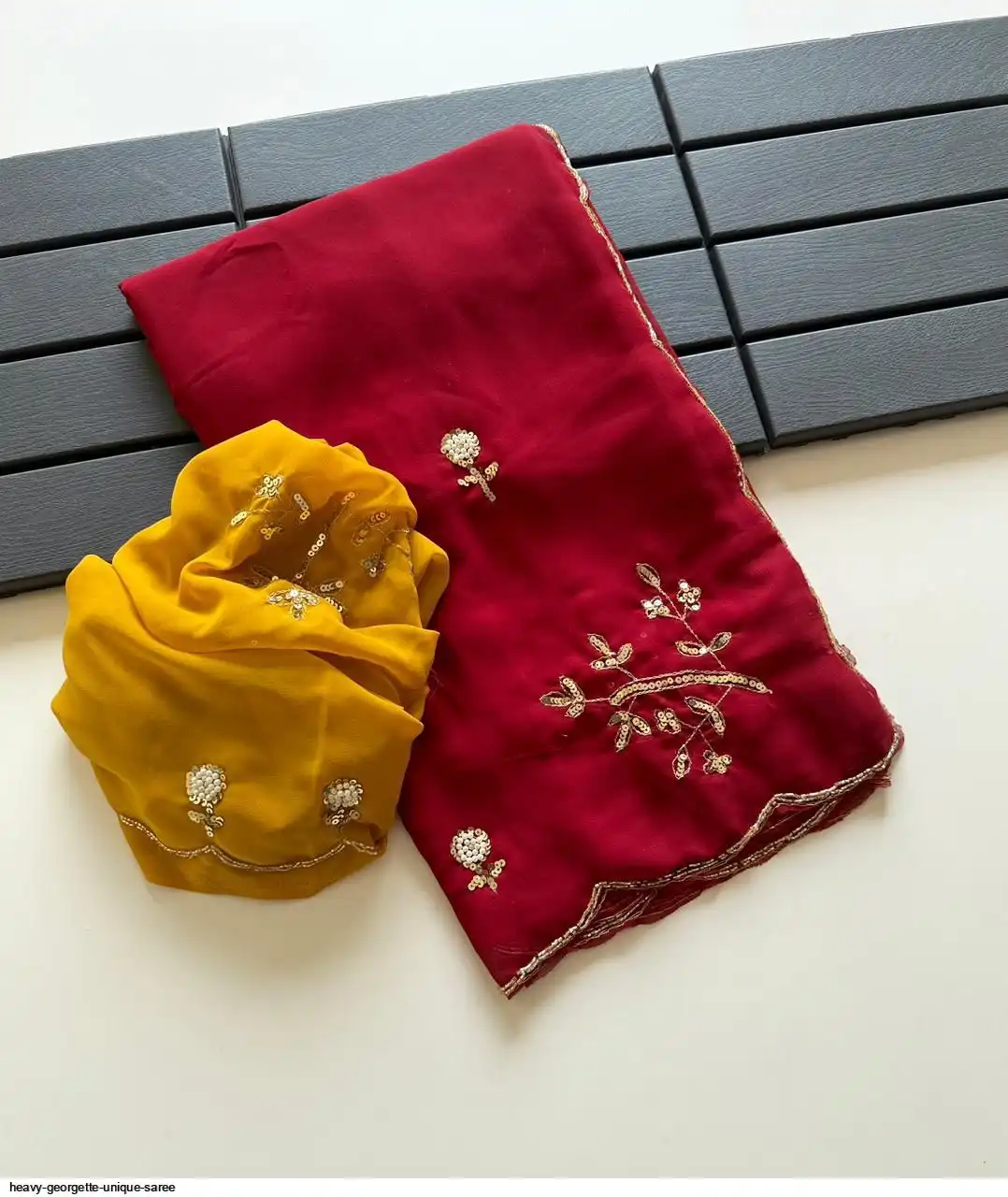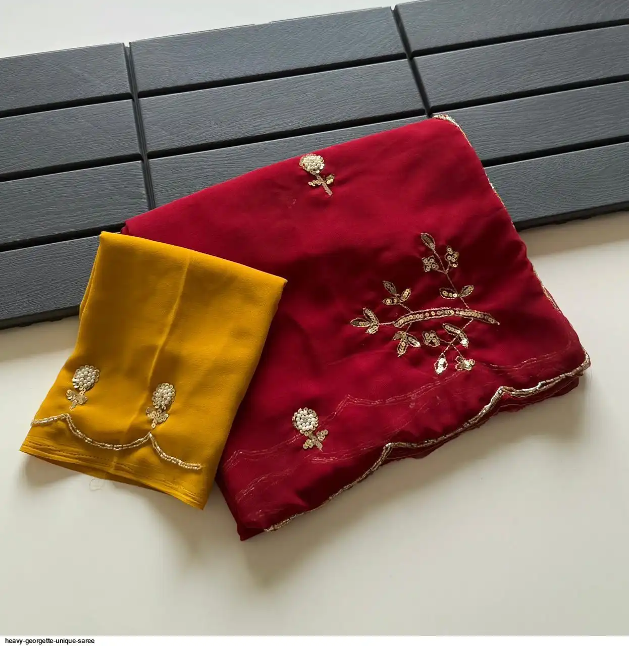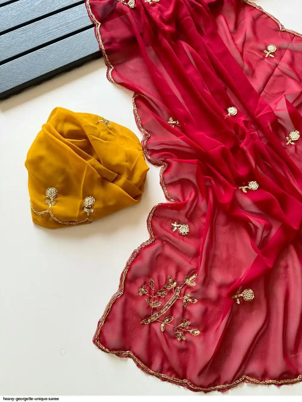 Fabric - Heavy Georgette Fabric With Cutdana Handwork Butti In Pallu And Body With HandCutwork Border And Contrast Work Blouse