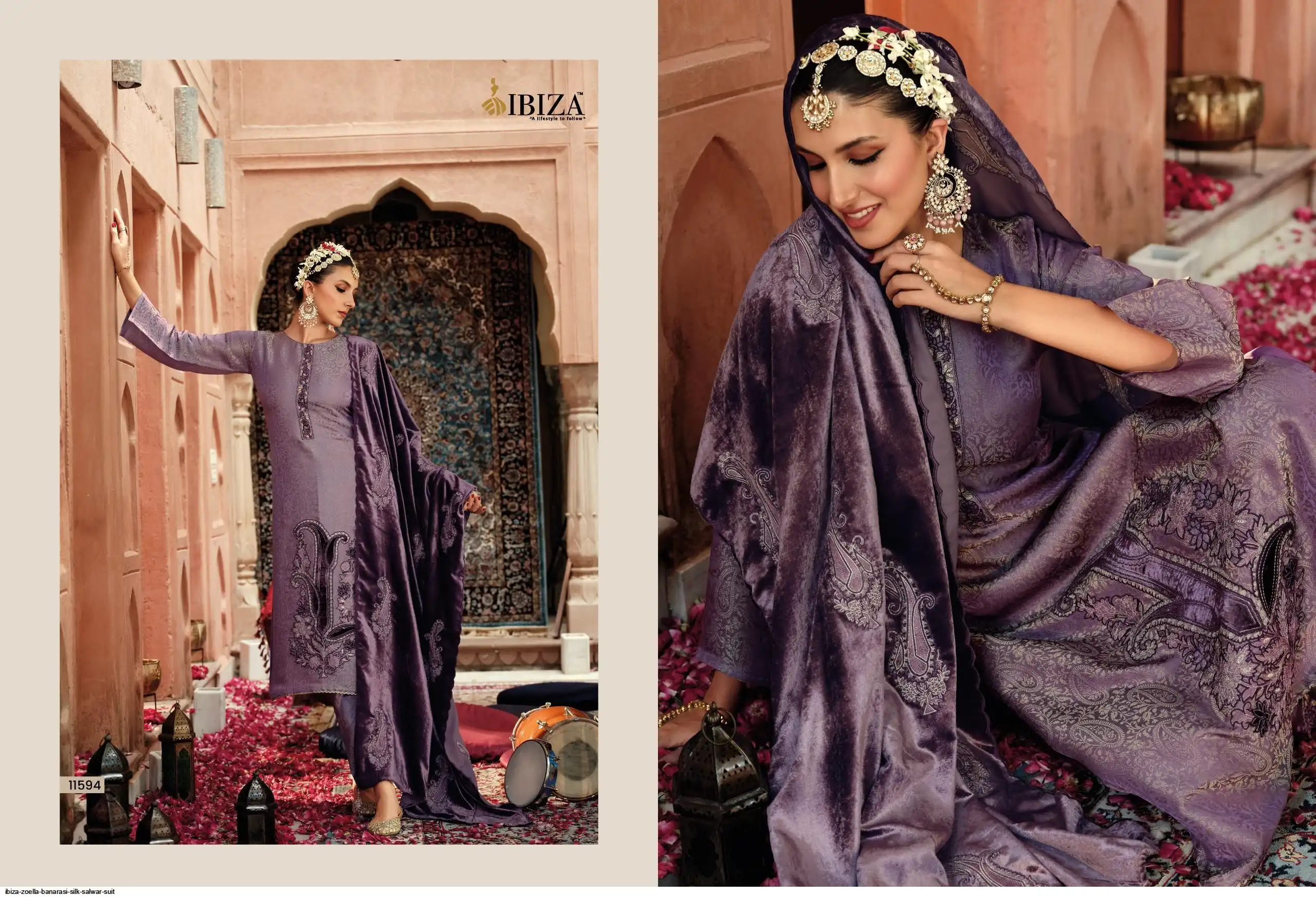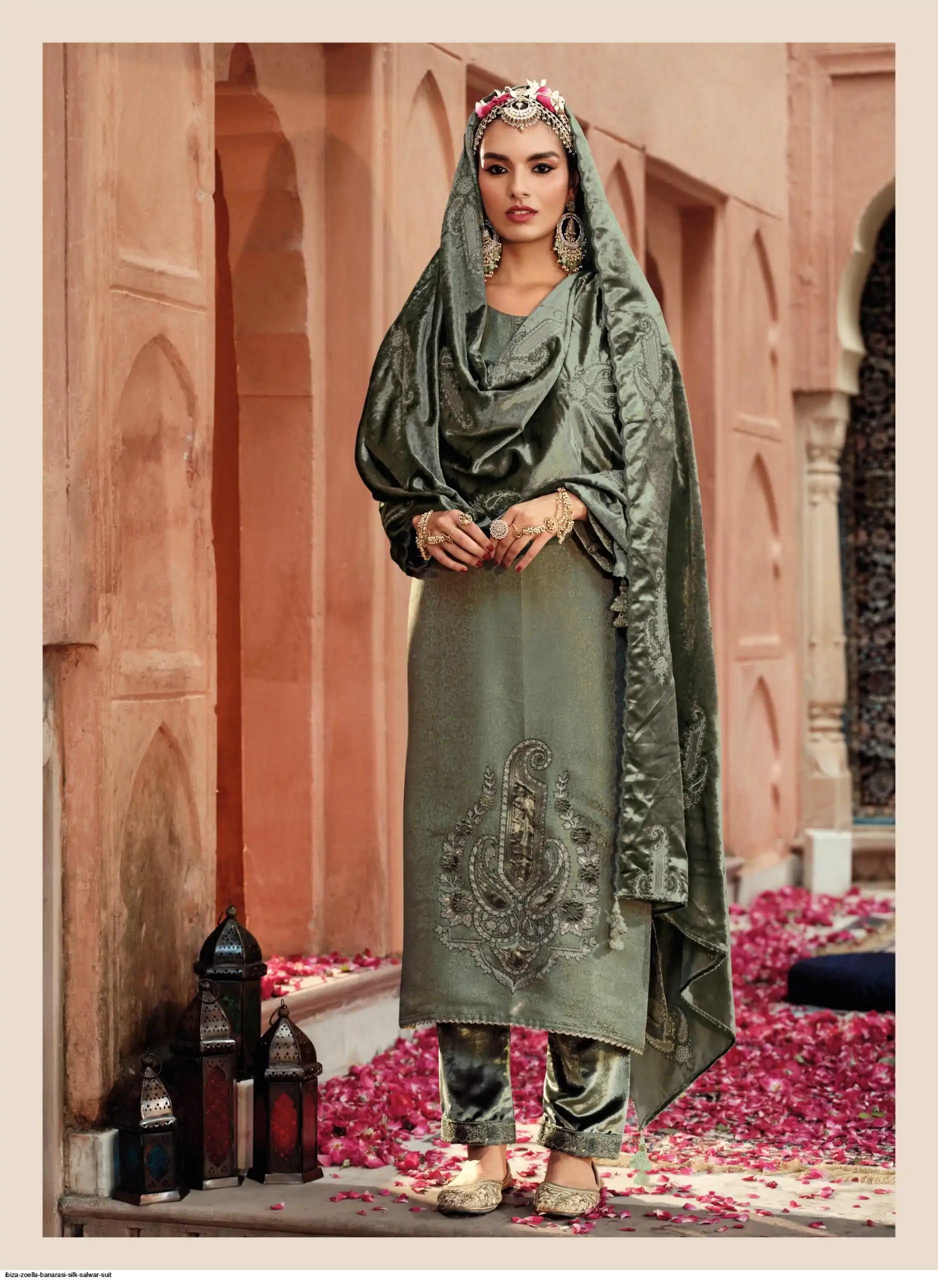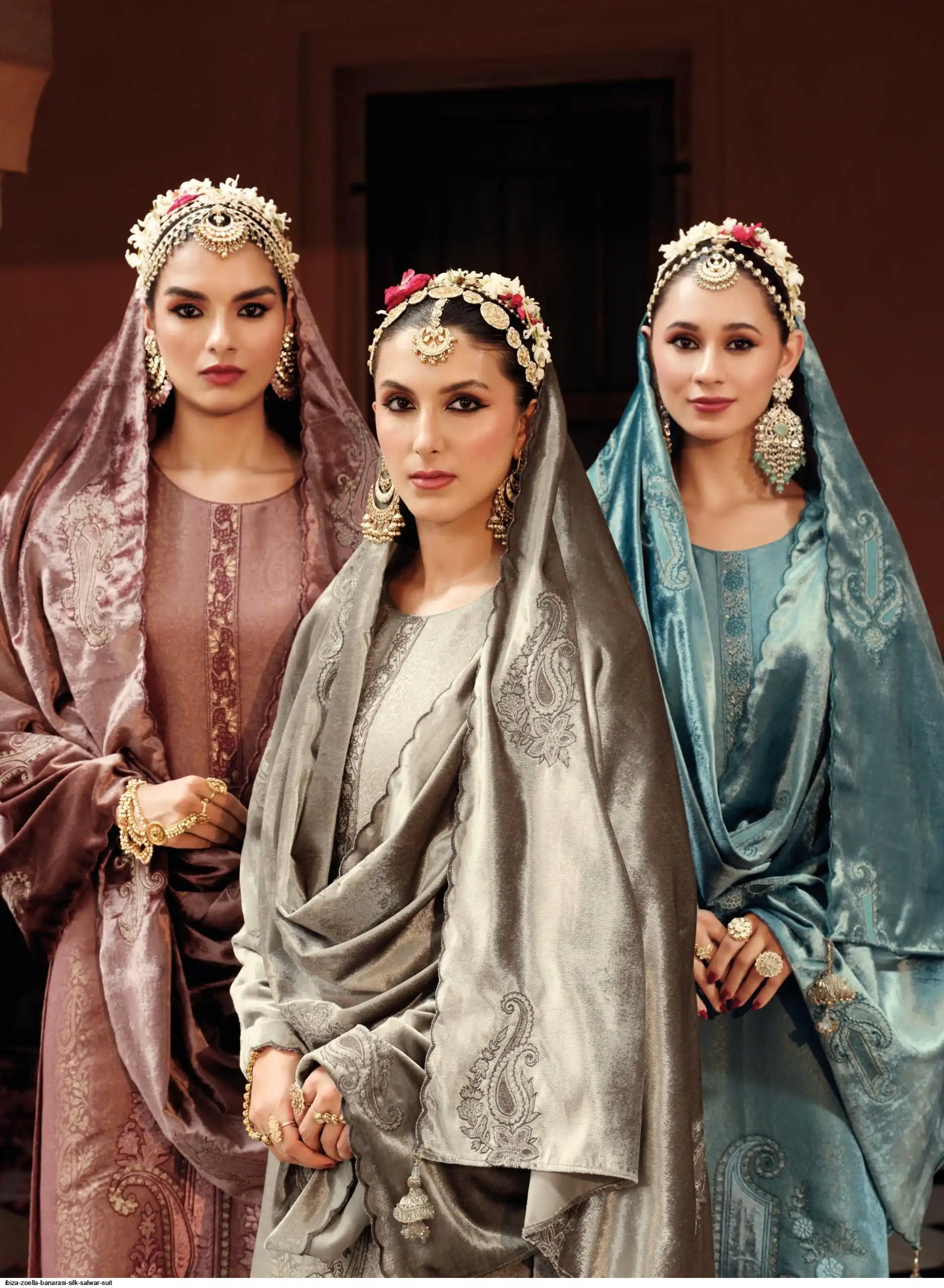 Top:-PURE BANARASI SILK SATIN SIMAR JACQUARD WITH NACK & DAMAN EMBROIDERY VELVET PACH WORK