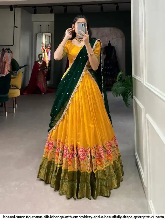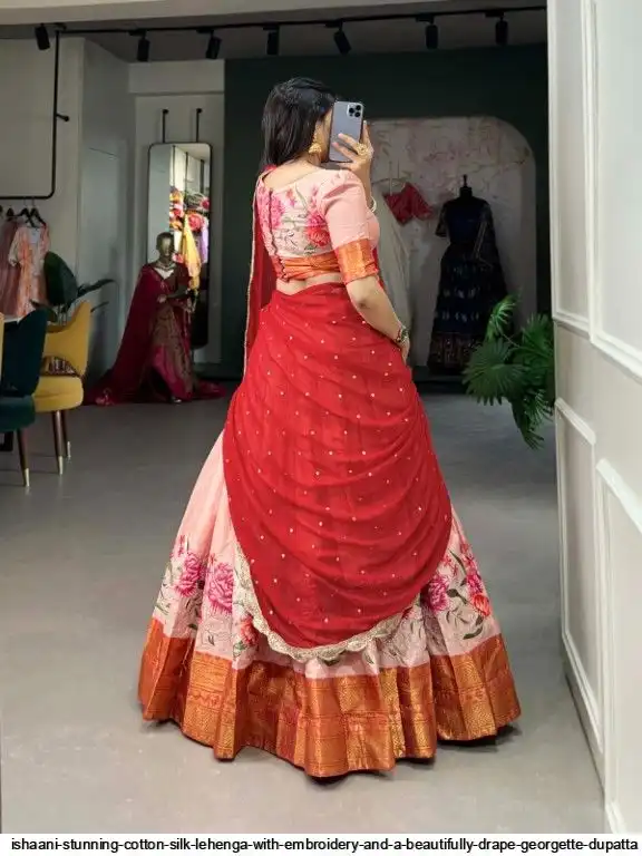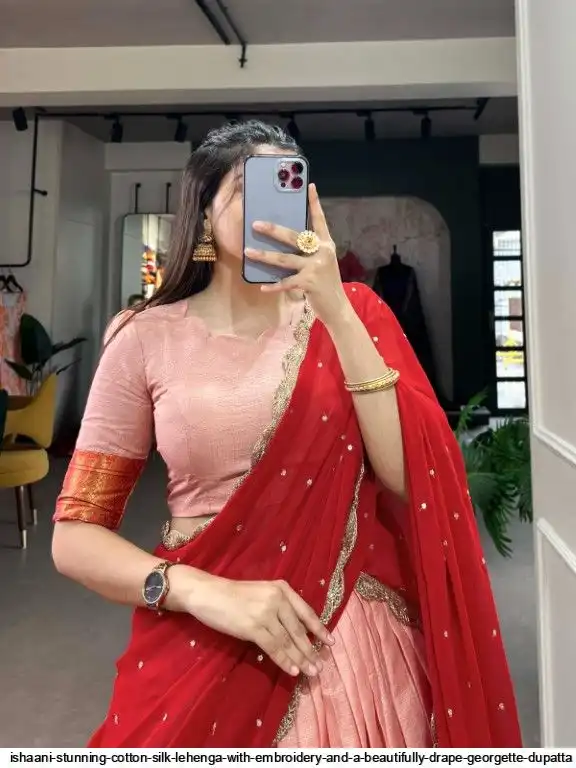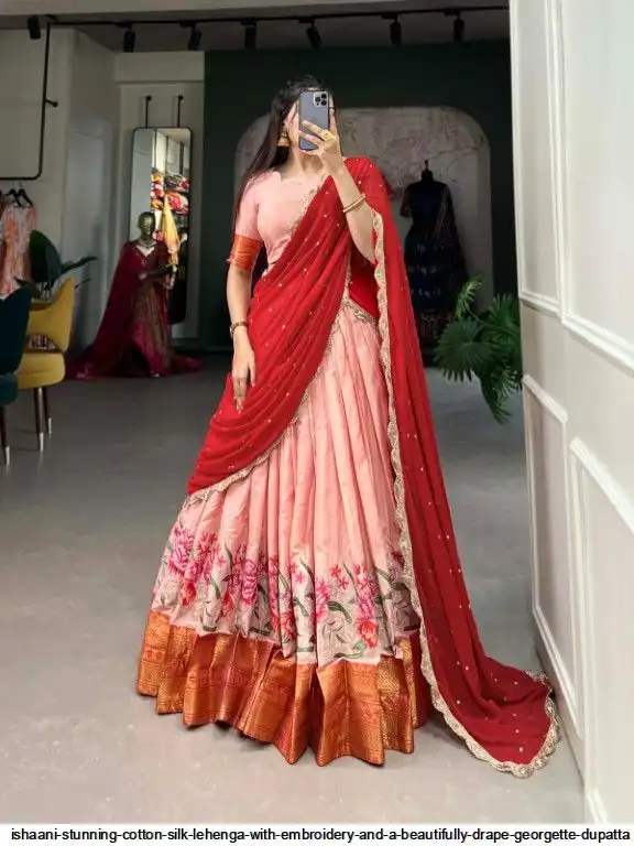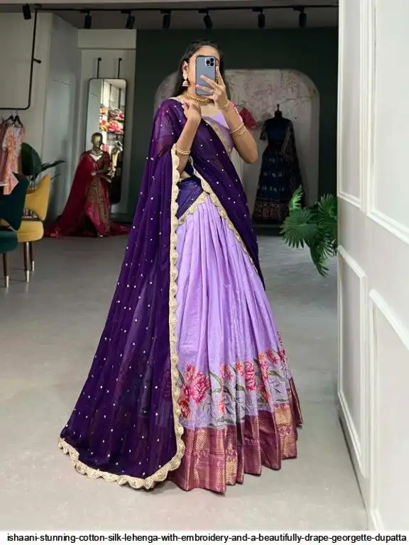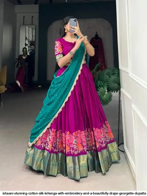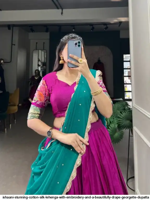 Capture Attention with Our Stunning Cotton Silk Lehenga Featuring Detailed Thread Embroidery and a Beautifully Drape Georgette Dupatta.