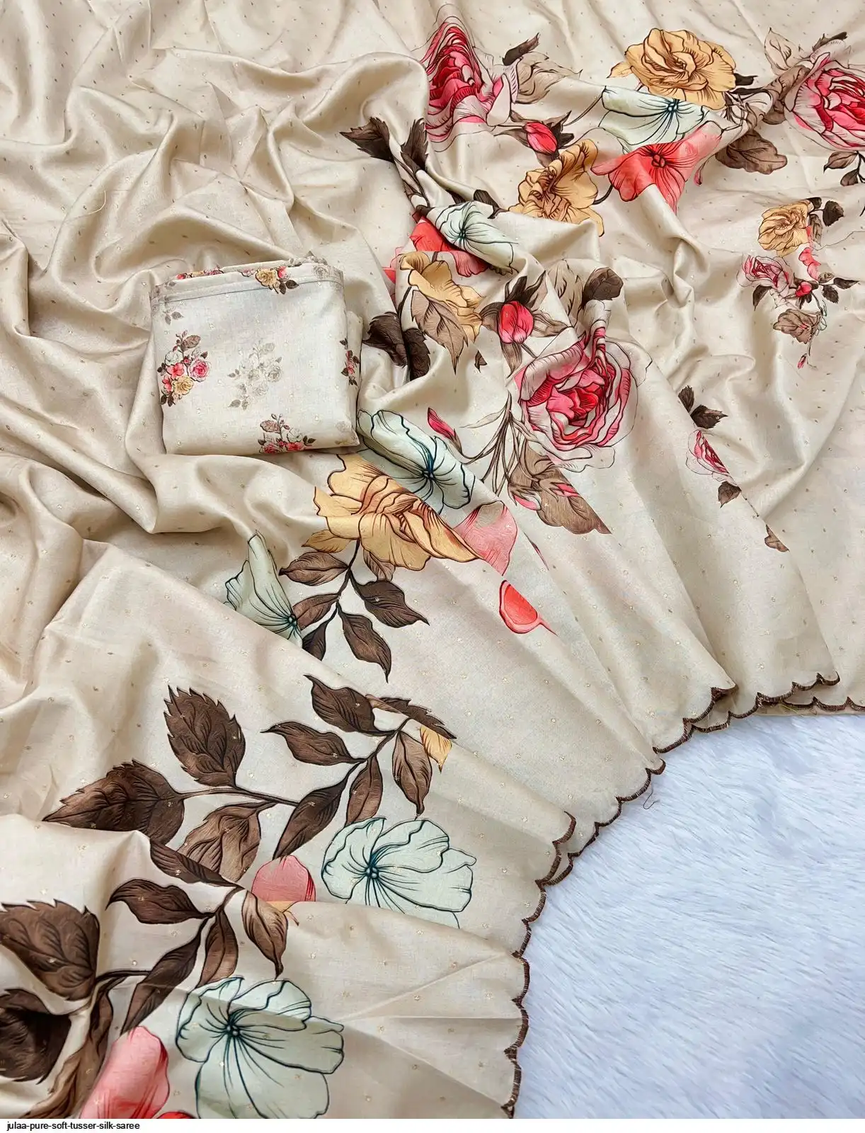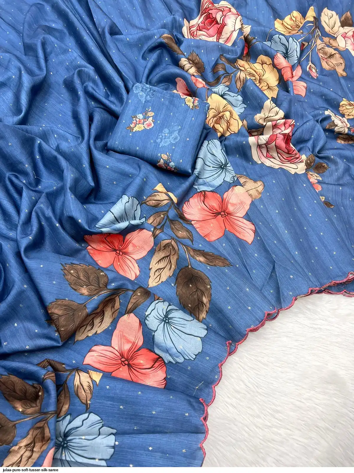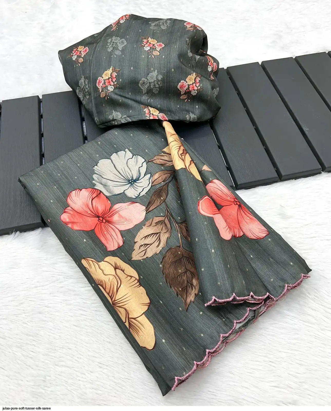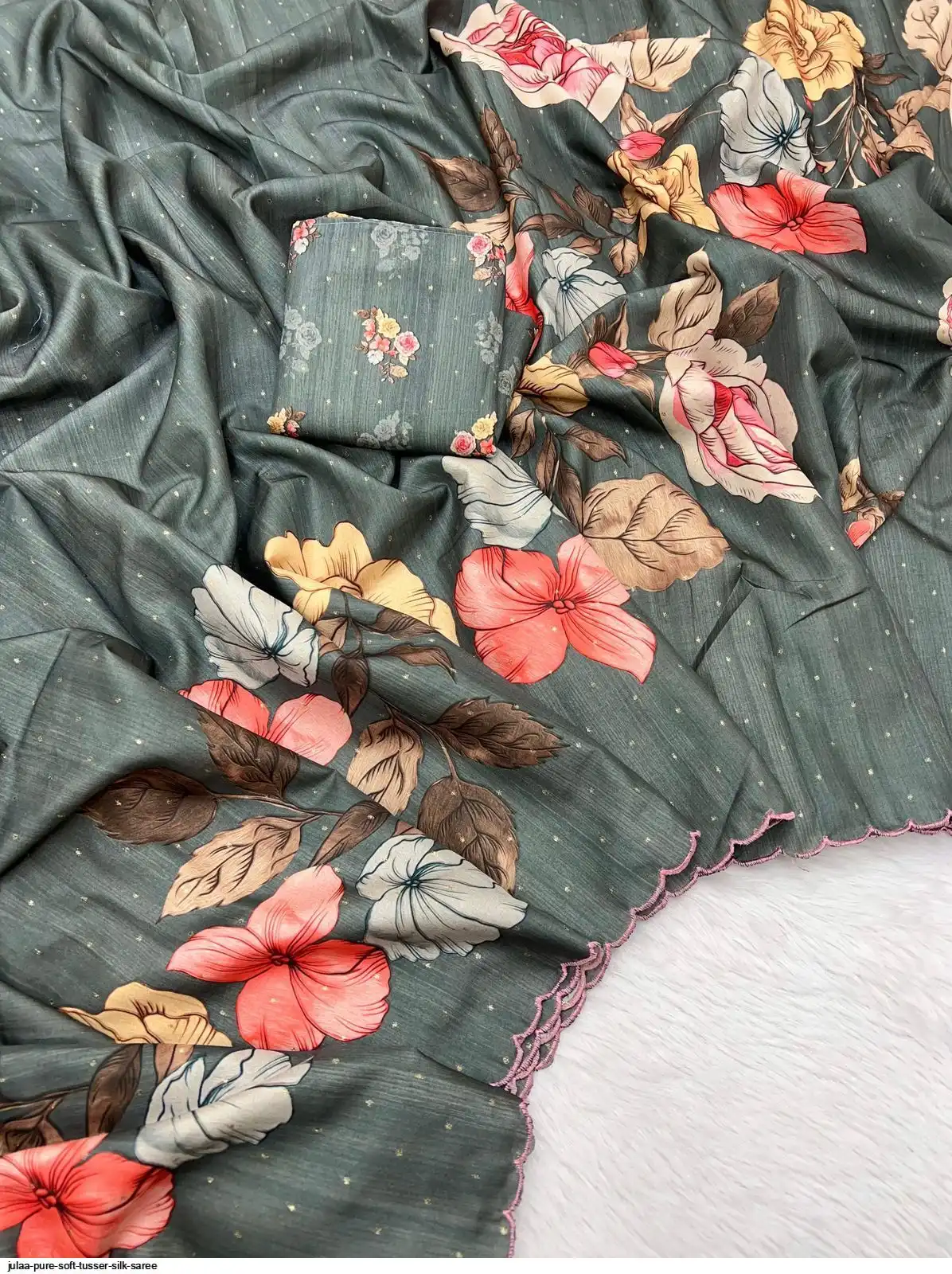 Fabric - Soft Tusser Silk Silver Weaving Butti In Body And Beautiful Floral Digital Print With Contrast Embroidery Cutworl Border And Beautiful Printed Runing Blouse