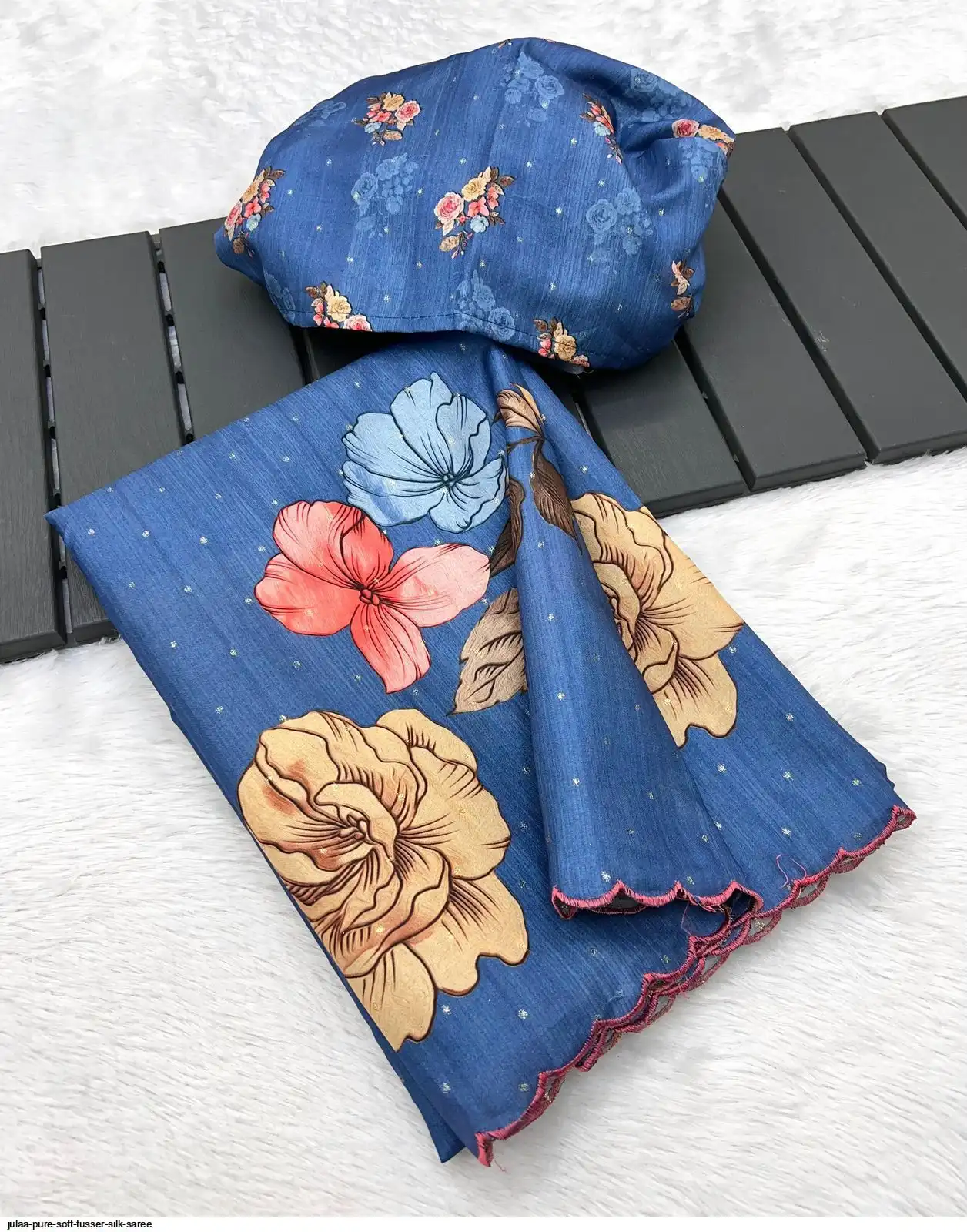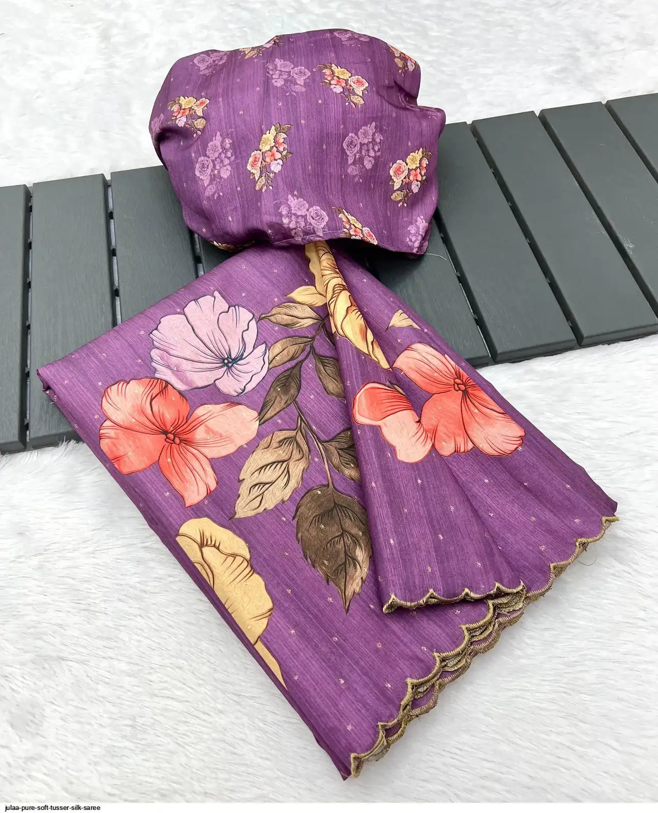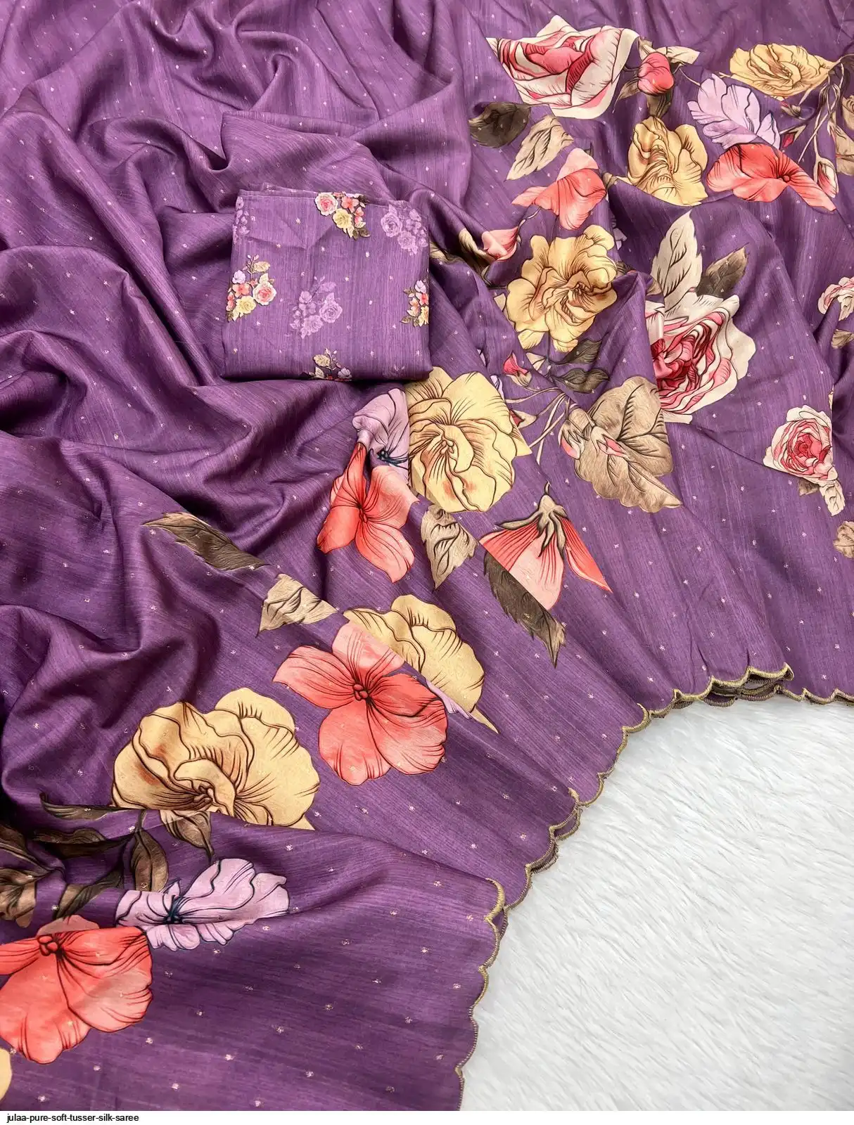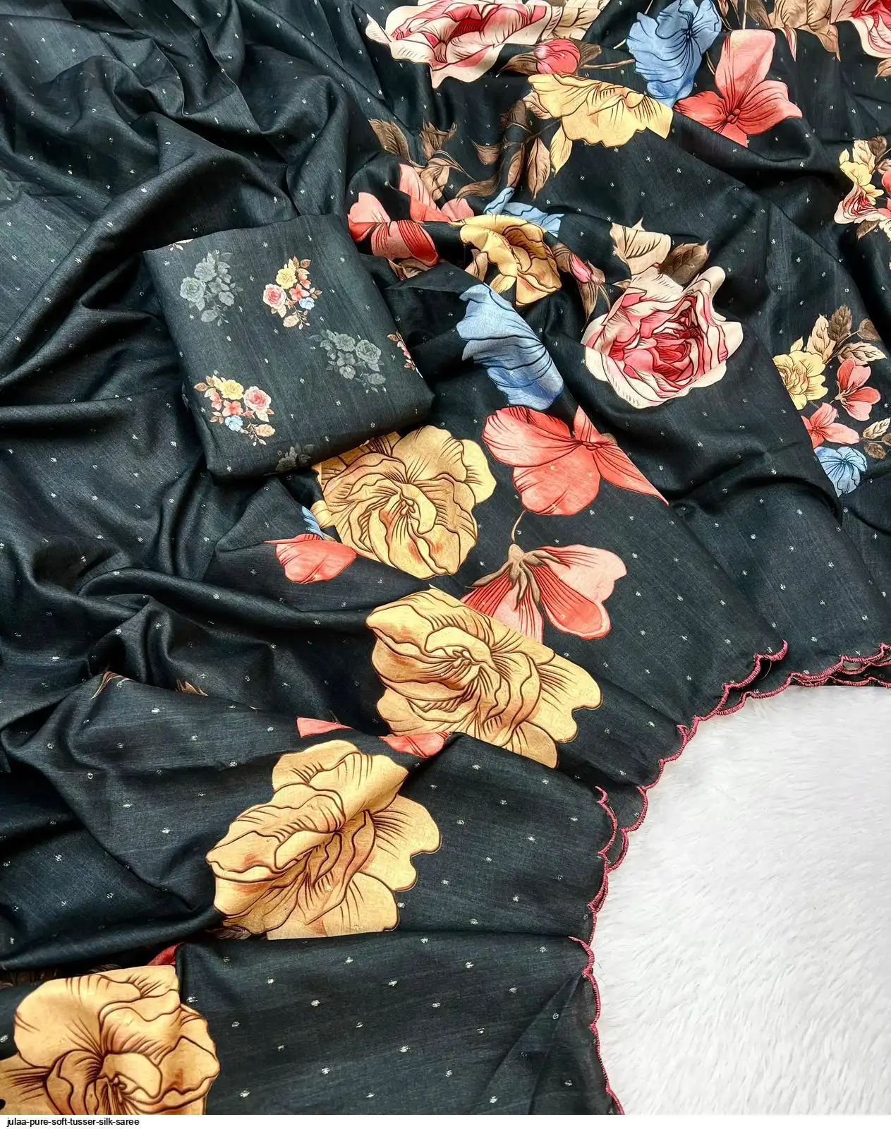 Fabric - Soft Tusser Silk Silver Weaving Butti In Body And Beautiful Floral Digital Print With Contrast Embroidery Cutworl Border And Beautiful Printed Runing Blouse