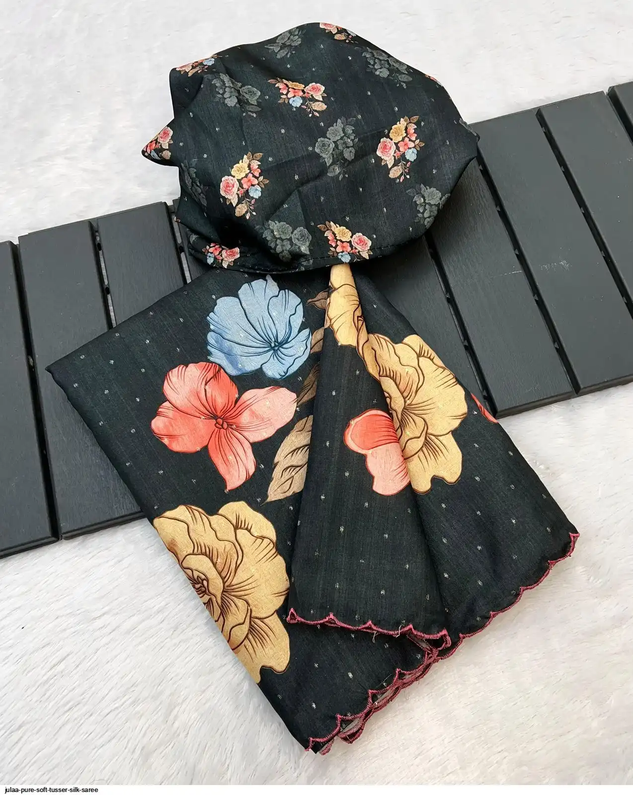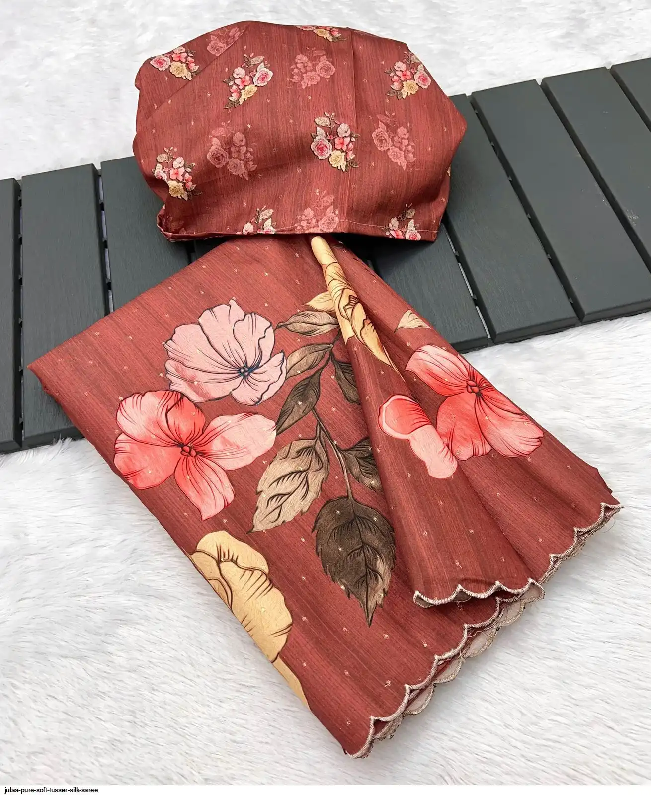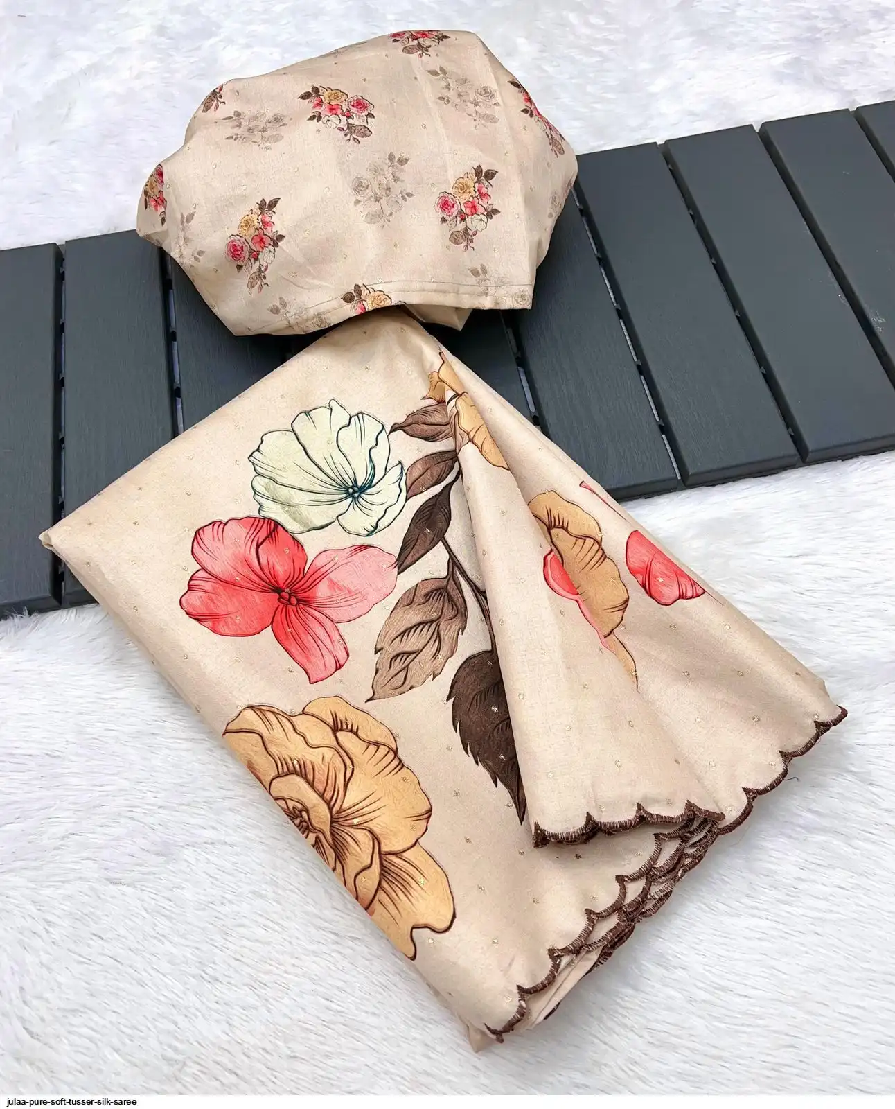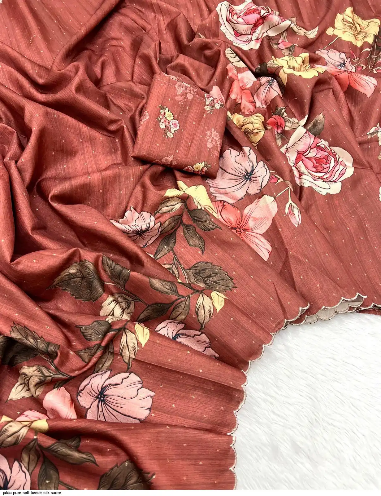 Fabric - Soft Tusser Silk Silver Weaving Butti In Body And Beautiful Floral Digital Print With Contrast Embroidery Cutworl Border And Beautiful Printed Runing Blouse