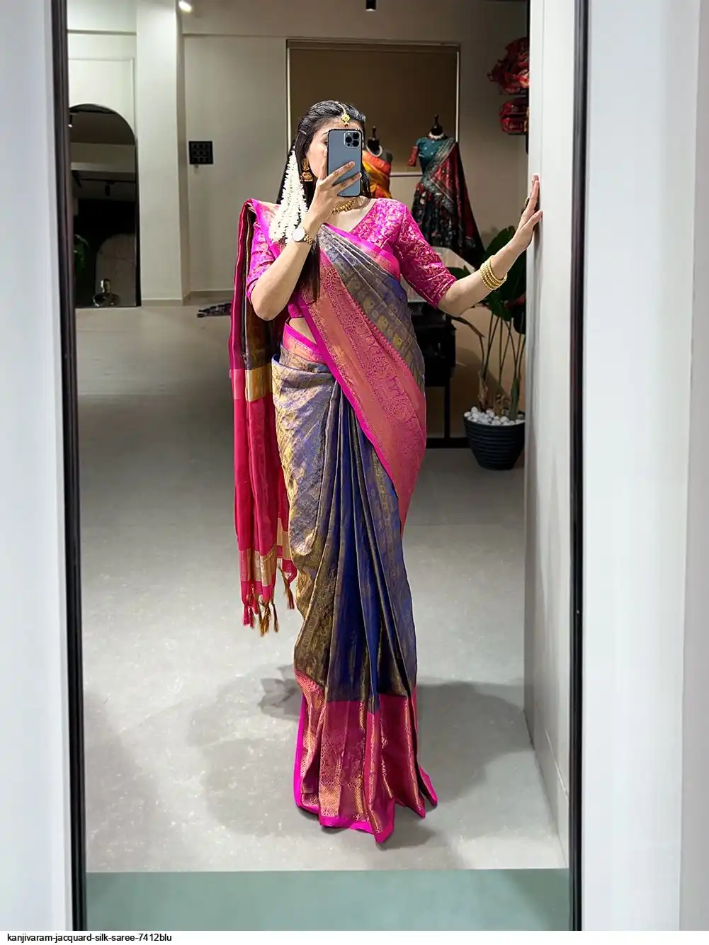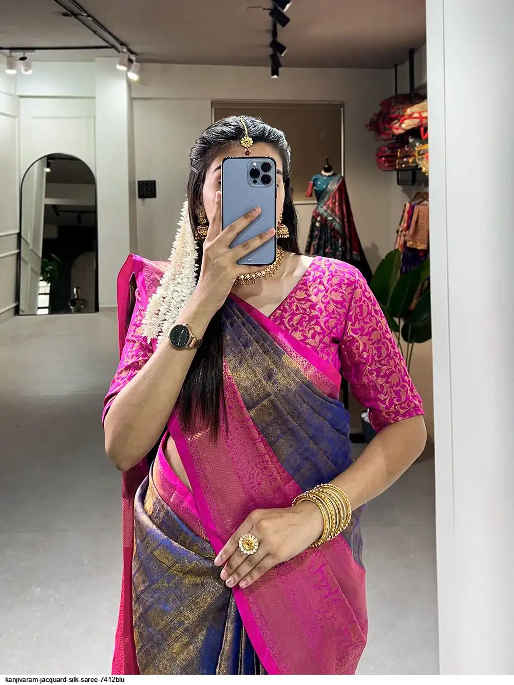 Kanjivaram saree embodies the epitome of timeless beauty and cultural heritage. with intricate motifs and vibrant hues, she exudes grace and elegance, reflecting the rich traditions of her land