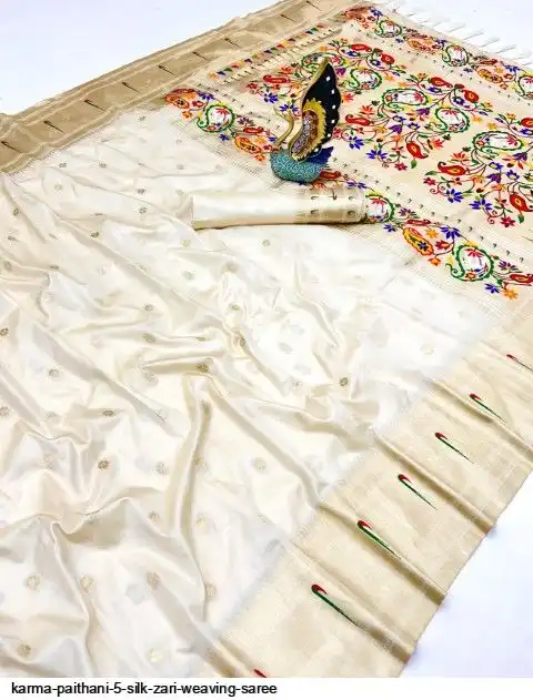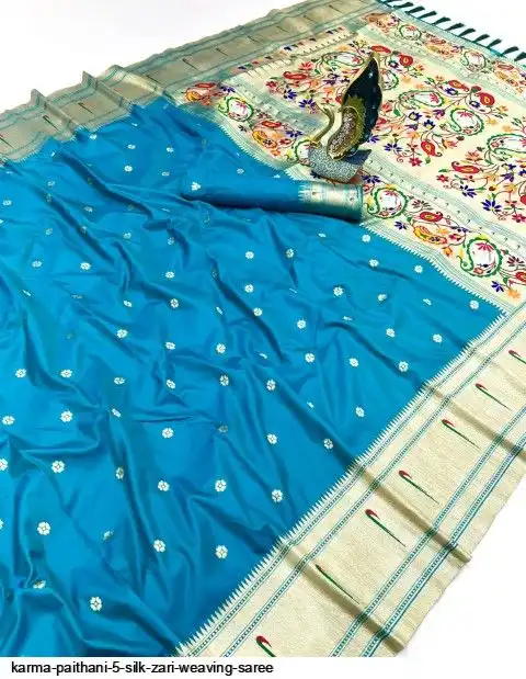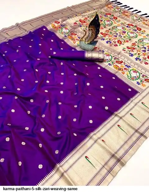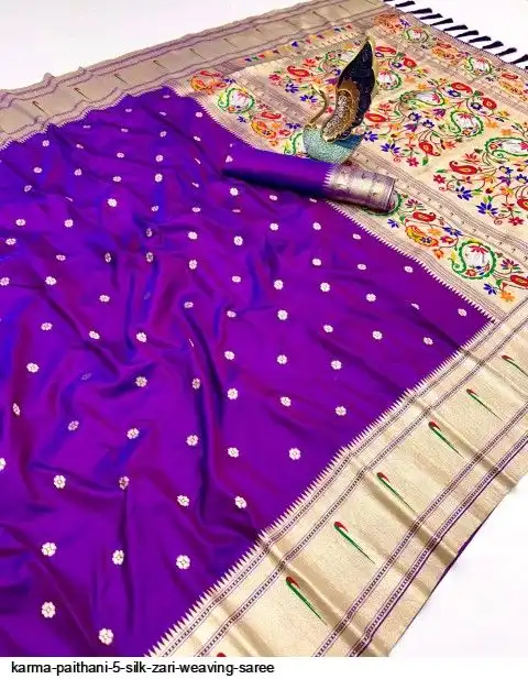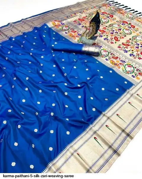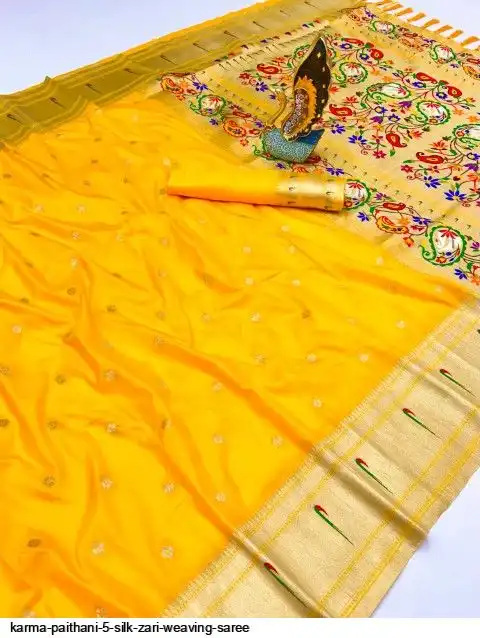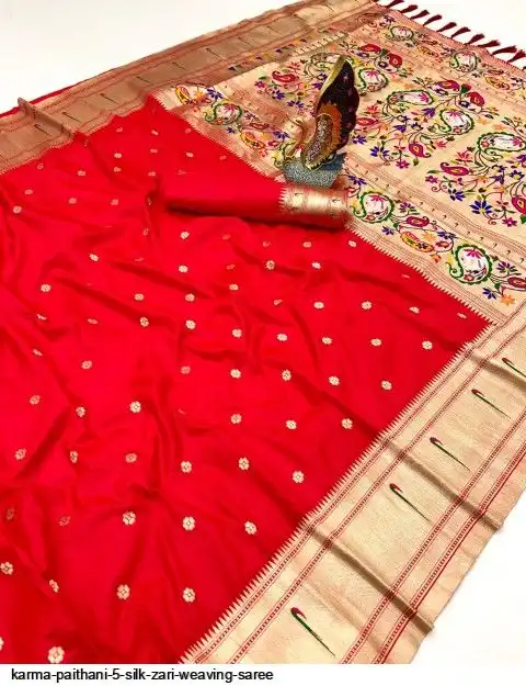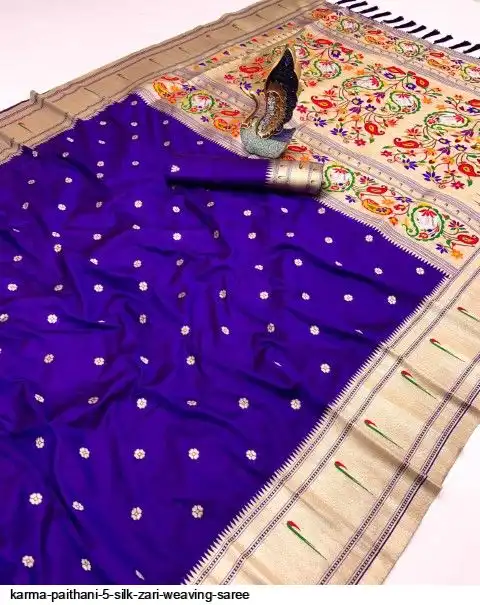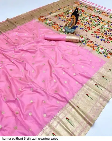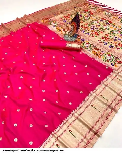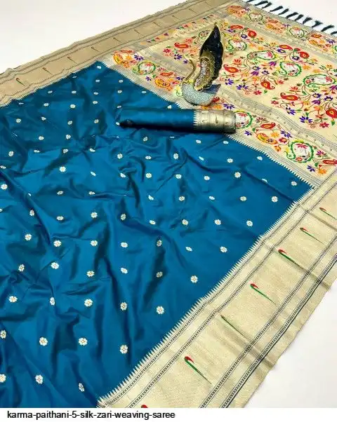 Saree :- A Pethani silk saree are woven using silk yarn and embellished with golden zari & Meenakari threads unique Motifs.