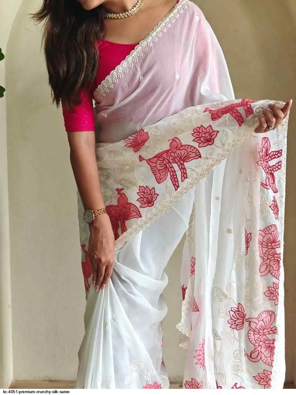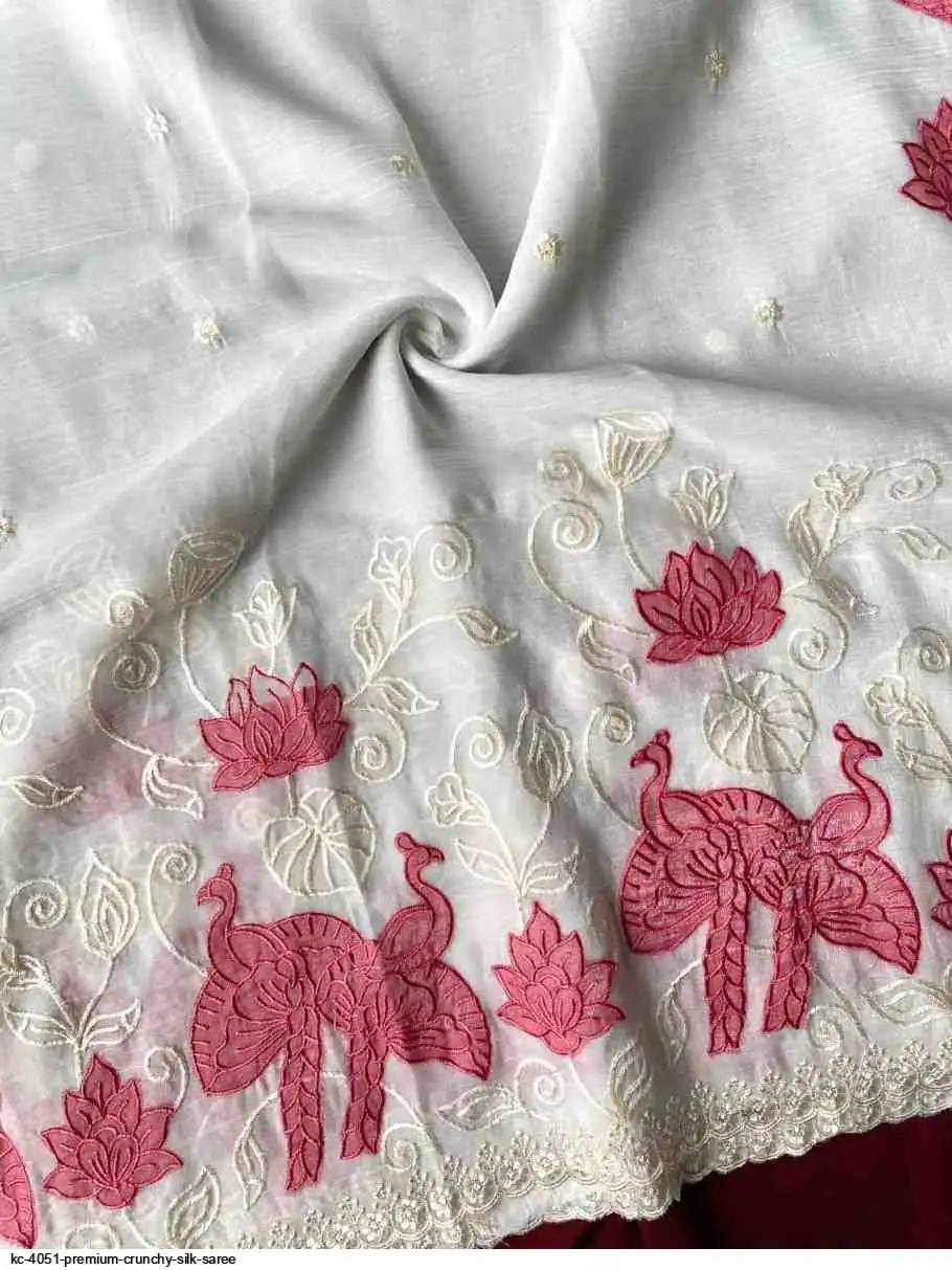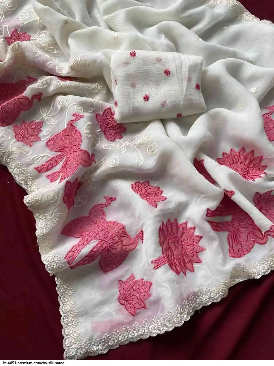 Premium crunchy silk Saree with applique work pattern all over the Saree with embroidery and scallop Border all over.