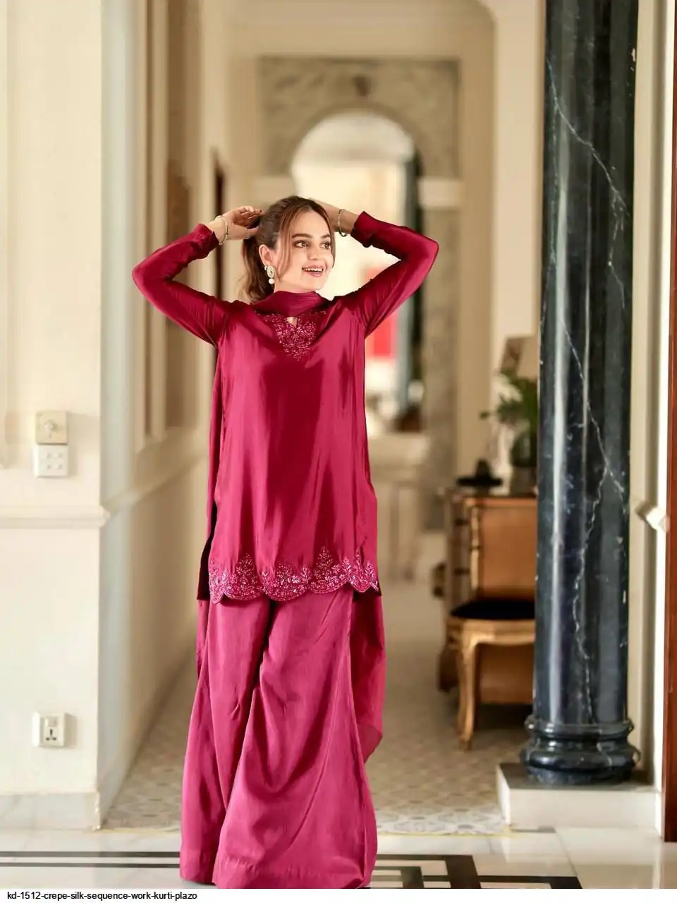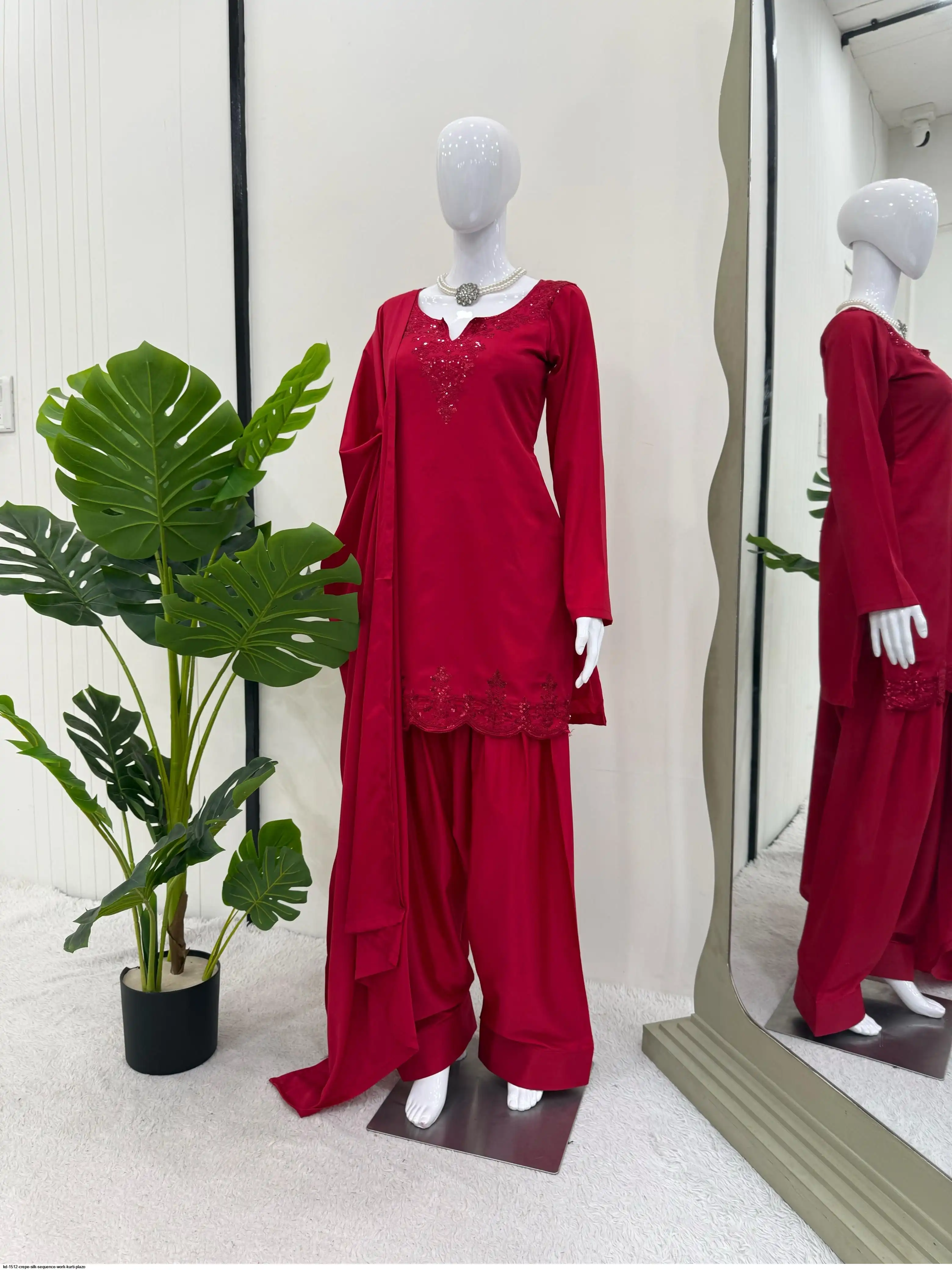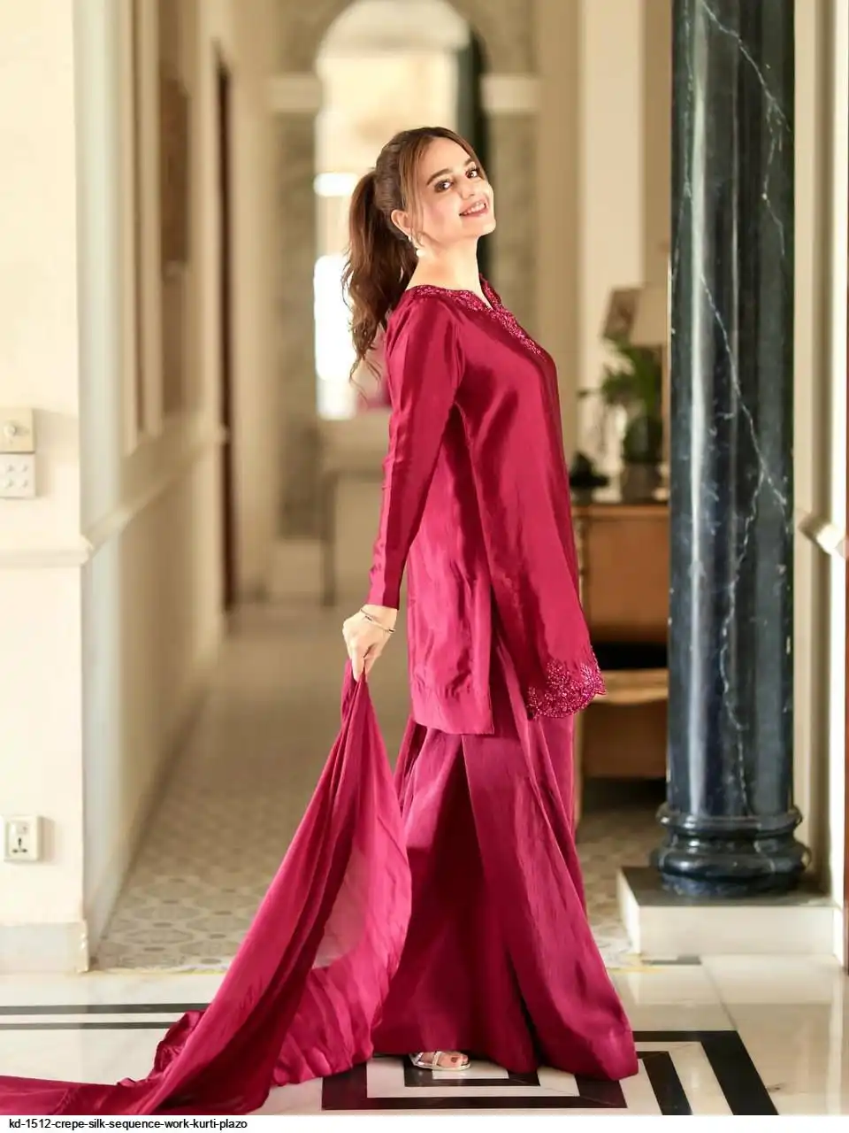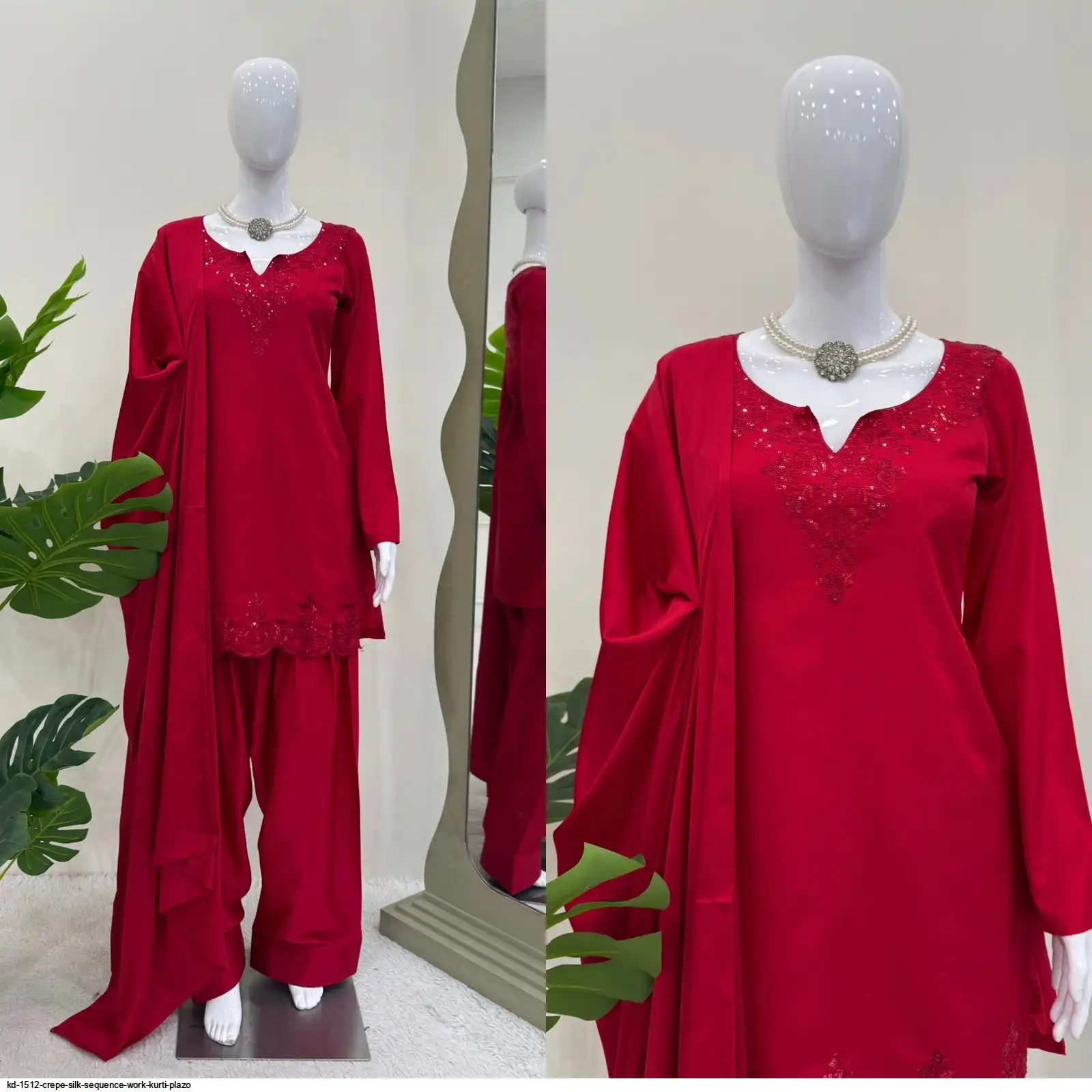 Looking for this same colour beautiful Designer Suit on Natural Crep Silk febric With Inner and Thred & Sequnce work Farshi Plazoo On also Natural Crep Silk Febric and Dupatta on Also Natural Crep febric.
