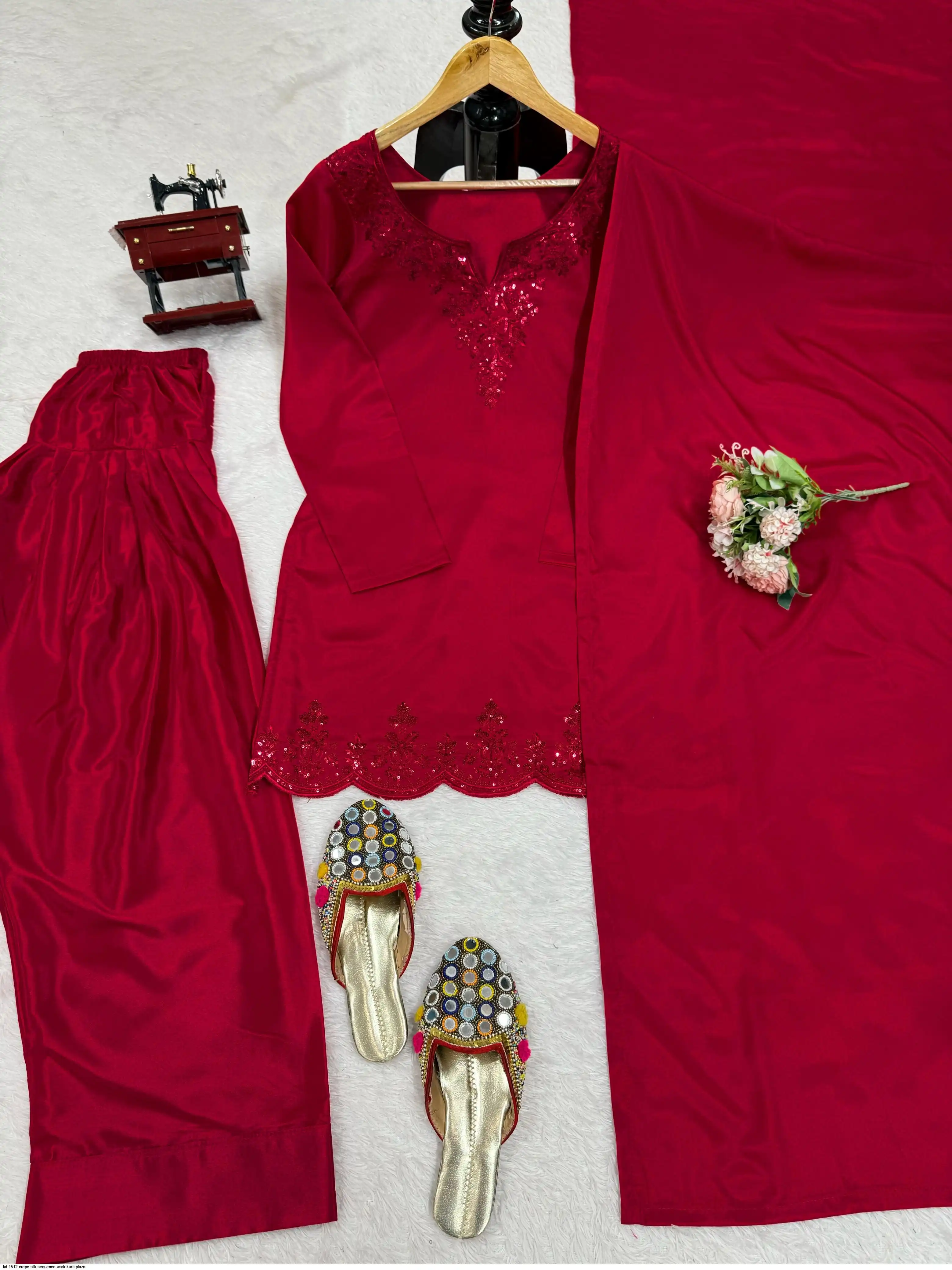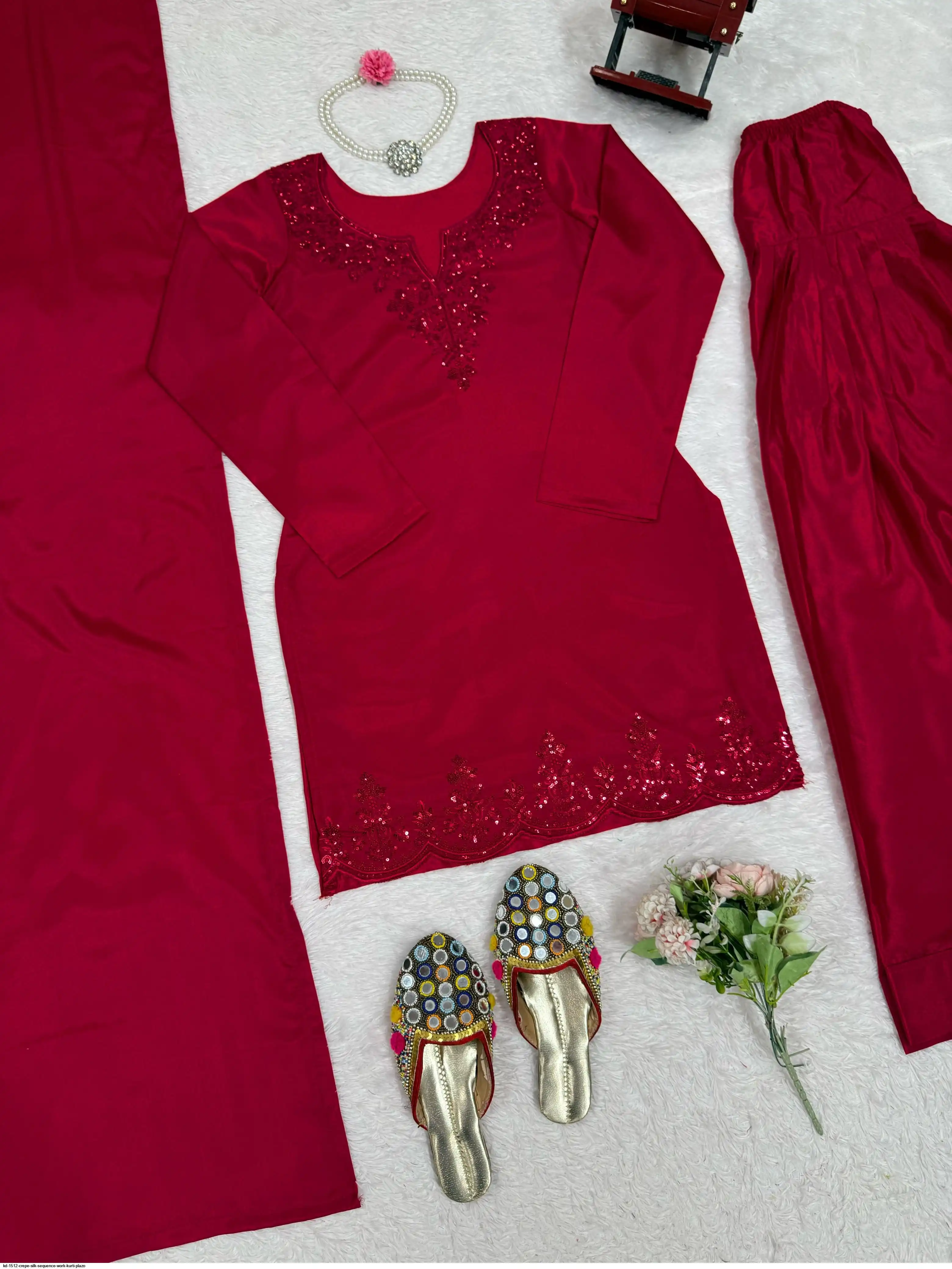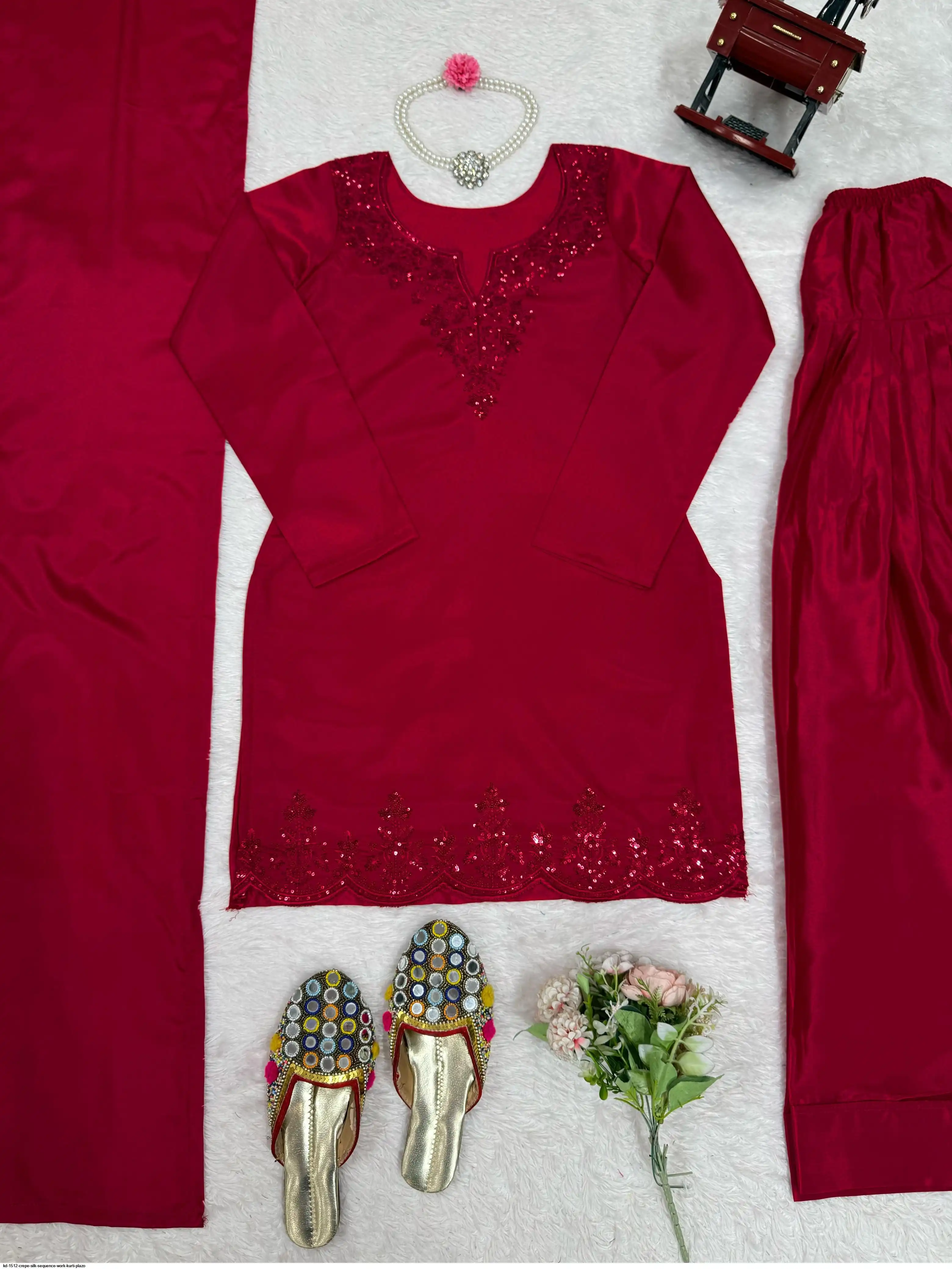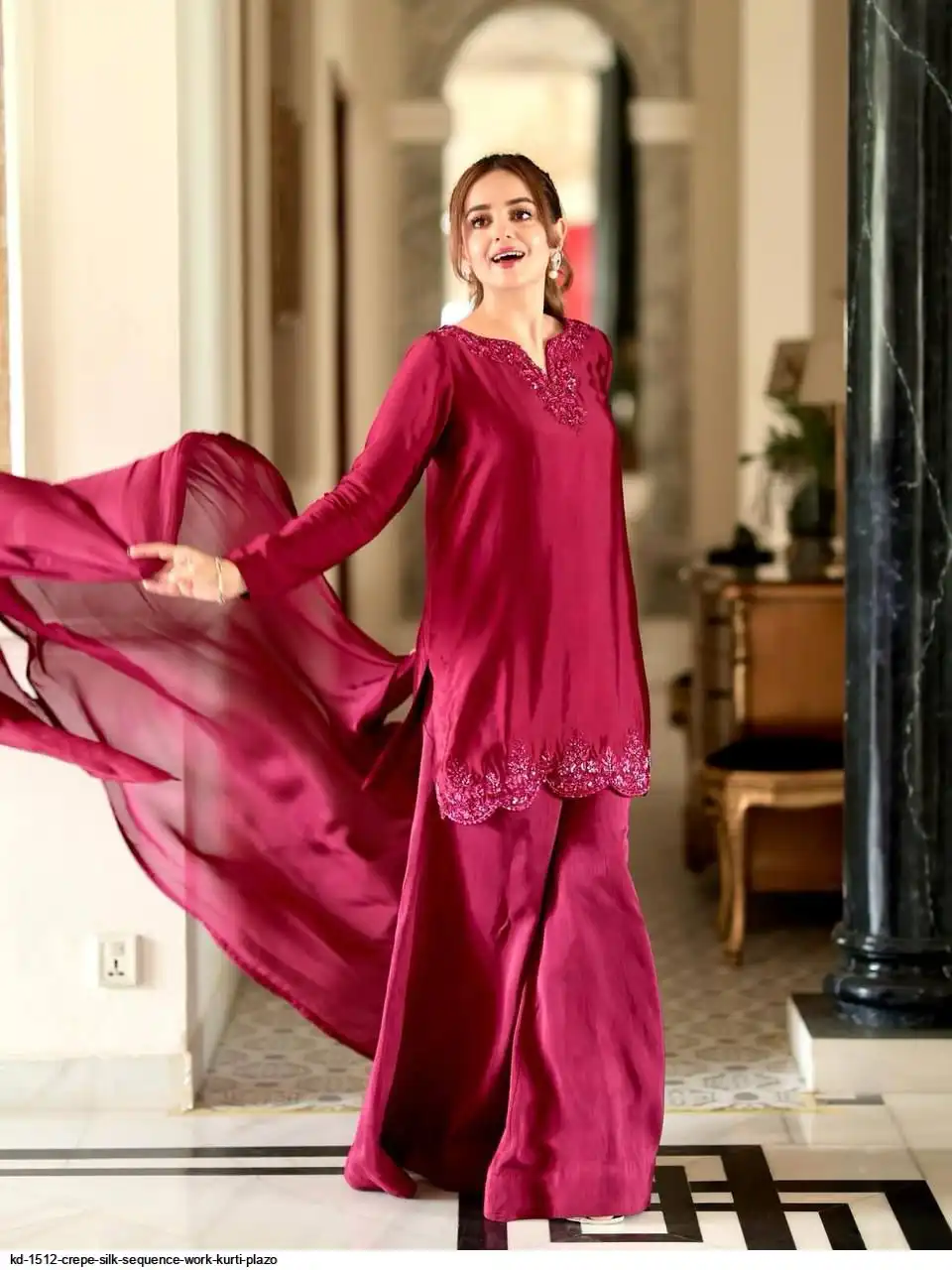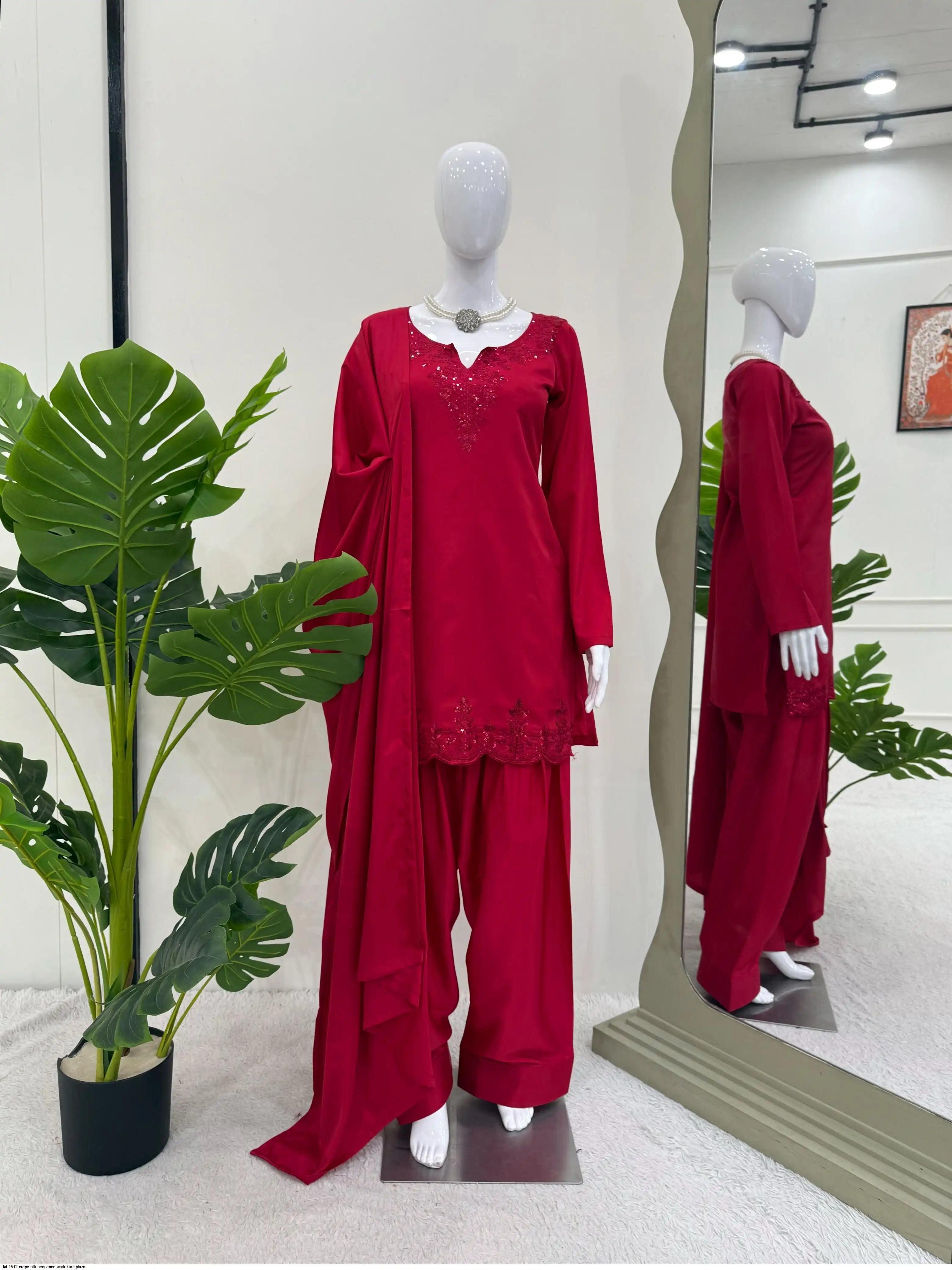 Looking for this same colour beautiful Designer Suit on Natural Crep Silk febric With Inner and Thred & Sequnce work Farshi Plazoo On also Natural Crep Silk Febric and Dupatta on Also Natural Crep febric.