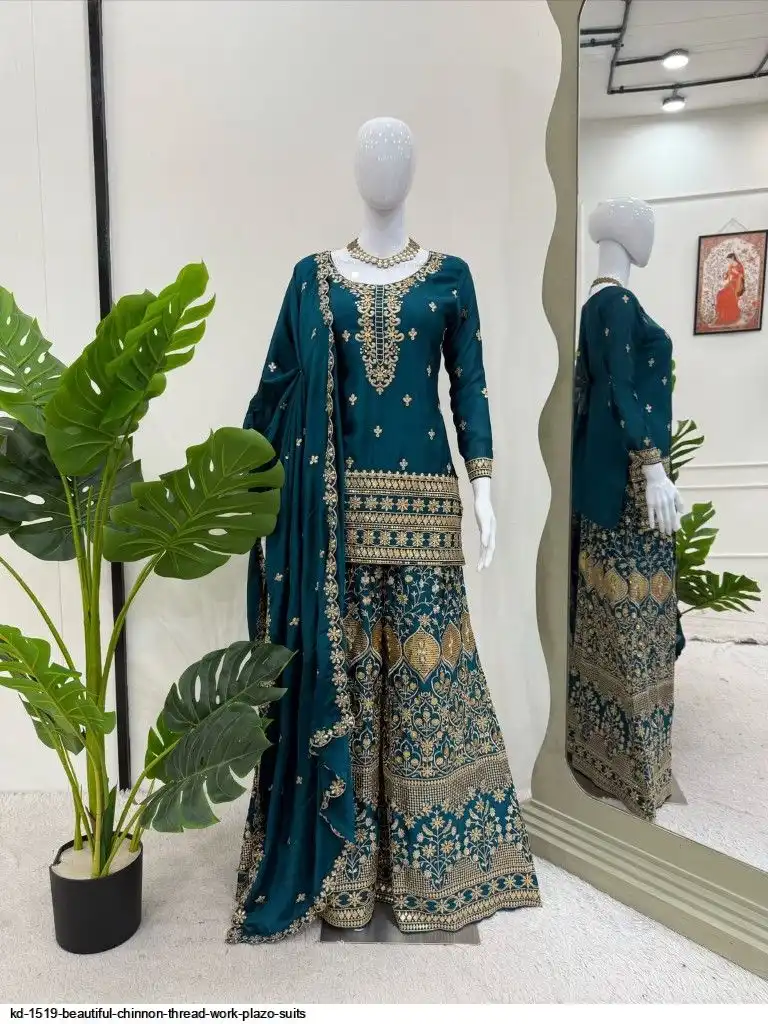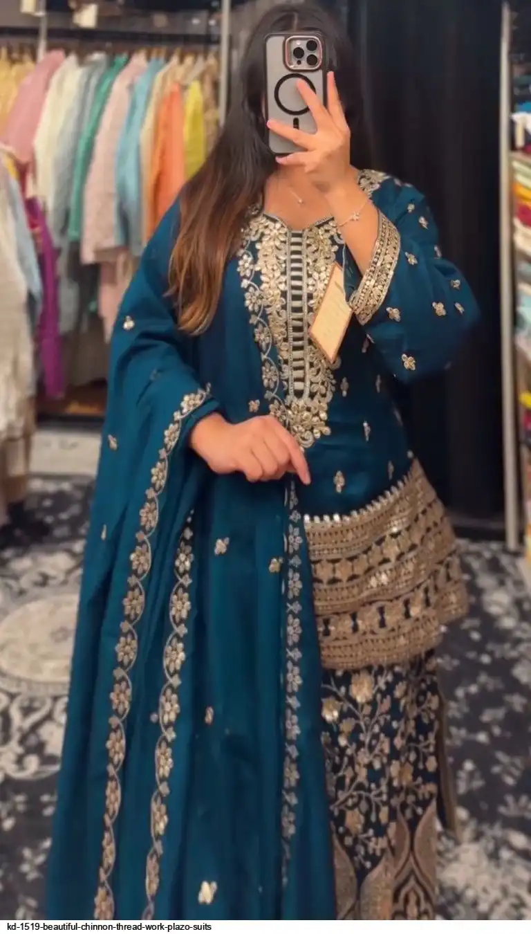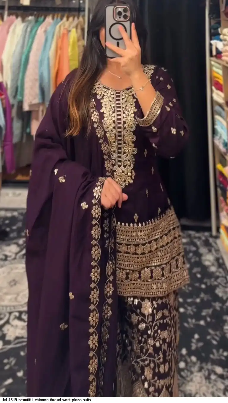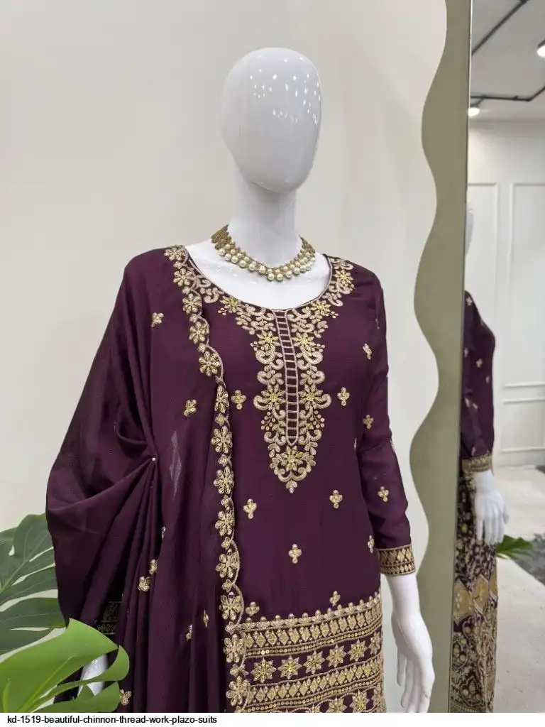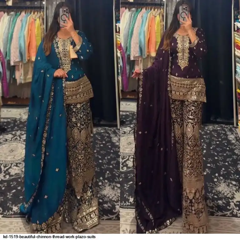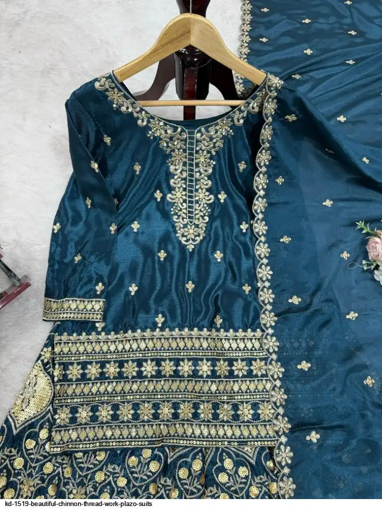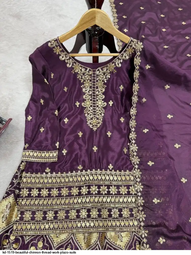 Looking for this same colour beautiful Designer Suit on Chinon Silk febric With Thred & Sequnce work and Plazoo On also Chinon Silk Febric With Thred & Sequnce work Dupatta on also Chinon Silk Febric with Thred & Sequnce work.
