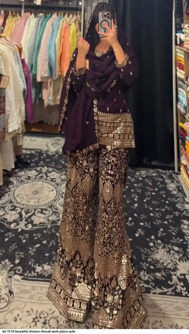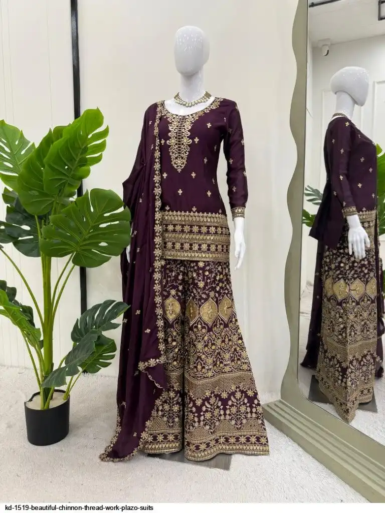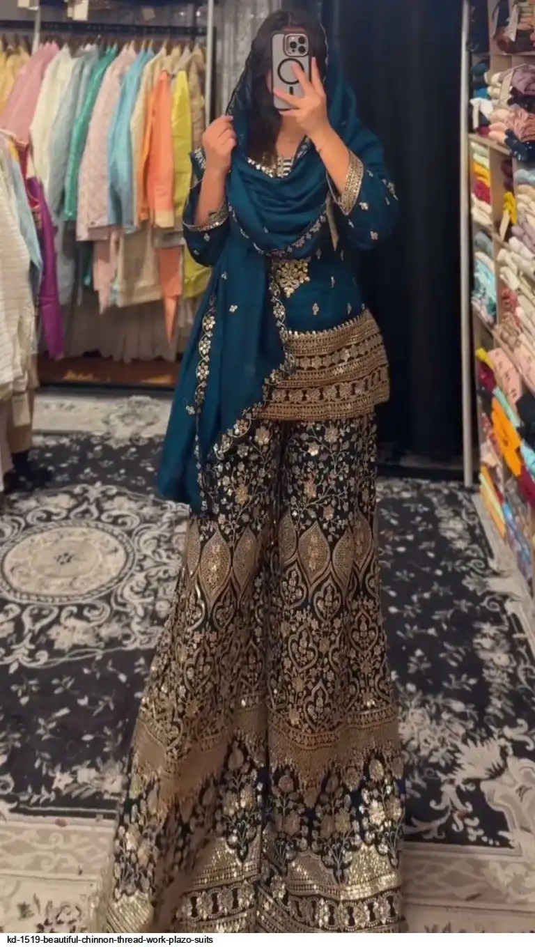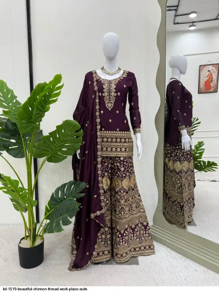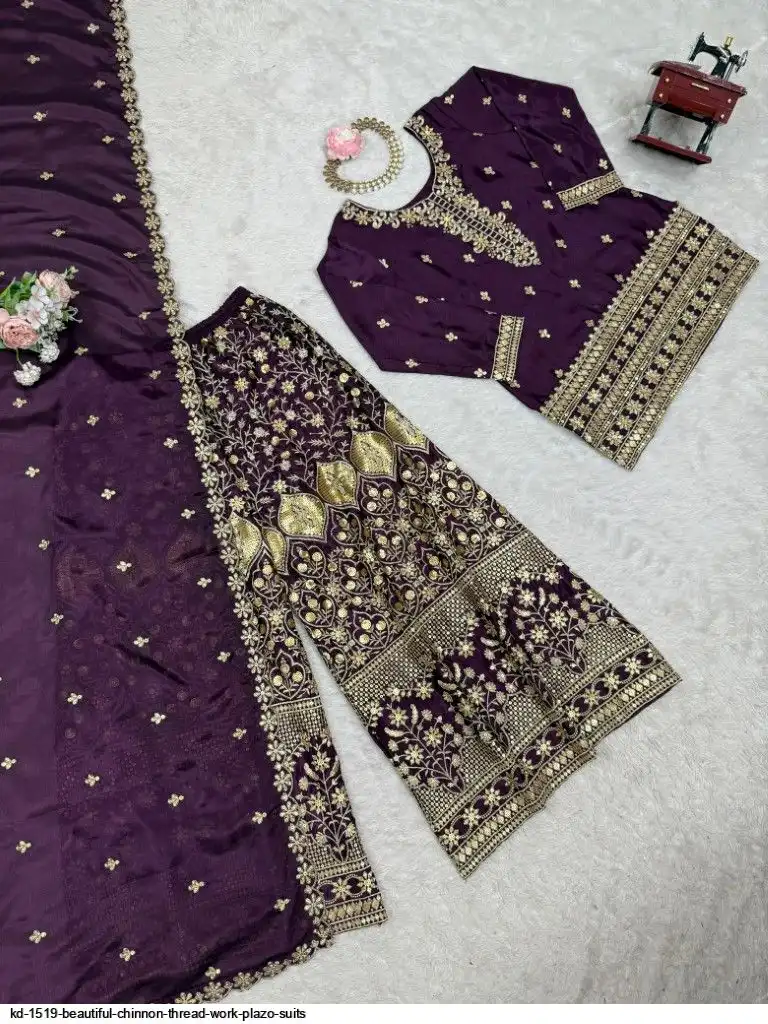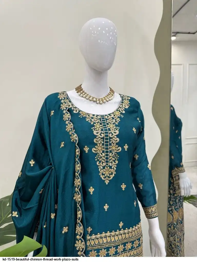 Looking for this same colour beautiful Designer Suit on Chinon Silk febric With Thred & Sequnce work and Plazoo On also Chinon Silk Febric With Thred & Sequnce work Dupatta on also Chinon Silk Febric with Thred & Sequnce work.