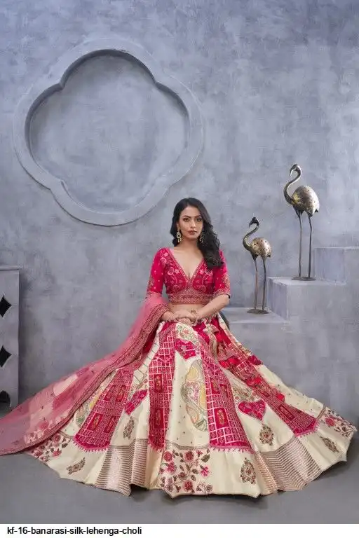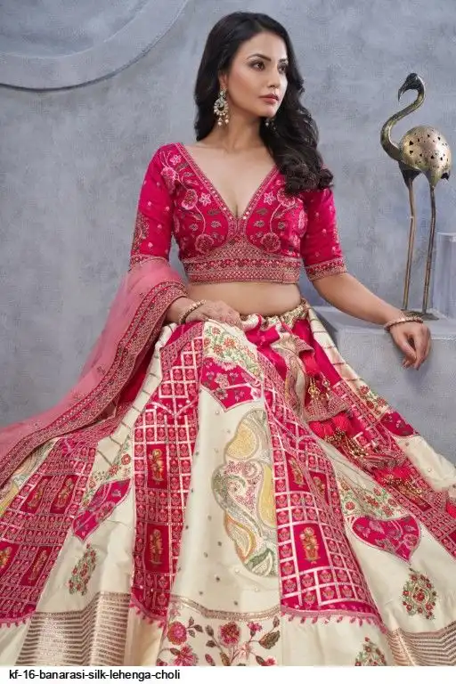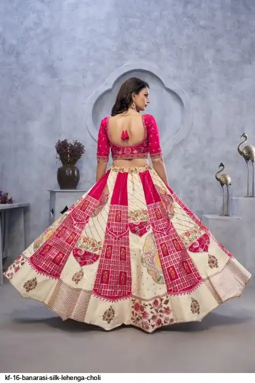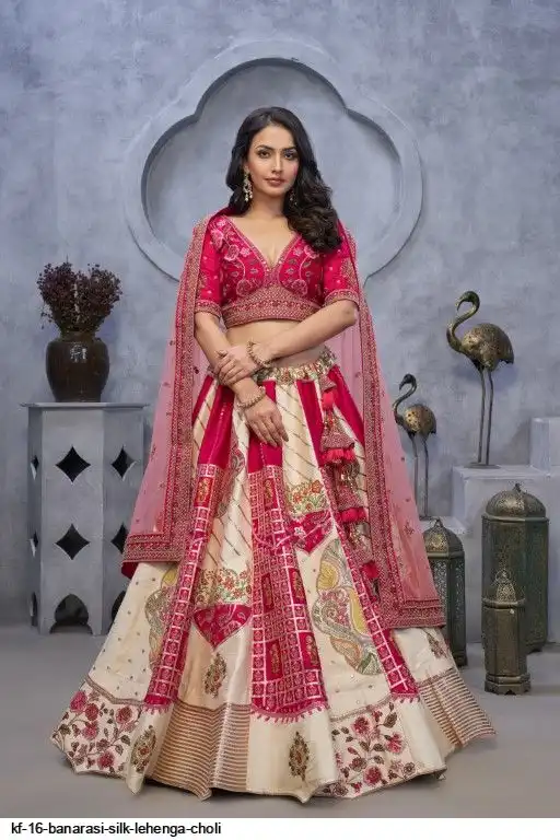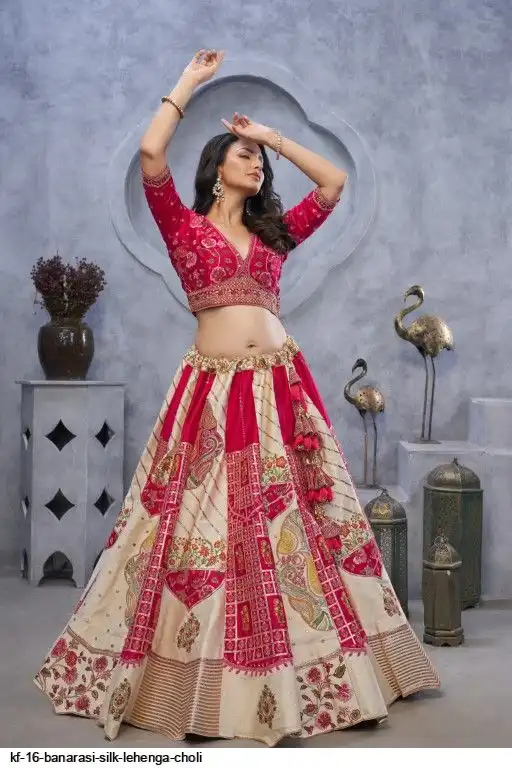 Lehenga: Banarasi silk, Waist up to 42 inch, Length 42 inch, Flair 4 meter