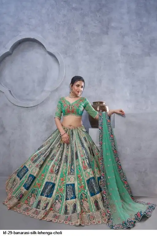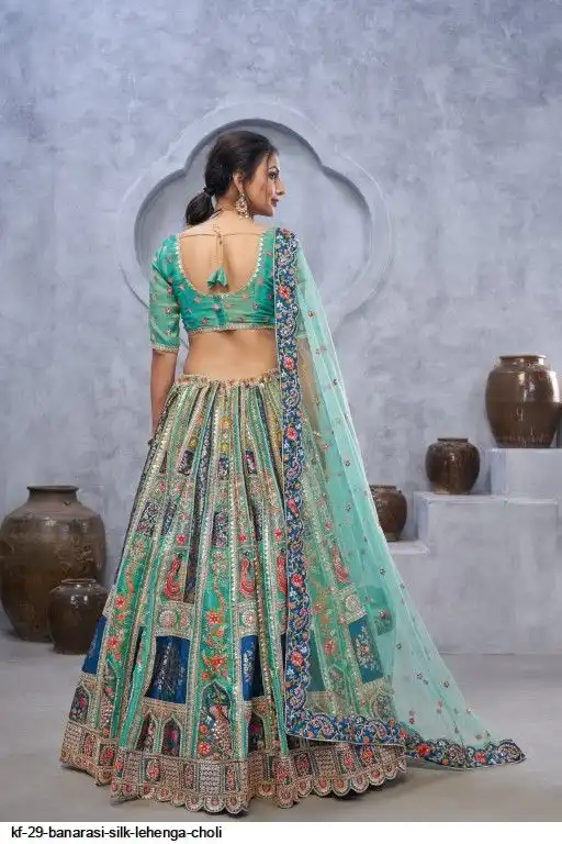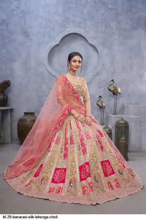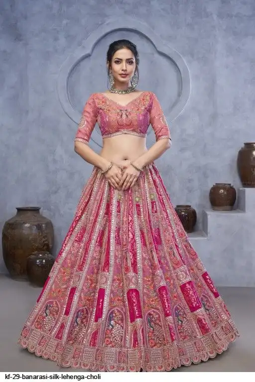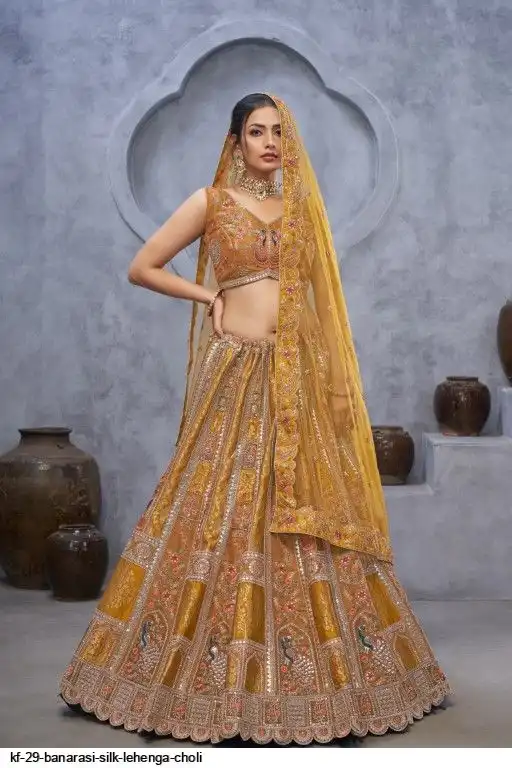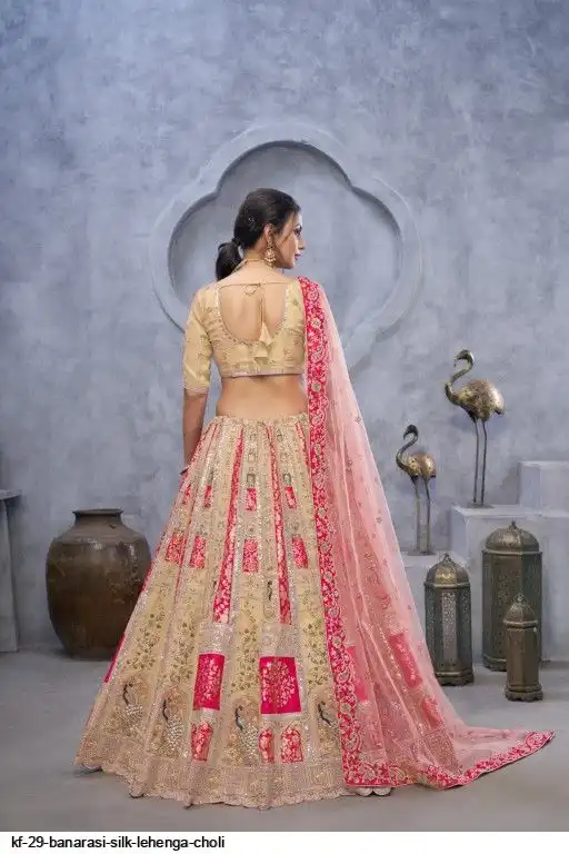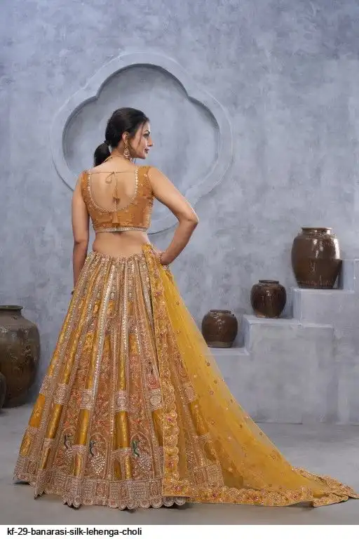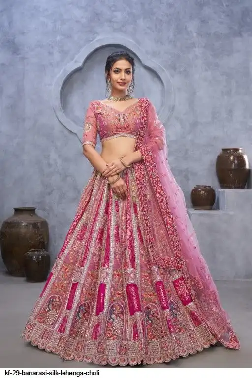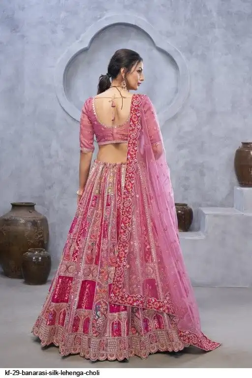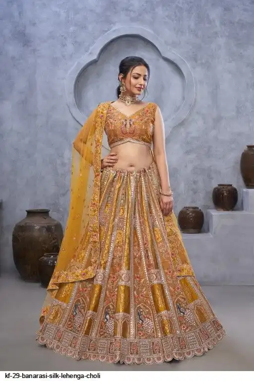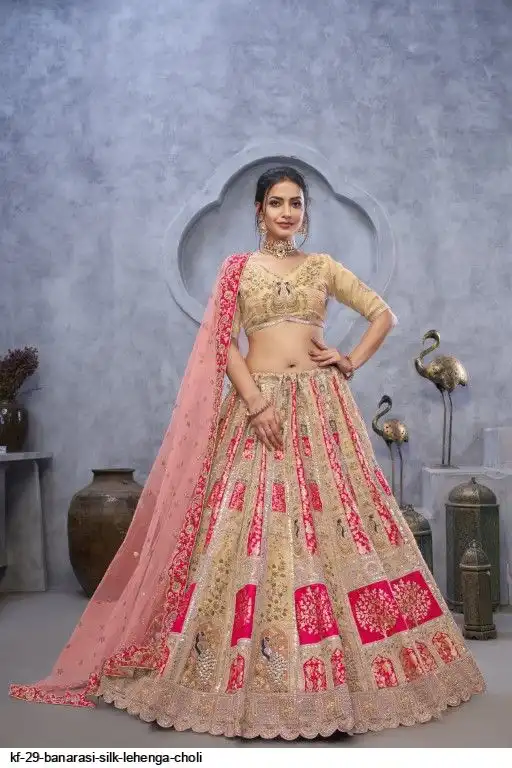 Lehenga: Banarasi silk, Waist up to 42 inch, Length 42 inch, Flair 4 meter